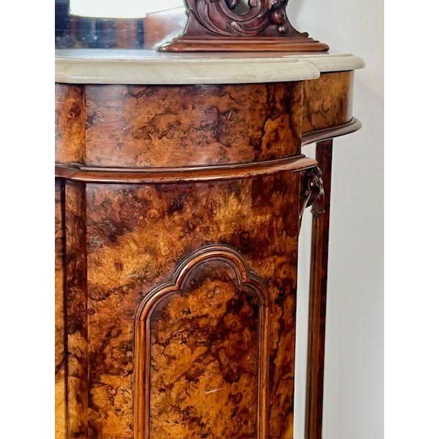 The base section has a wide central door and side angled doors. All doors have mirrored panels and raised moldings with quality decorative crest carvings. Within the cupboards there is a full width shelf. Between the doors are curved blind panels also with raised and nicely profiled moldings. All supported on a plynth base shaped to compliment the shape of the marble and the cabinet.