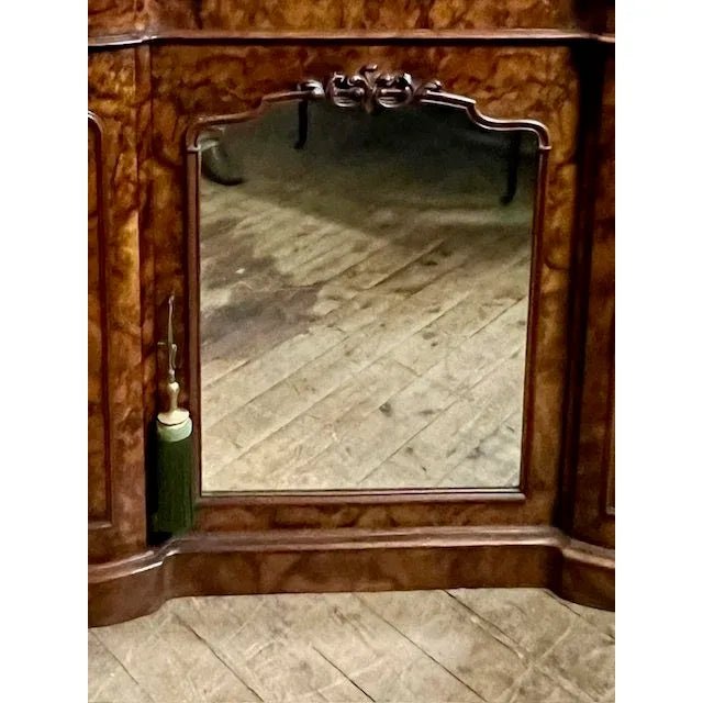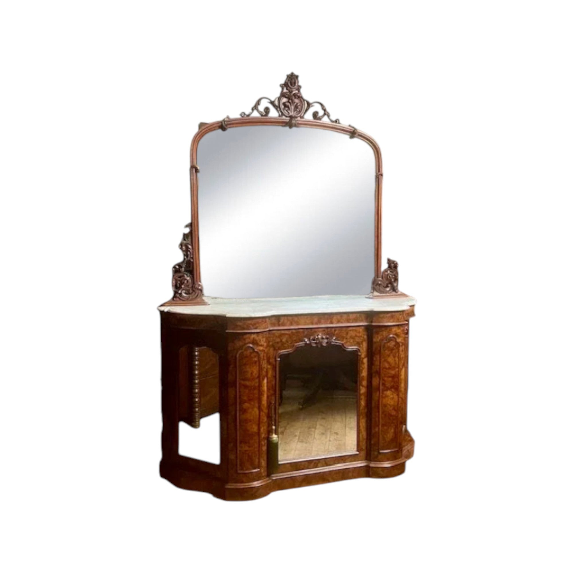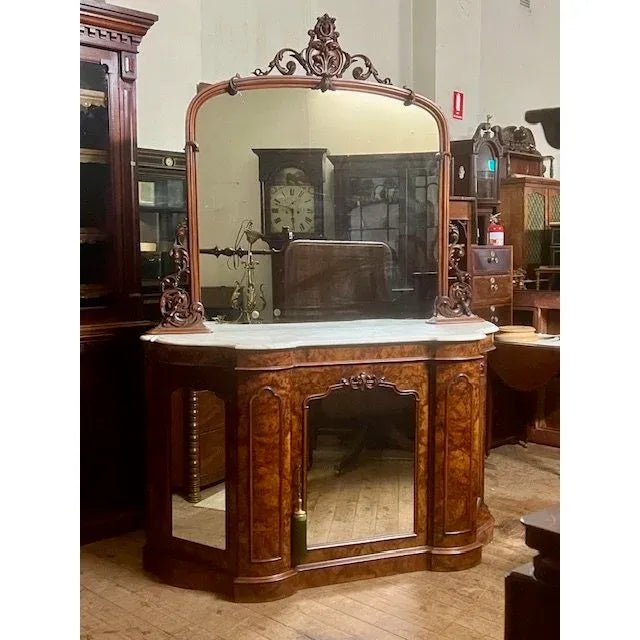 This is a fine ( excellent ) quality example of a genuine antique English mid Victorian period circa 1860 Mirror back Marble top Walnut Credenza with a strong French Louis XV Rococo influence.
