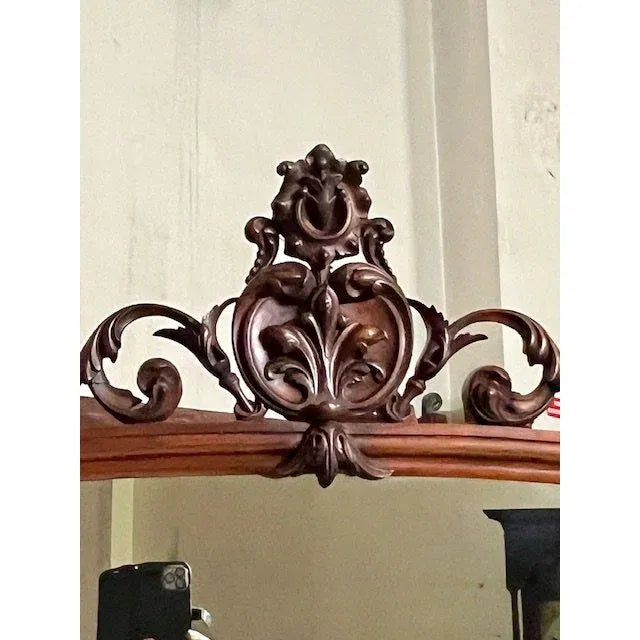 The tall and elegant solid Walnut show timber frame contains the original mirrored plate and is embellished with an impressive crest carving of stylised folage in the French ‘C’ shapes. At either side of the base of the mirror frame are in a triangular formation flowing fully saw pierced carved ‘C’ and ‘S’ shaped scrolling carved leaves.