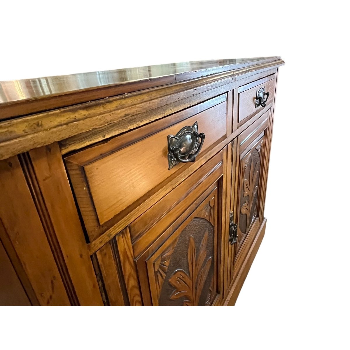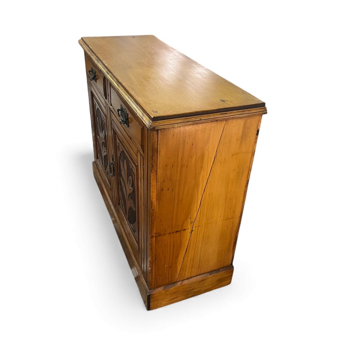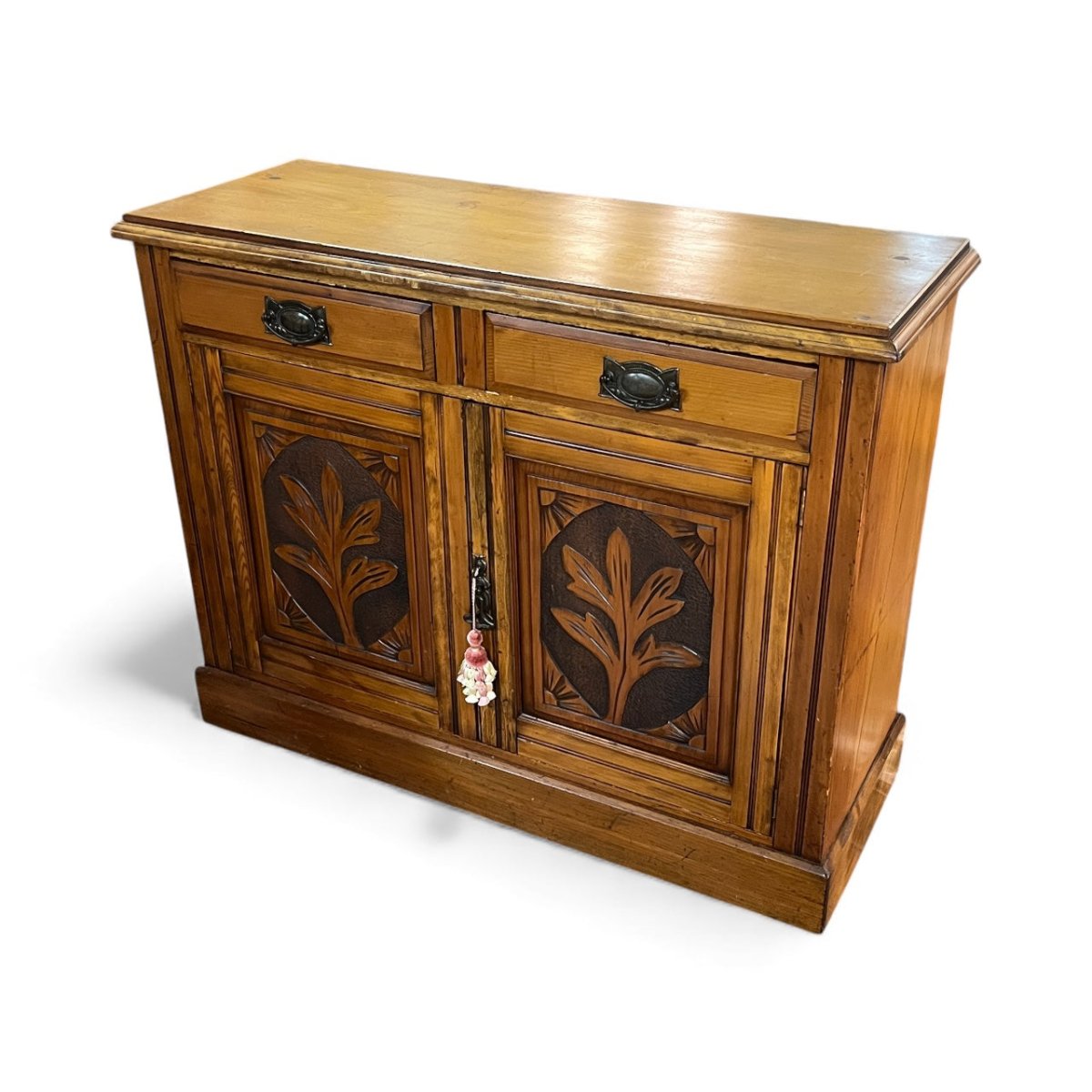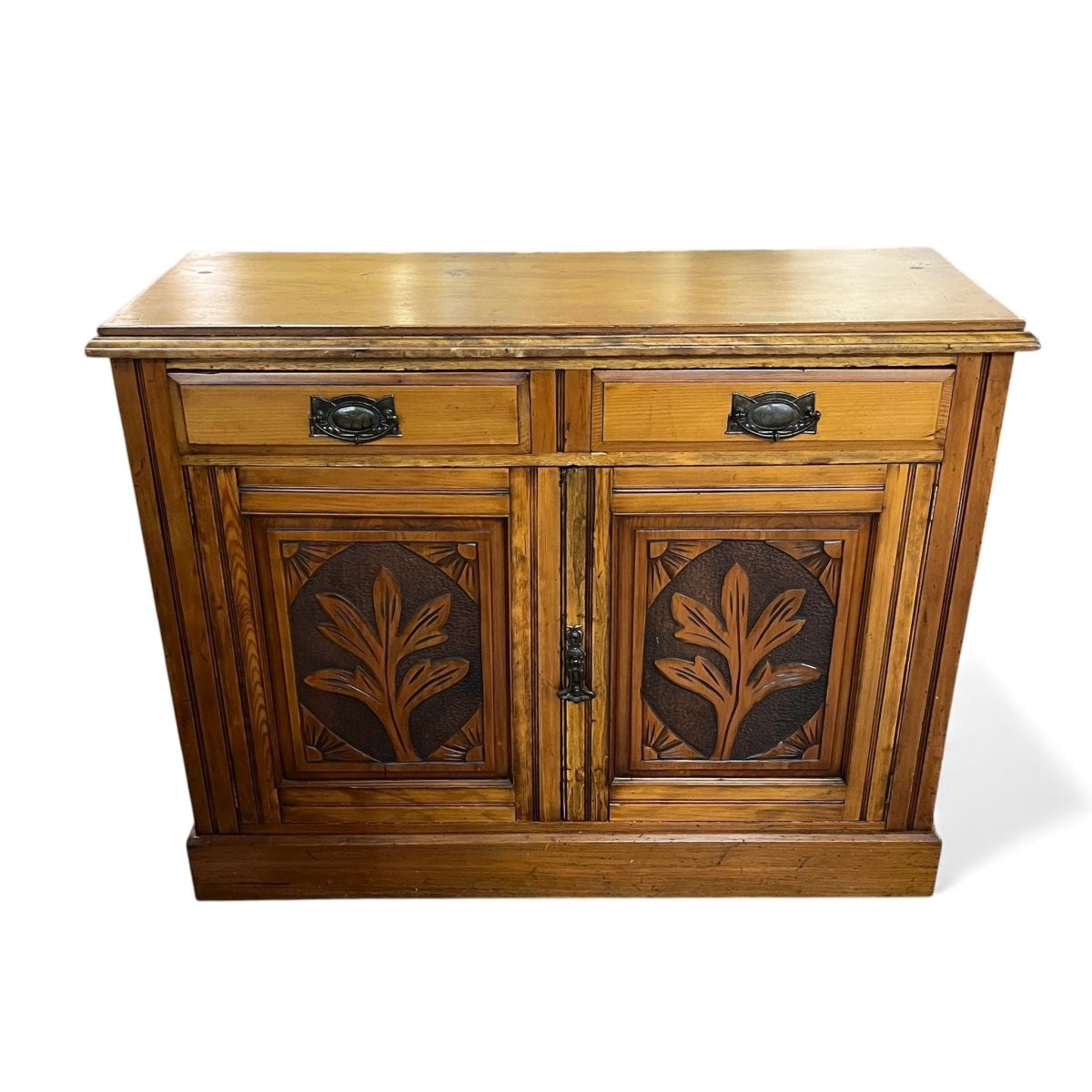 Antique pine carved side cabinet Victorian 2 drawer 2 door 1900's ENGLAND. Solid Pine. 2 drawer and 2 door side cabinet. Dovetail joinery. Cast steel pull handles. Carved door panels. Leaf motif, likely oak. Rectangular with platform base. Freestanding. Honey. Stained finish. Lockable (comes with original key). Made in England in the late 1900s. Sourced within the Mornington Peninsula.