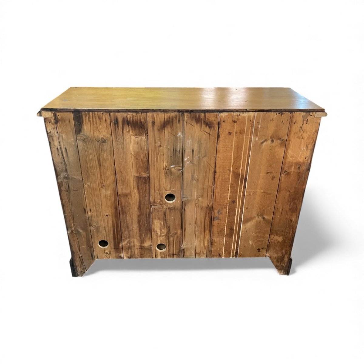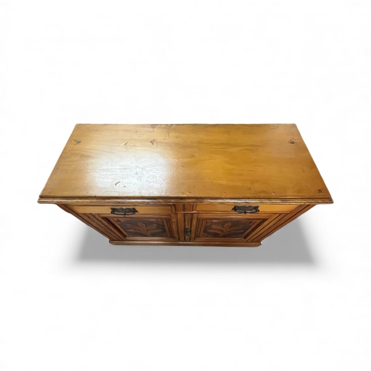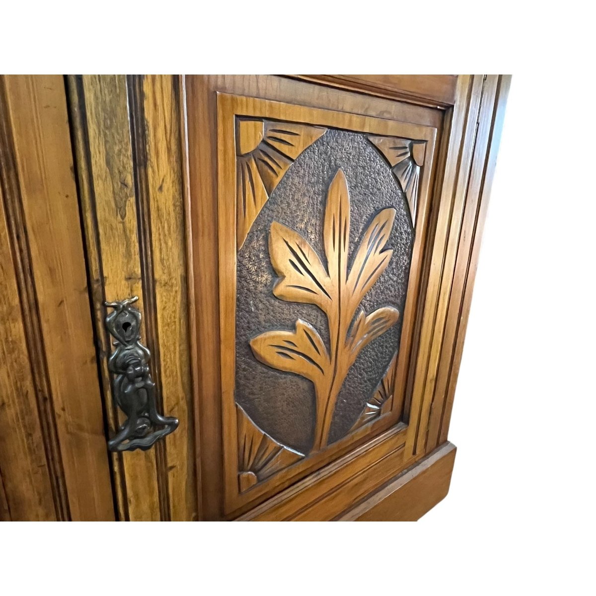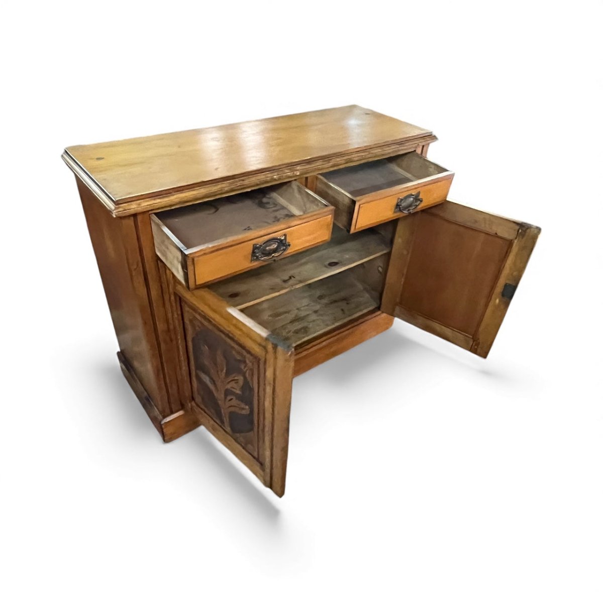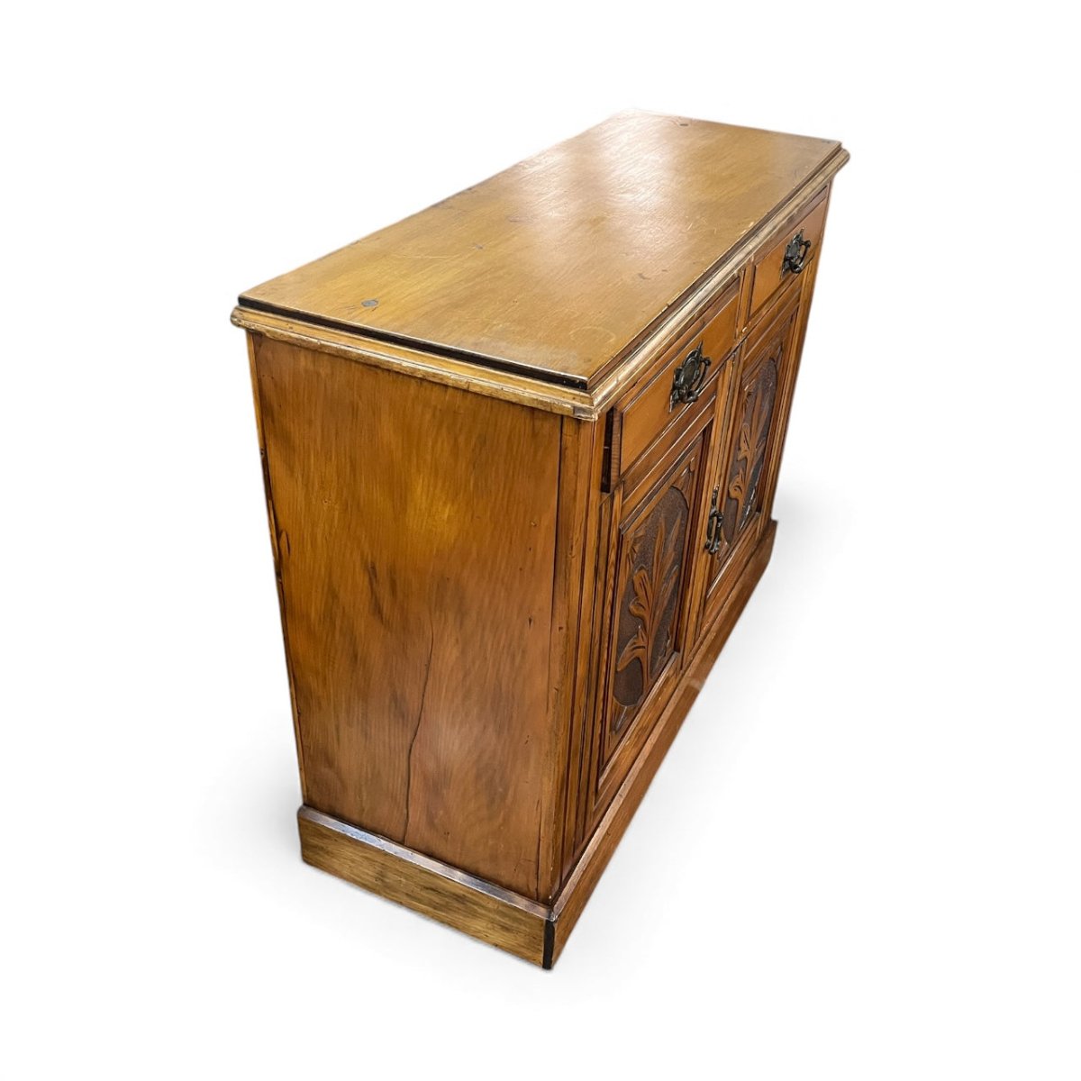 Antique pine carved side cabinet Victorian 2 drawer 2 door 1900's ENGLAND. Solid Pine. 2 drawer and 2 door side cabinet. Dovetail joinery. Cast steel pull handles. Carved door panels. Leaf motif, likely oak. Rectangular with platform base. Freestanding. Honey. Stained finish. Lockable (comes with original key). Made in England in the late 1900s. Sourced within the Mornington Peninsula.