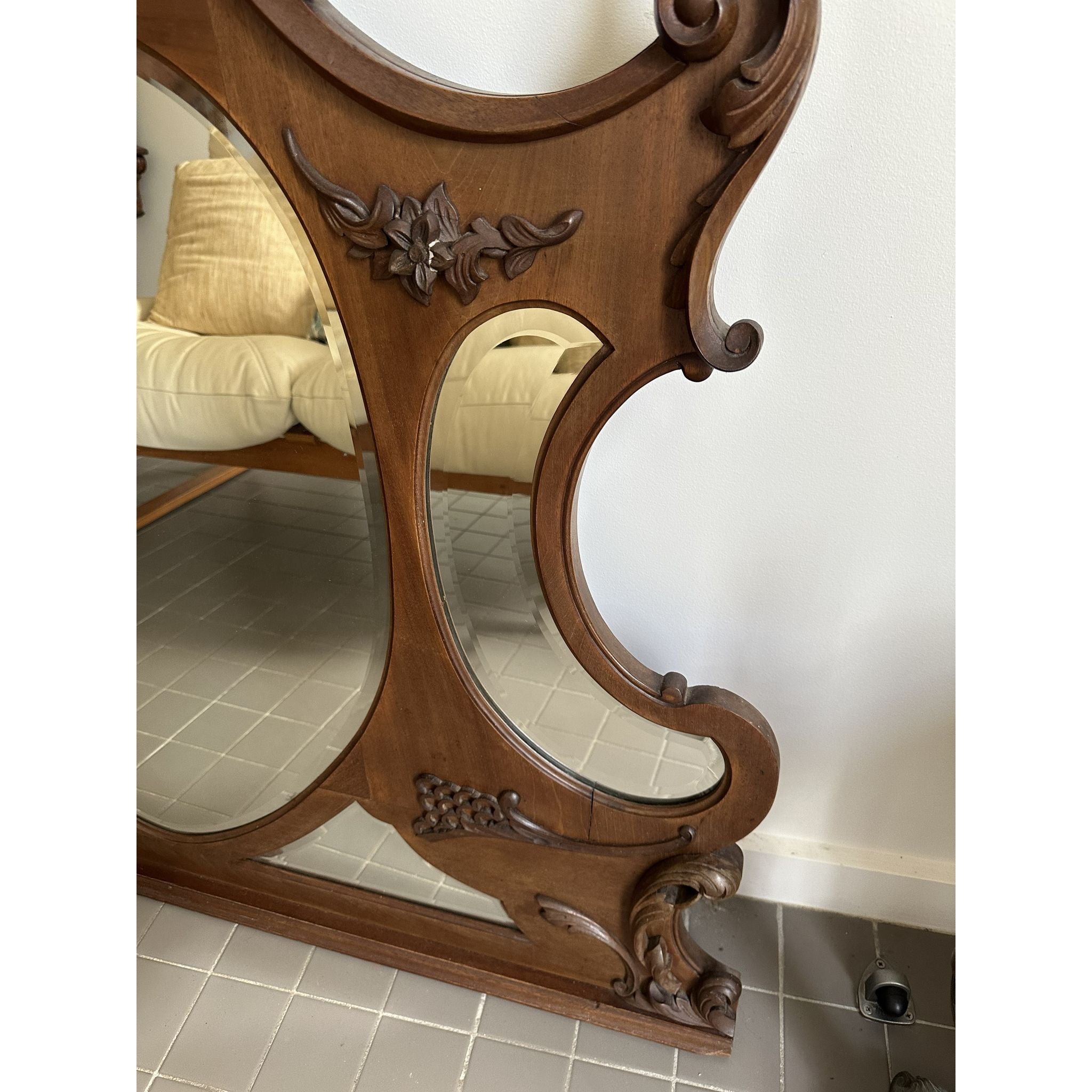 For sale is a stunning, authentic Victorian-era mirror featuring exceptional hand-carved details. This piece boasts a classic "harped" silhouette with an ornate central crest and delicate floral scrollwork typical of late 19th-century craftsmanship.
