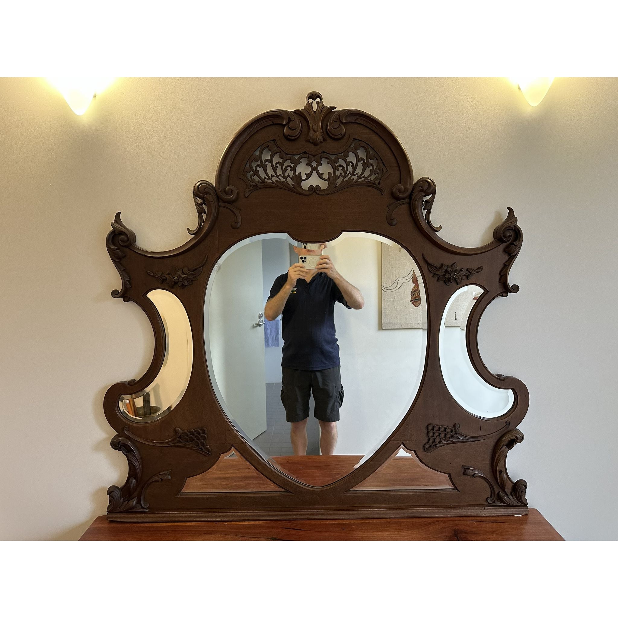- Versatility: Originally part of a grand dresser, it has been professionally prepared for use as a striking wall-mounted overmantel mirror or entryway statement piece.