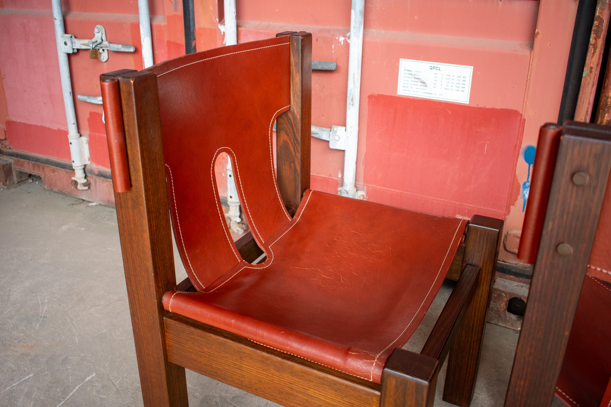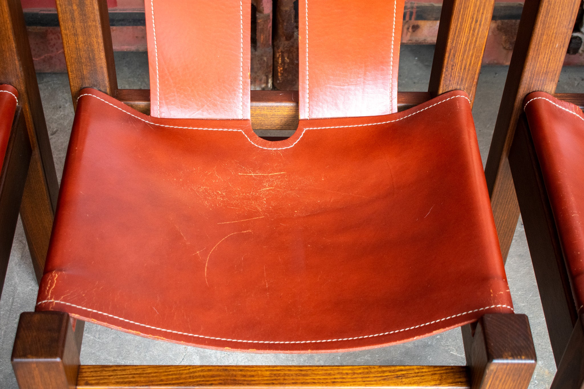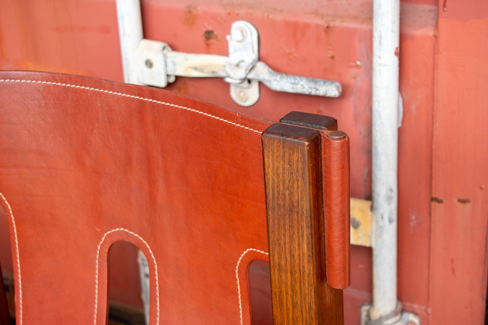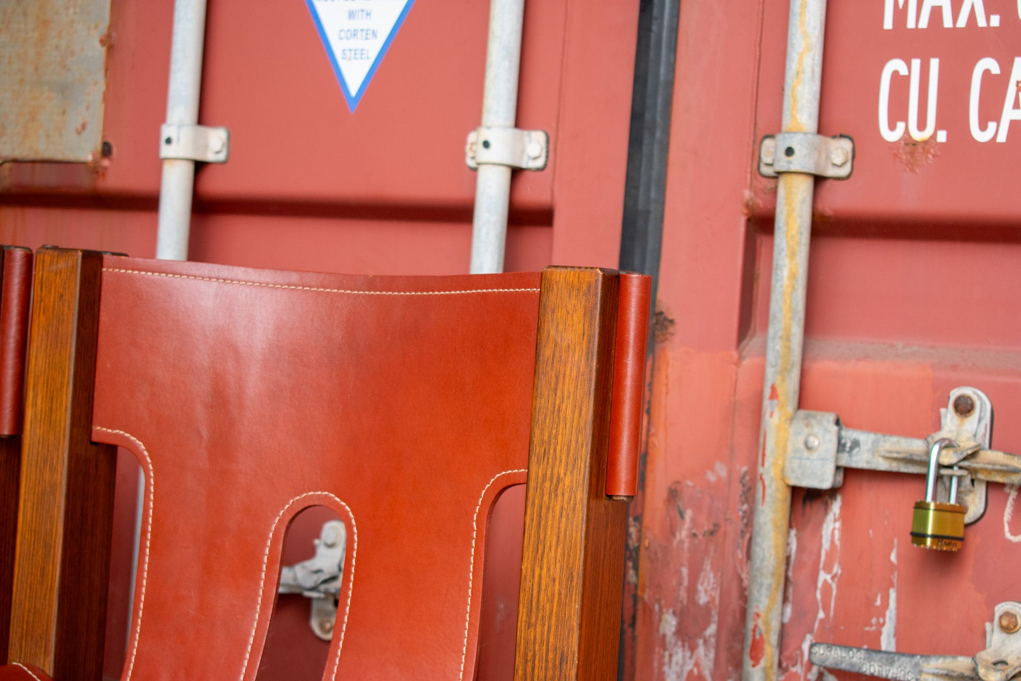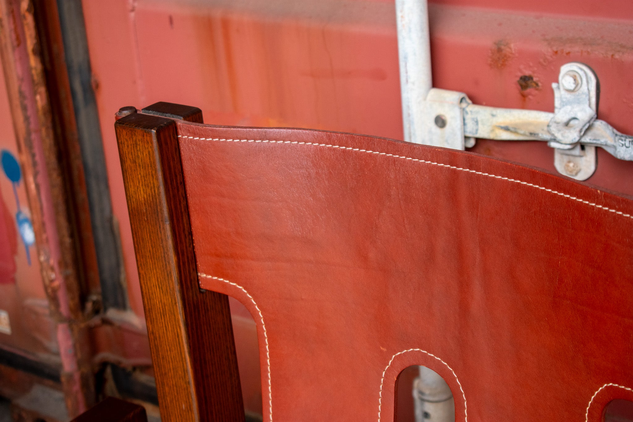 Set of four Matilda dining chairs designed by Gerald Easden. Crafted in Victorian ash with conker leather upholstery, these chairs showcase Easden’s rare Australian modernist design language. The frames have been checked and re-glued where required, ensuring stability and longevity. Upholstery shows some wear in the form of scratches and light cracking, but the leather remains strong and supple.