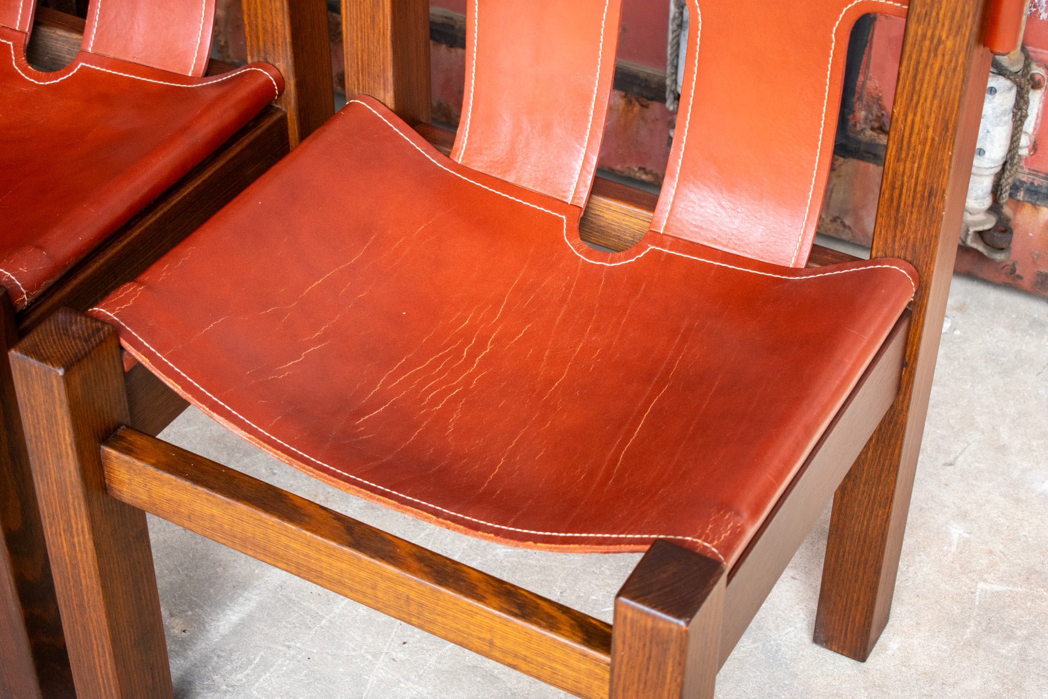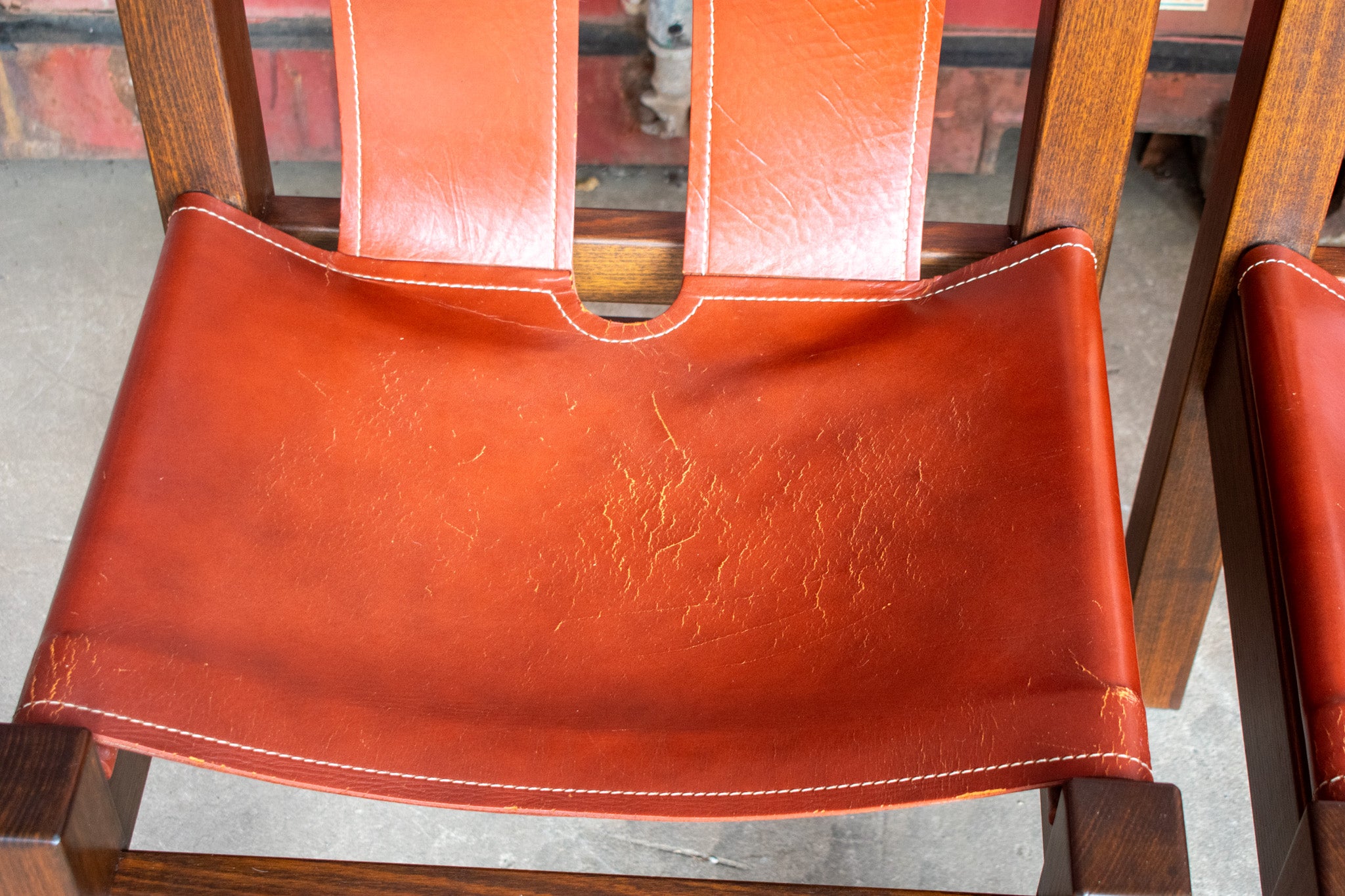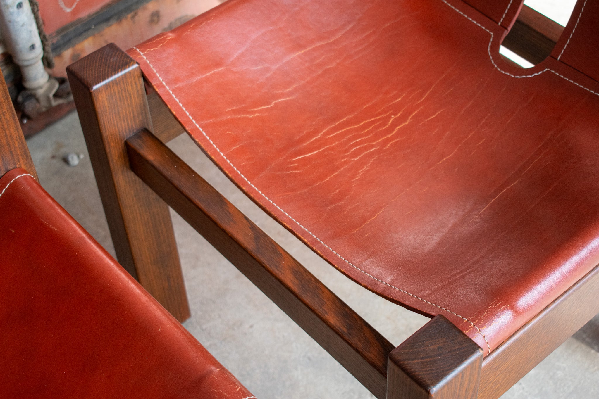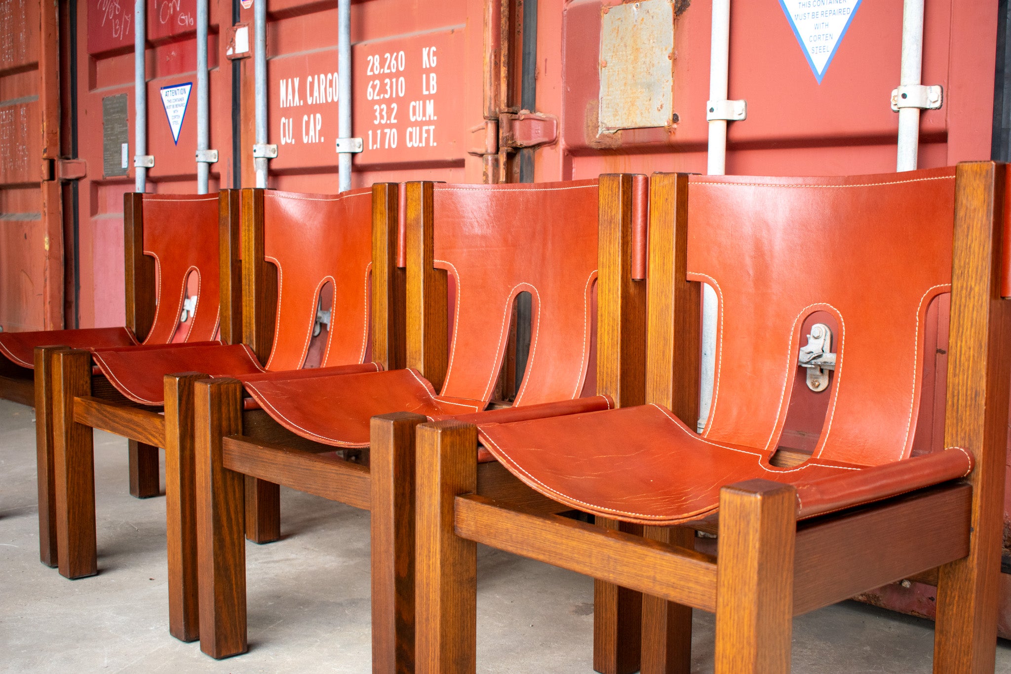 Set of four Matilda dining chairs designed by Gerald Easden. Crafted in Victorian ash with conker leather upholstery, these chairs showcase Easden’s rare Australian modernist design language. The frames have been checked and re-glued where required, ensuring stability and longevity. Upholstery shows some wear in the form of scratches and light cracking, but the leather remains strong and supple.
