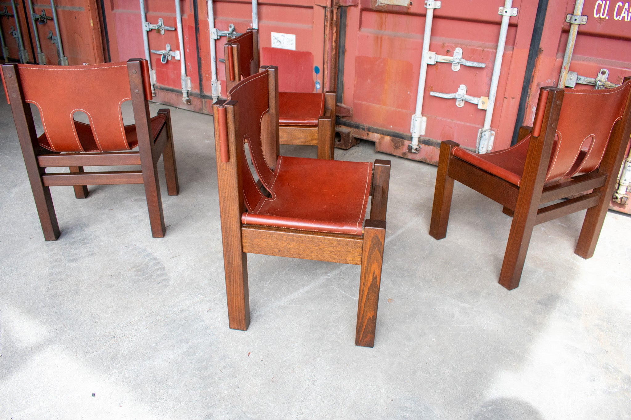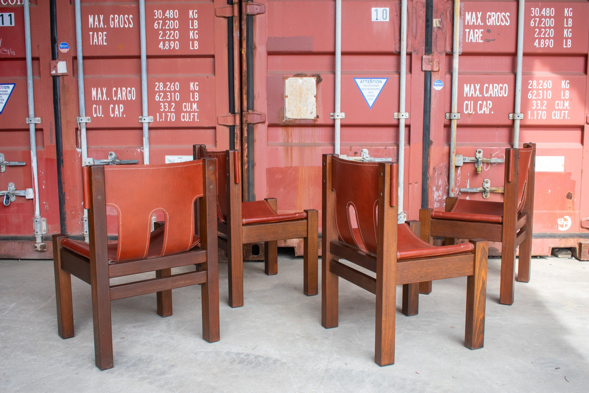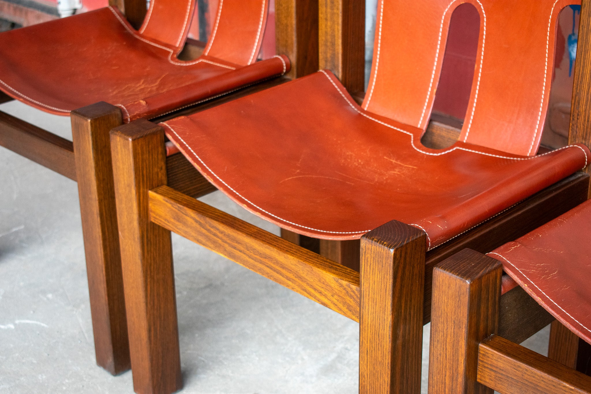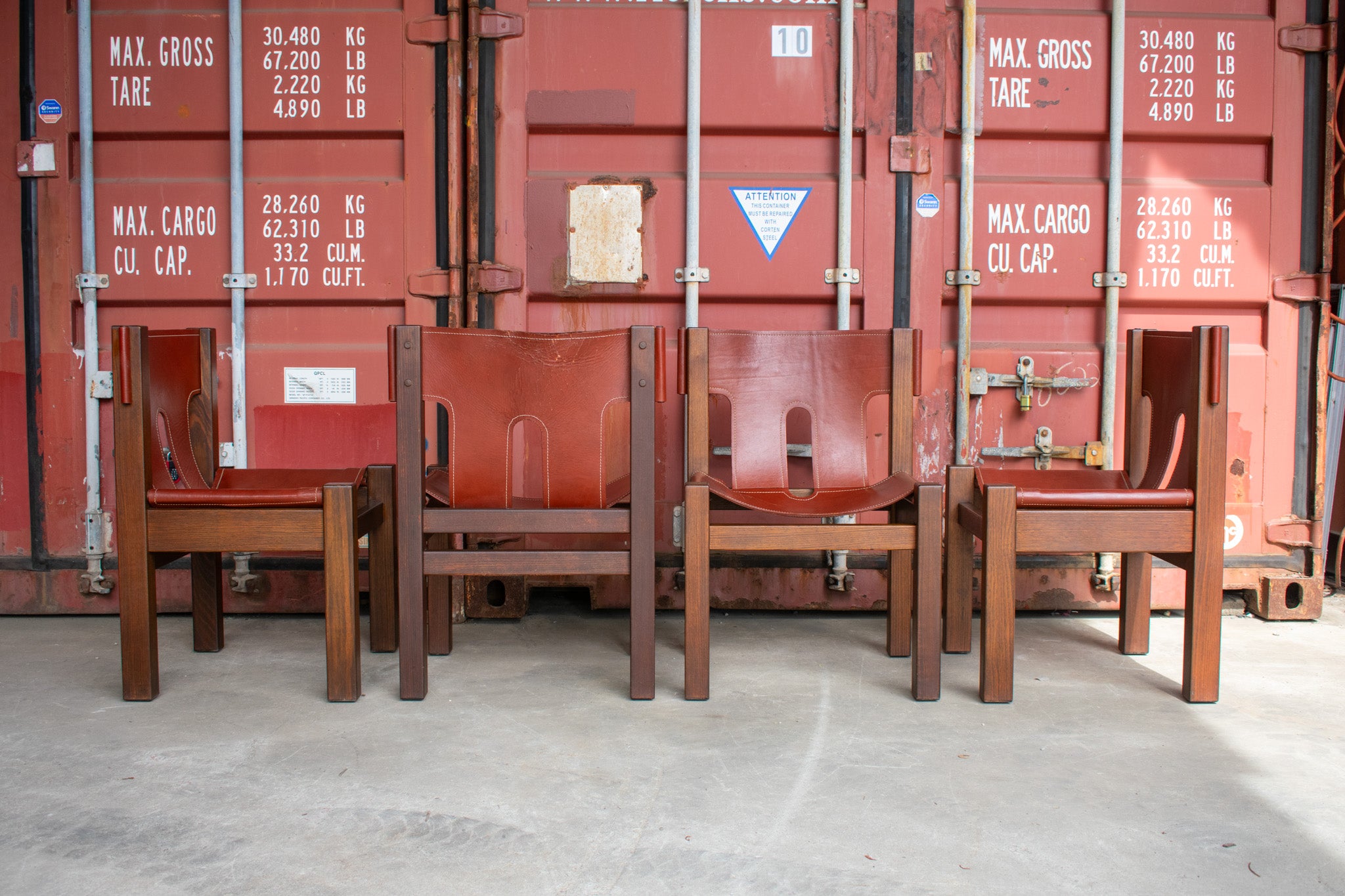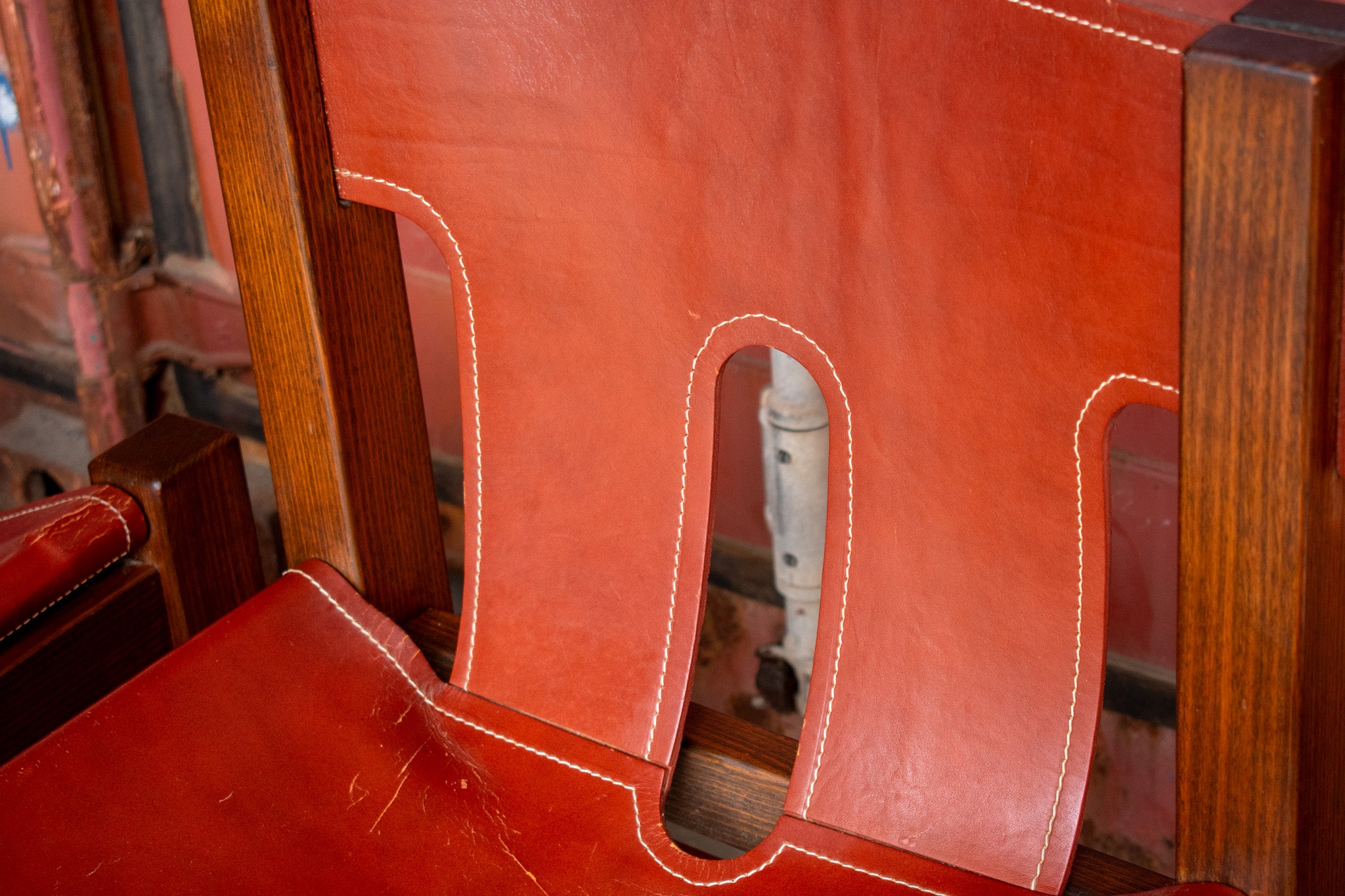Set of four Matilda dining chairs designed by Gerald Easden. Crafted in Victorian ash with conker leather upholstery, these chairs showcase Easden’s rare Australian modernist design language. The frames have been checked and re-glued where required, ensuring stability and longevity. Upholstery shows some wear in the form of scratches and light cracking, but the leather remains strong and supple.