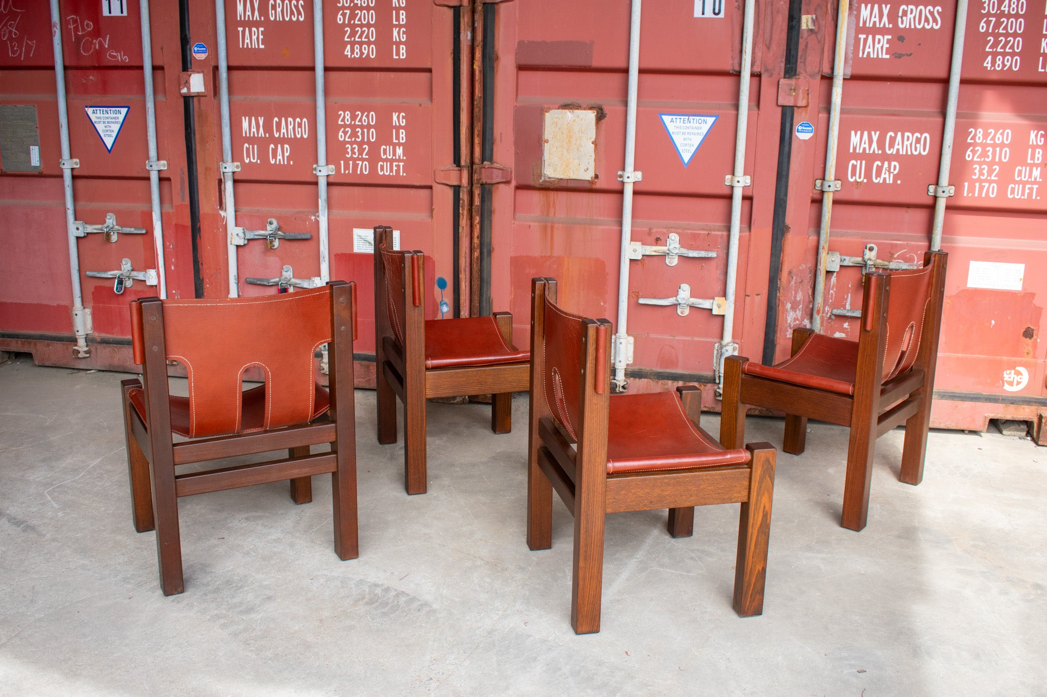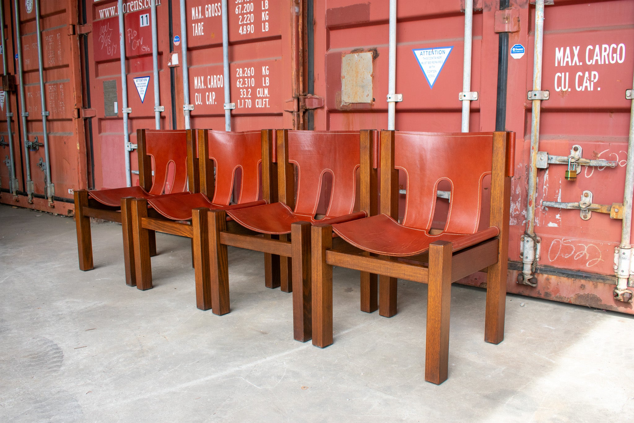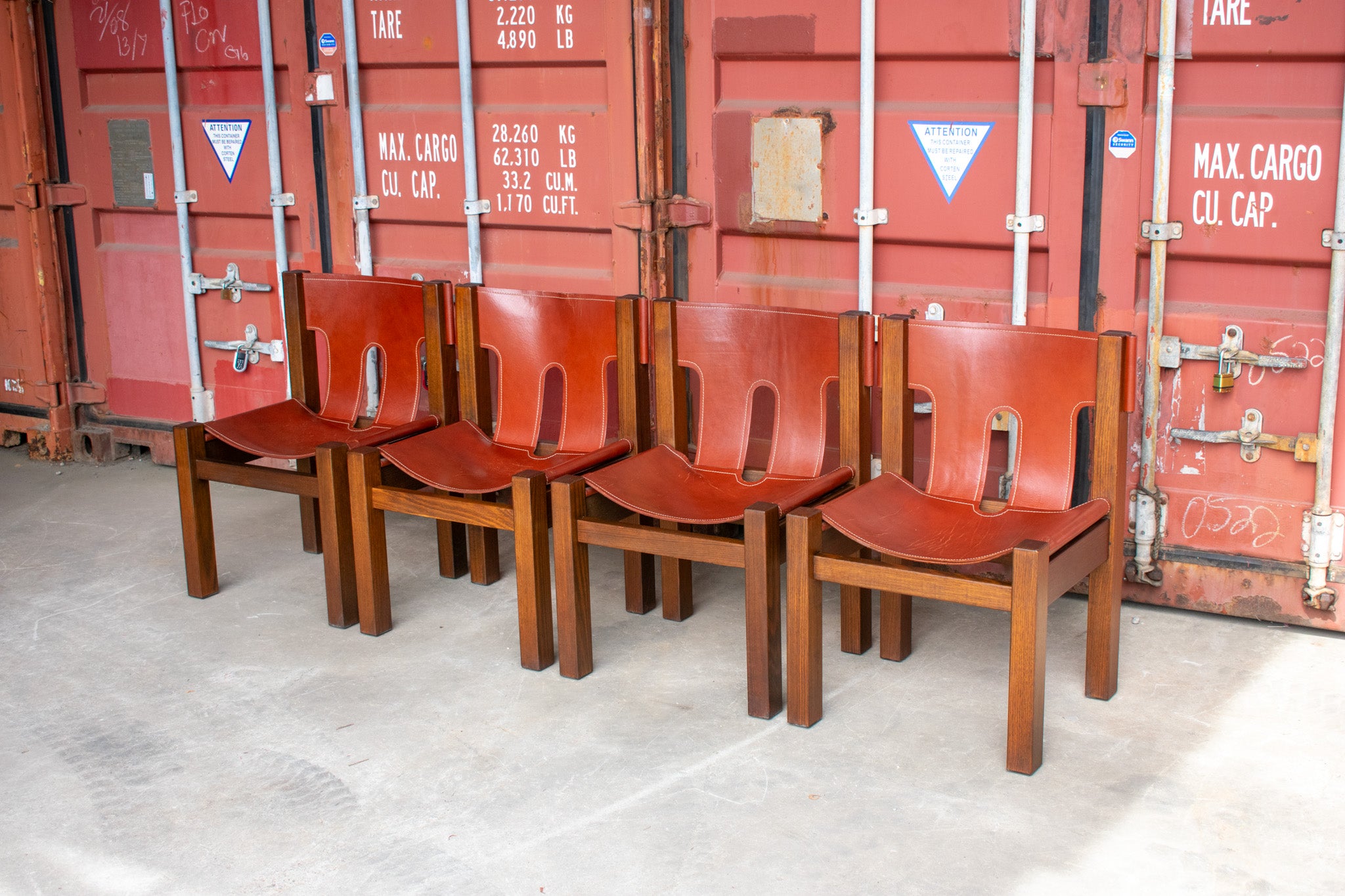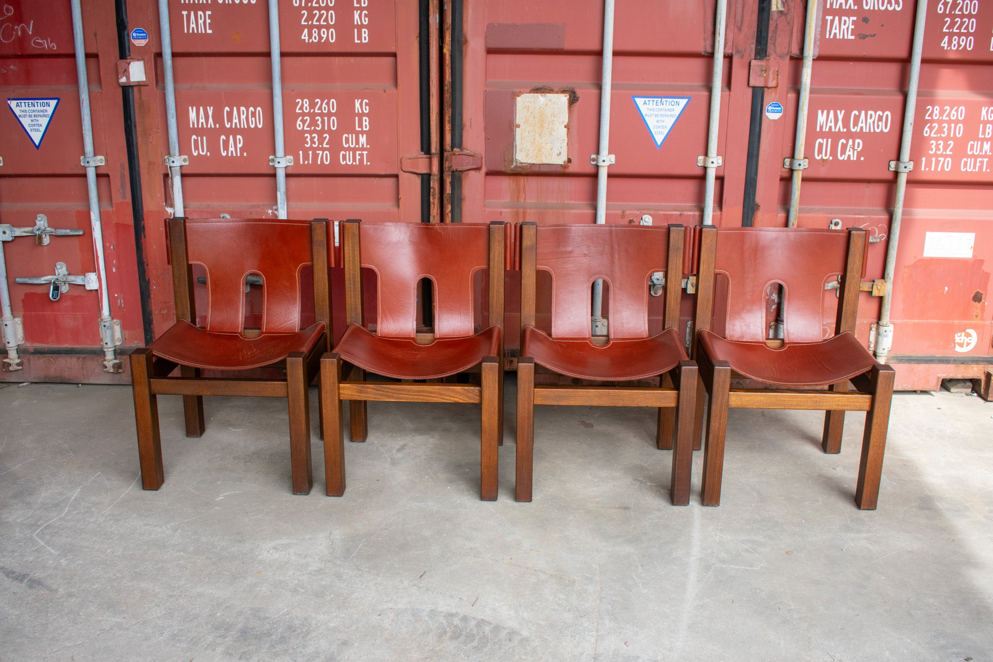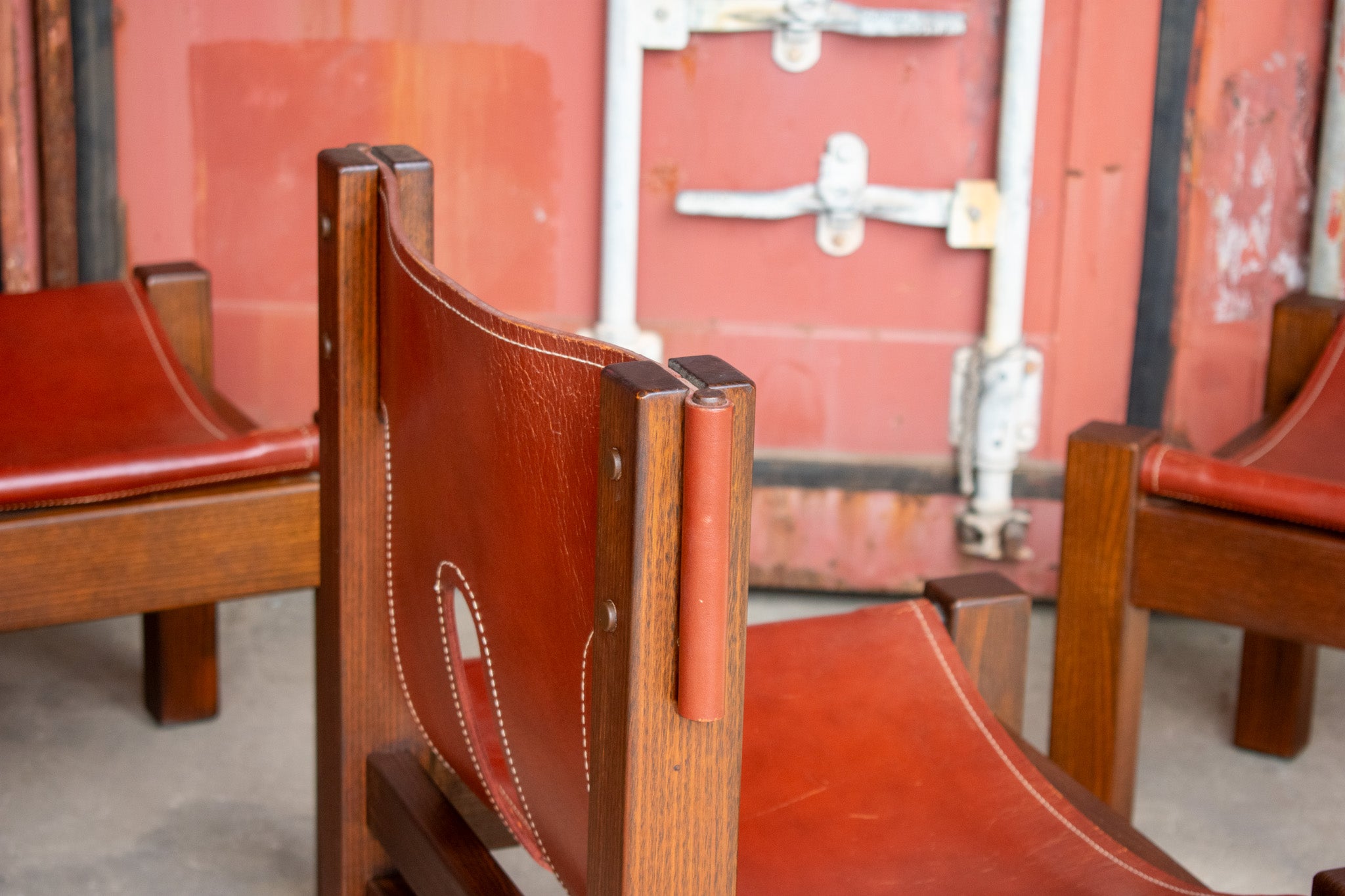 Set of four Matilda dining chairs designed by Gerald Easden. Crafted in Victorian ash with conker leather upholstery, these chairs showcase Easden’s rare Australian modernist design language. The frames have been checked and re-glued where required, ensuring stability and longevity. Upholstery shows some wear in the form of scratches and light cracking, but the leather remains strong and supple.