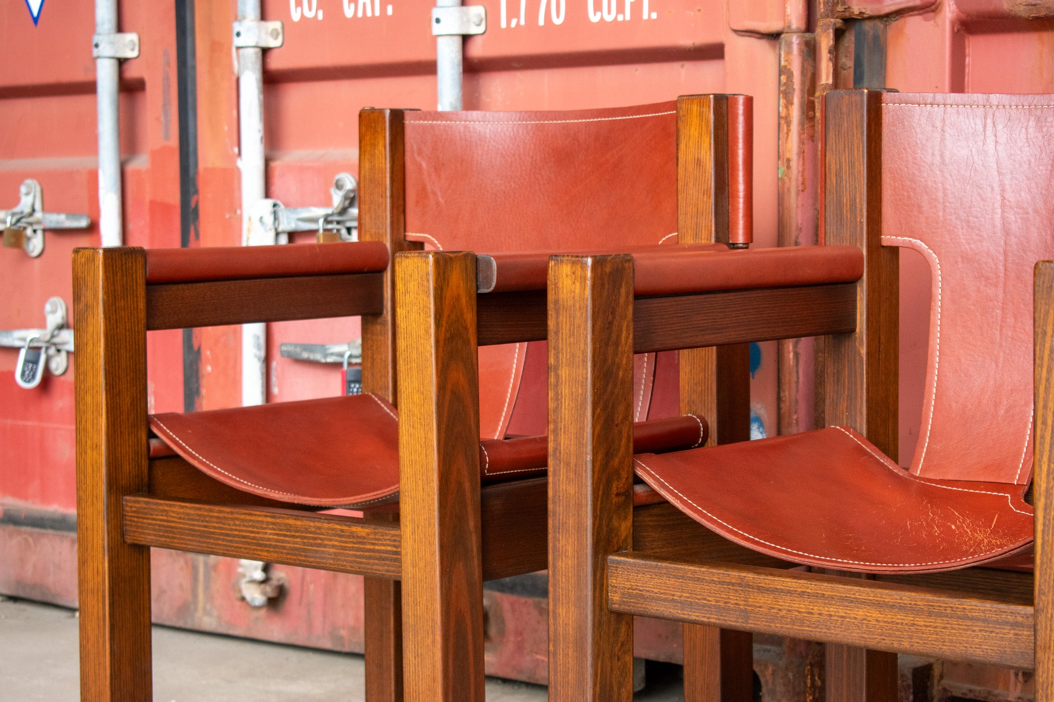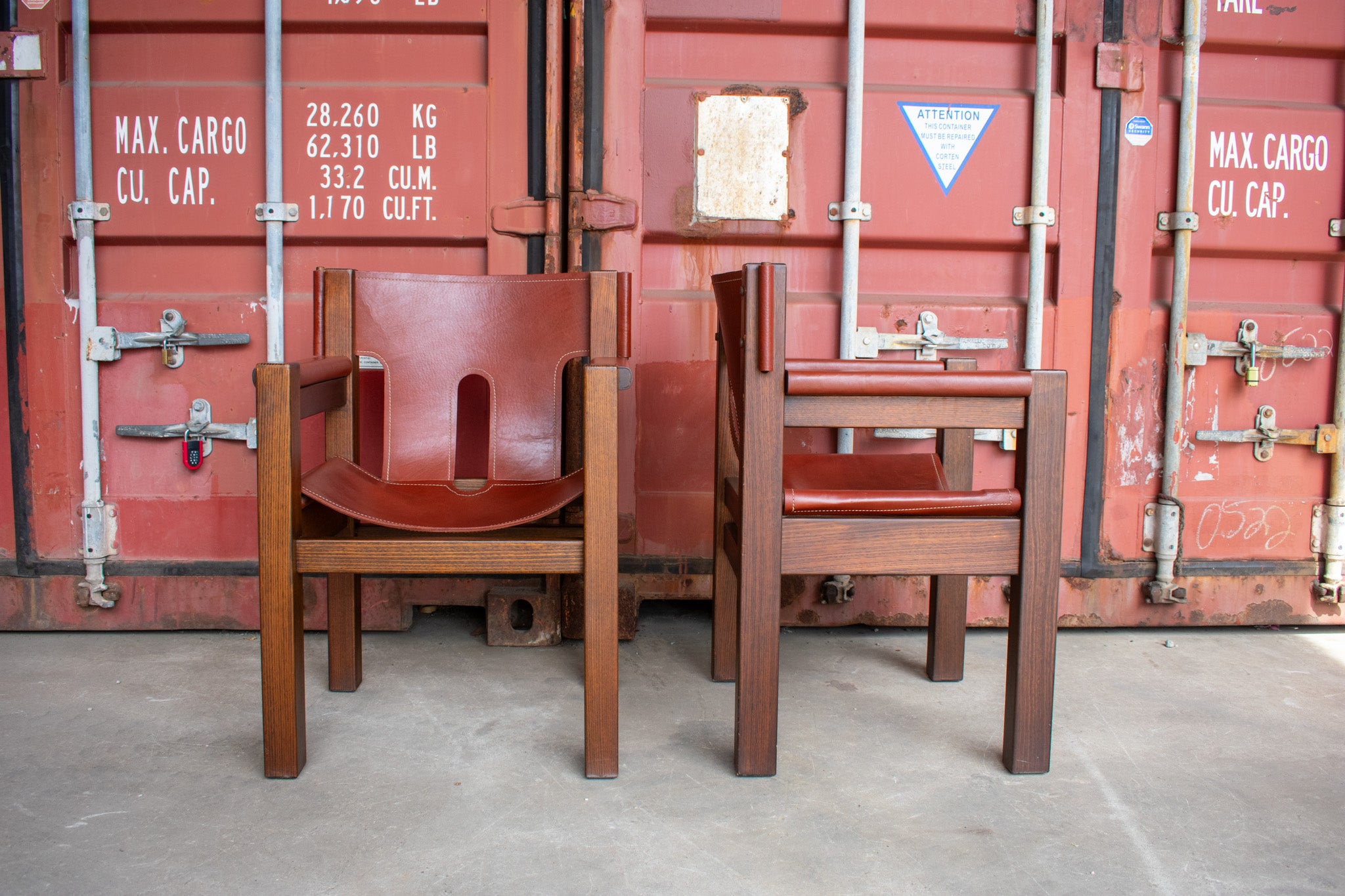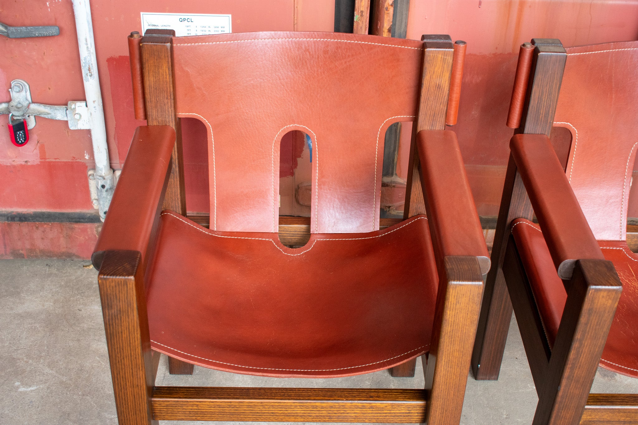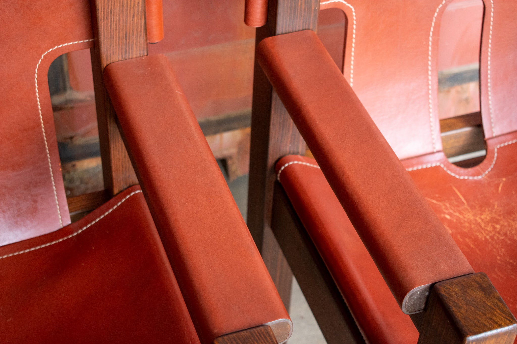 Description Pair of Matilda carver dining chairs designed by Gerald Easden. Crafted in Victorian ash with conker leather upholstery, these rare Australian modernist chairs feature Easden’s distinctive design language. The frames have been checked and re-glued where required, ensuring stability and longevity. Upholstery shows some wear in the form of scratches and light cracking, but the leather remains strong and supple.