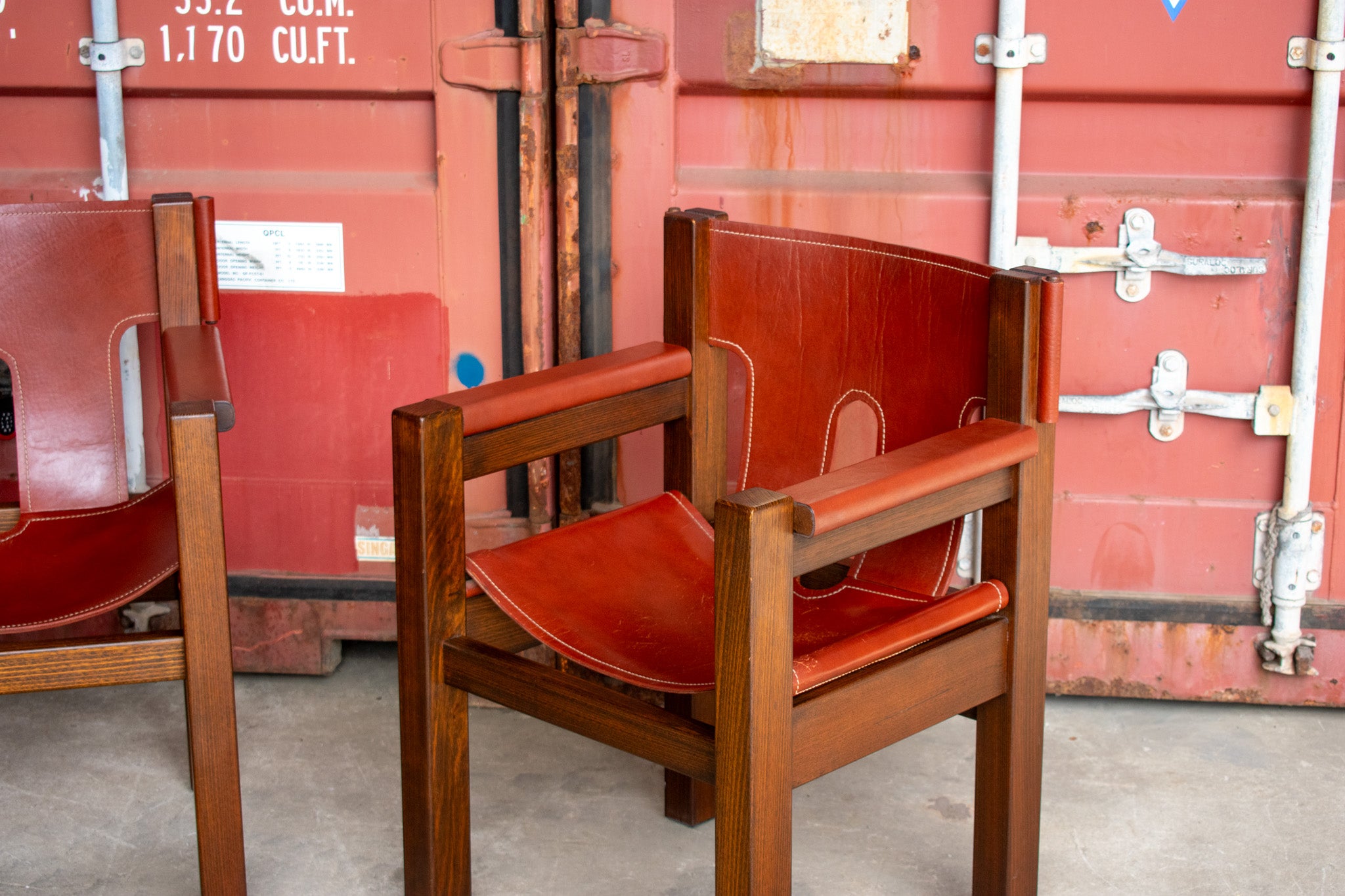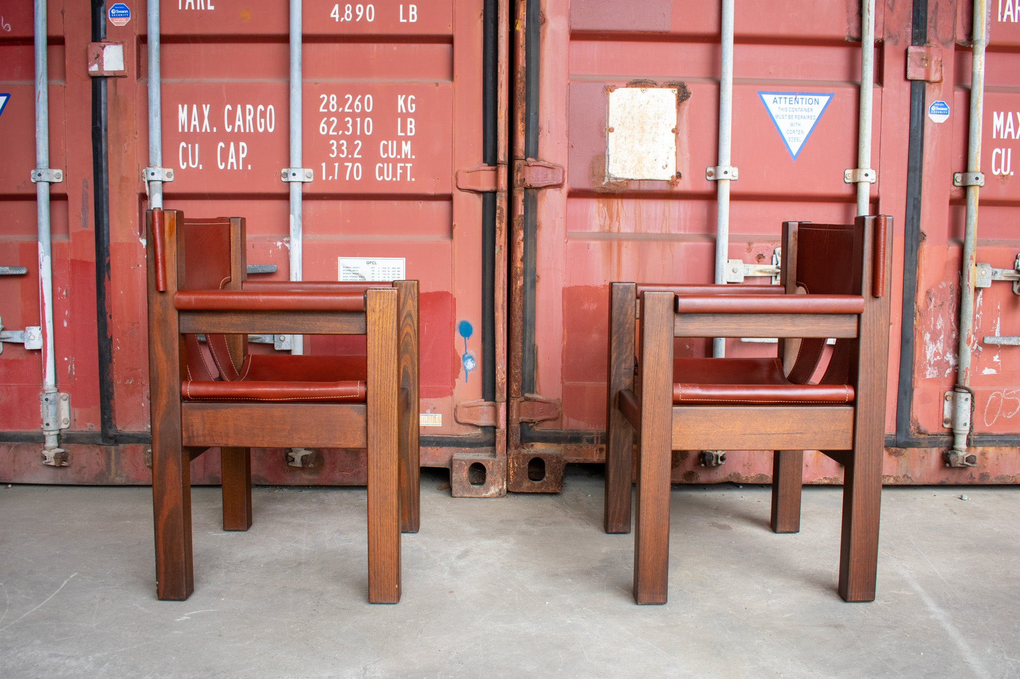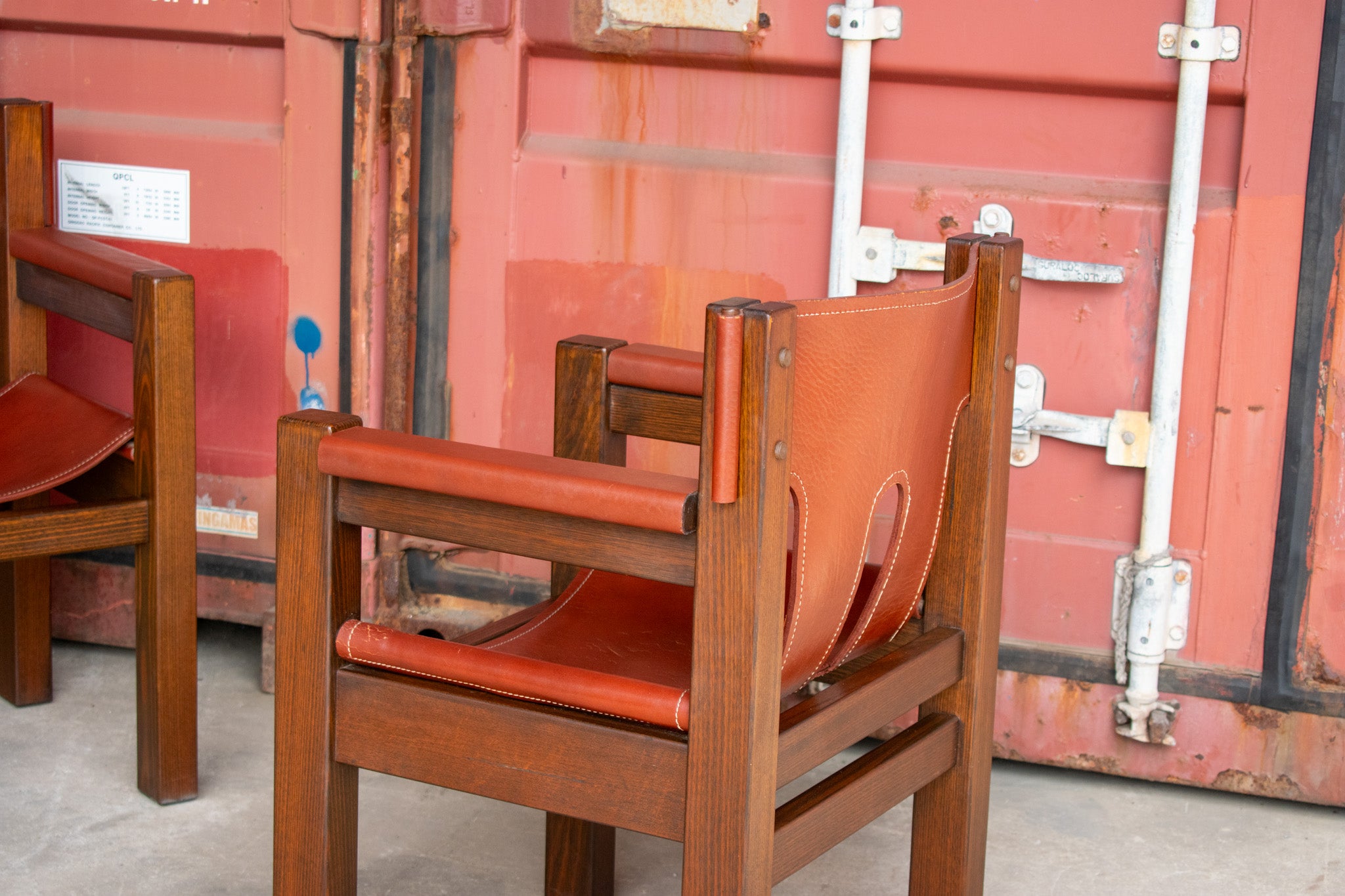 Description Pair of Matilda carver dining chairs designed by Gerald Easden. Crafted in Victorian ash with conker leather upholstery, these rare Australian modernist chairs feature Easden’s distinctive design language. The frames have been checked and re-glued where required, ensuring stability and longevity. Upholstery shows some wear in the form of scratches and light cracking, but the leather remains strong and supple.