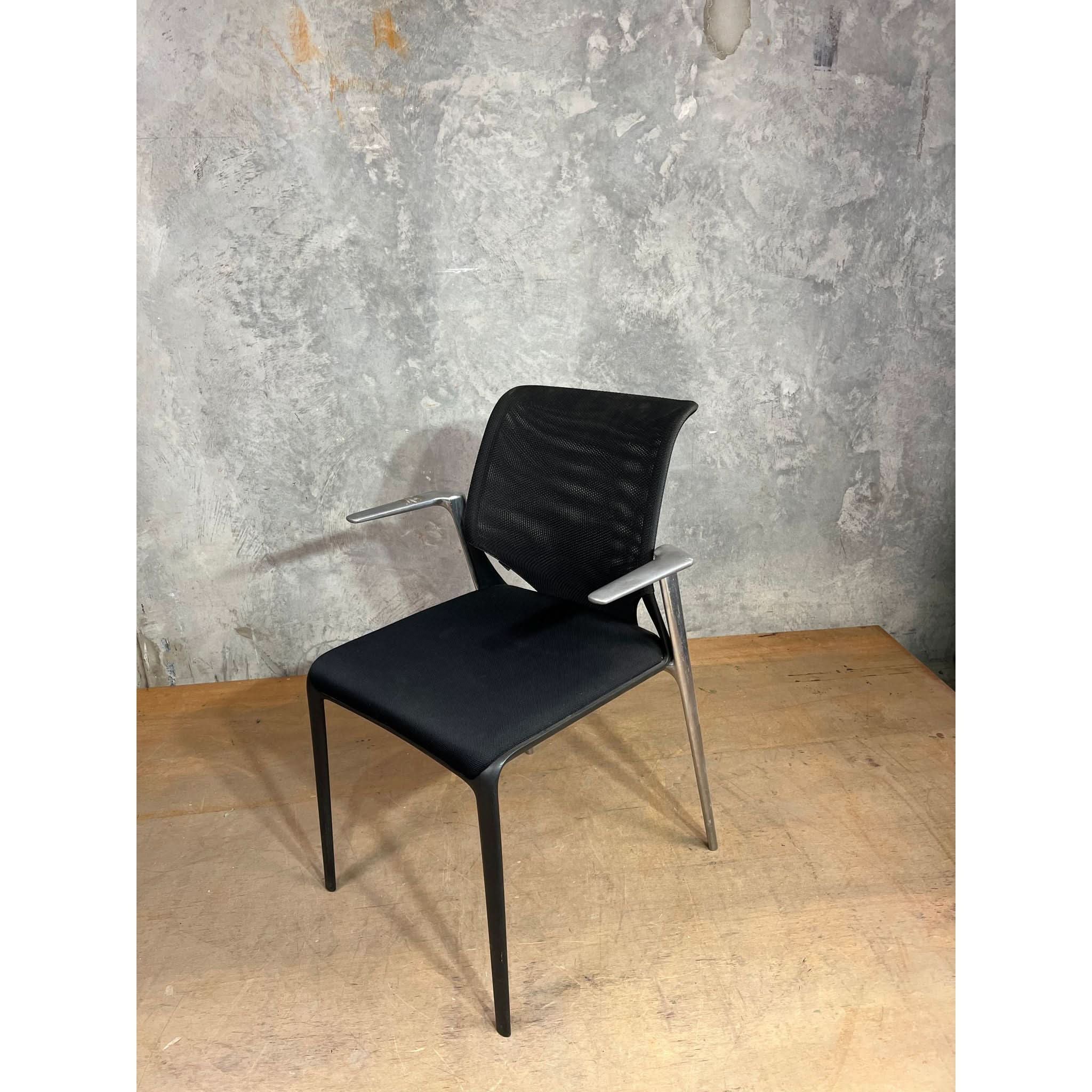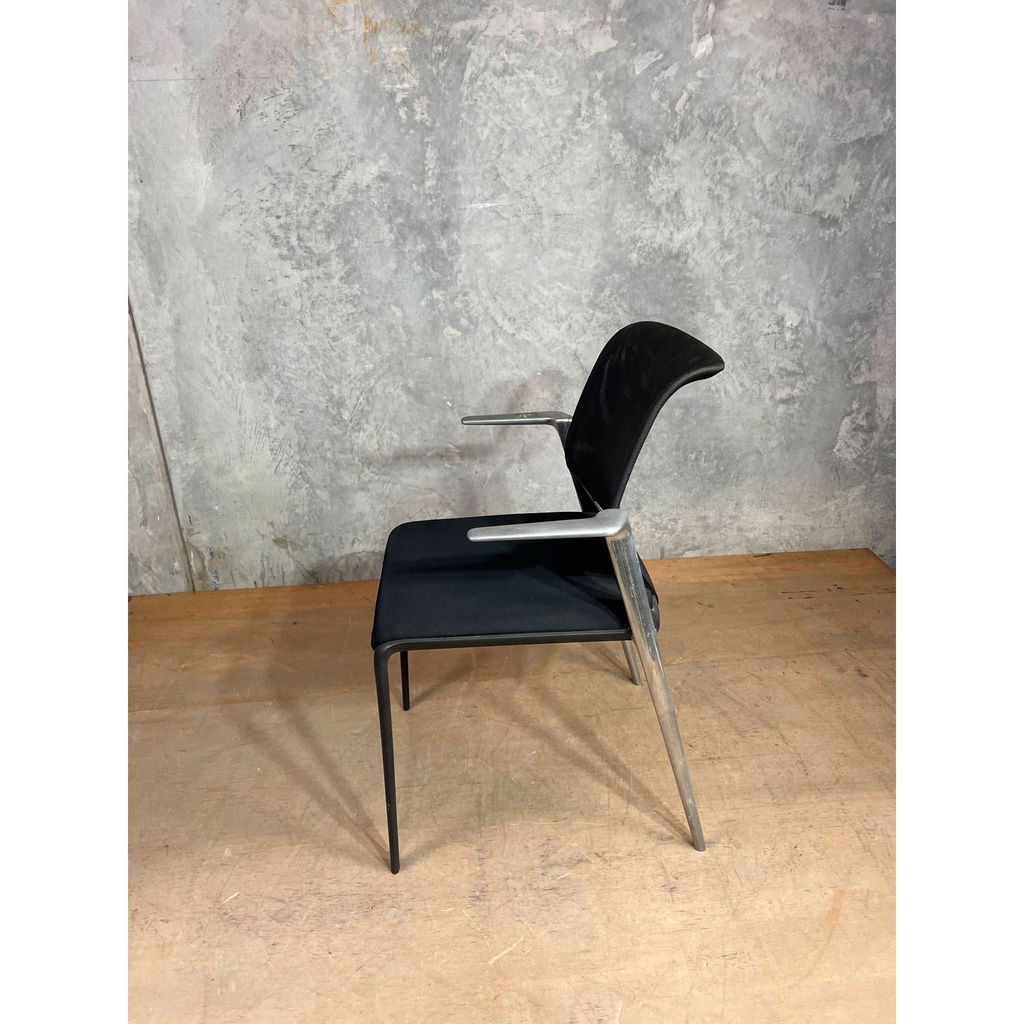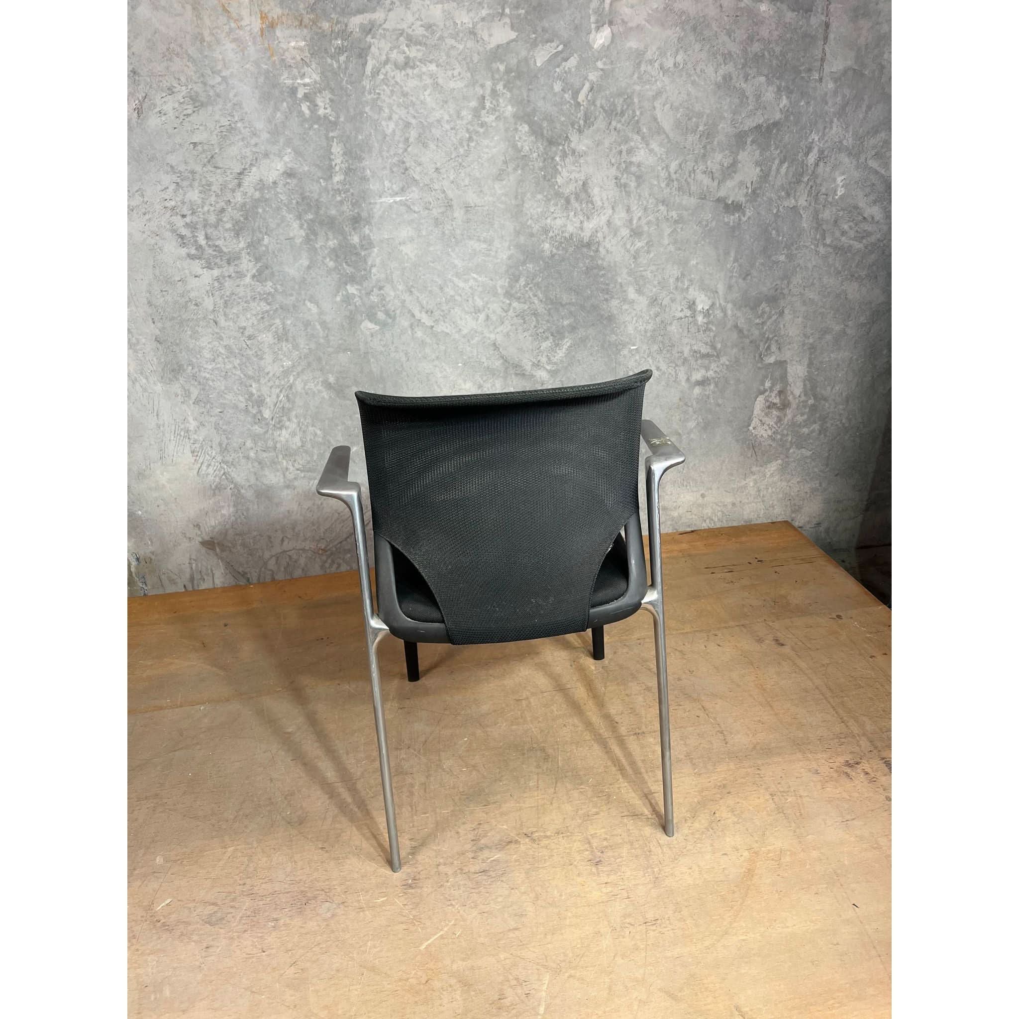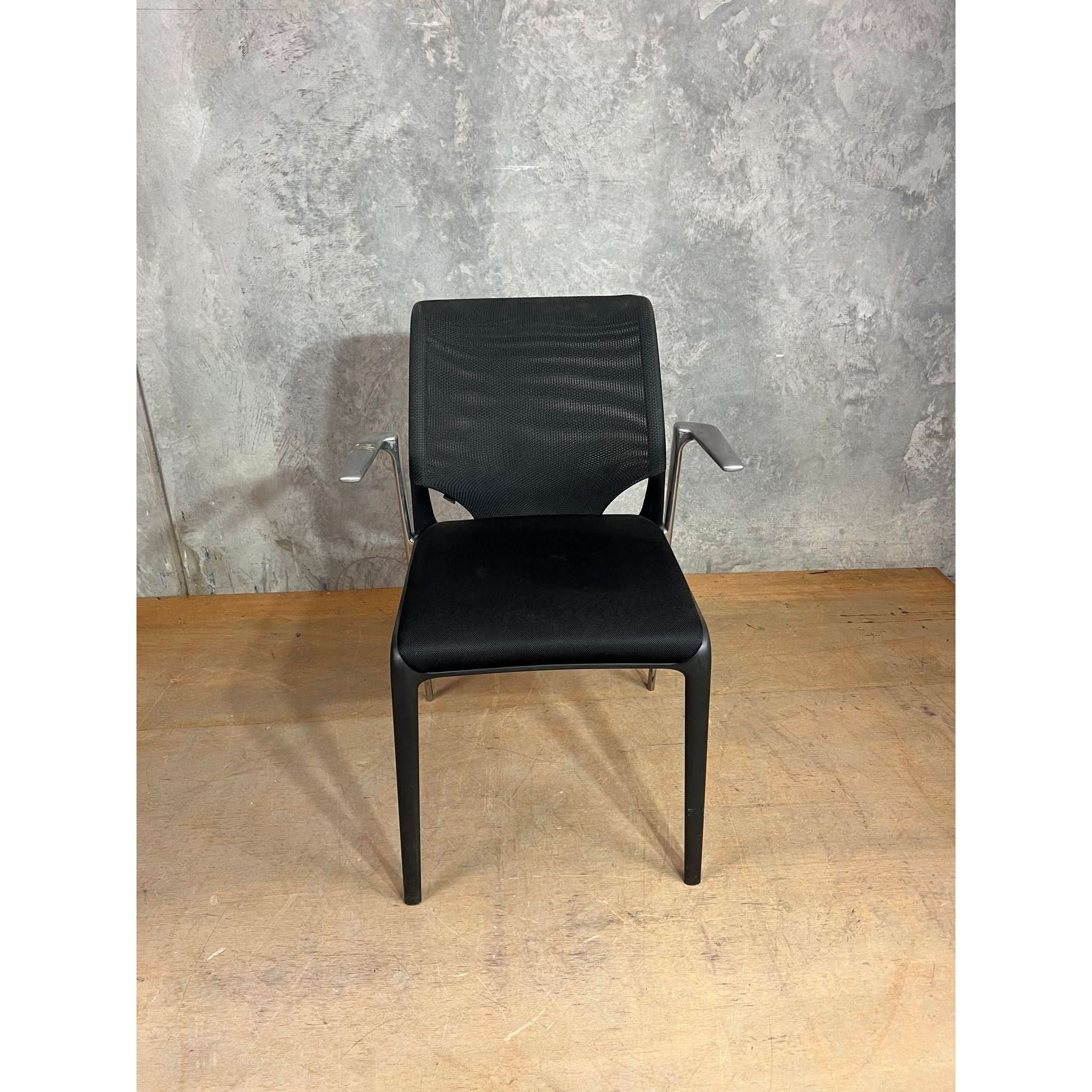The all black MedaSlim chairs with armrests, designed by Alberto Meda for Vitra, are a robust universal chair that offers exceptional comfort. The elegant and sleek chair can be used wherever comfortable seating is required for extended periods of time. The flexible backrest frame, seat and front legs are moulded in one piece and adapt to the user’s body movements. Together with the breathable netweave fabric, the design ensures comfortable sitting over long periods.