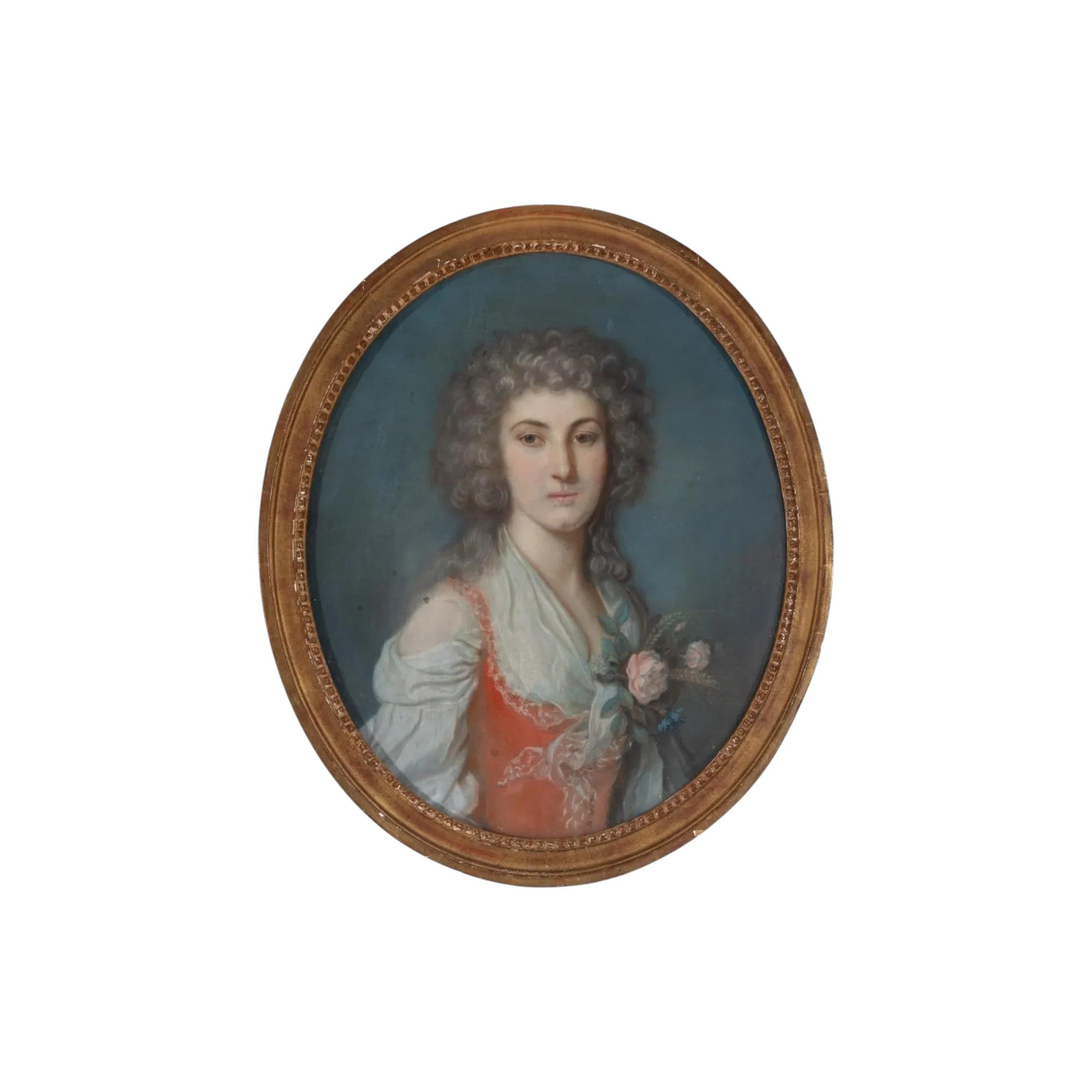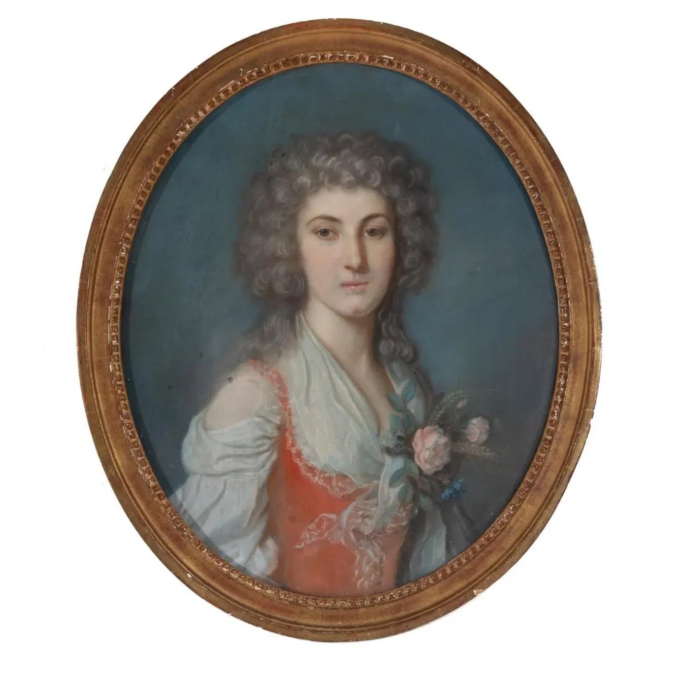 A beautiful 18thc pastel portrait by Polish portrait painter and pastellist Anna Rajecka (1760-1832) she studied in Warsaw & Paris under Bacciarelli & Greuze. She painted the circle around the Polish Royal Court and in Paris plus numerous commissions from the local aristocracy. Framed in an antique oval watergilded frame. size: 72cm h x 61.5cm w signed lower left.