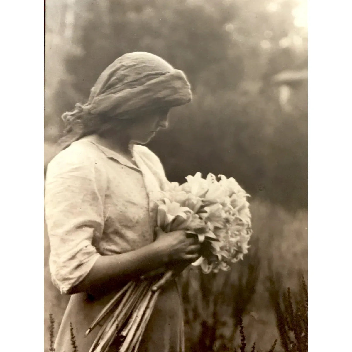 A beautiful original photograph by South Australian photographer Frederick A Joyner (1863-1945) “Girl with Lilies” in original oak frame with exhibition label verso.Exhibited in the AGSA retrospective exhibition Real Visions The life and work of FA Joyner in 1981. Catalogue included with the photograph.