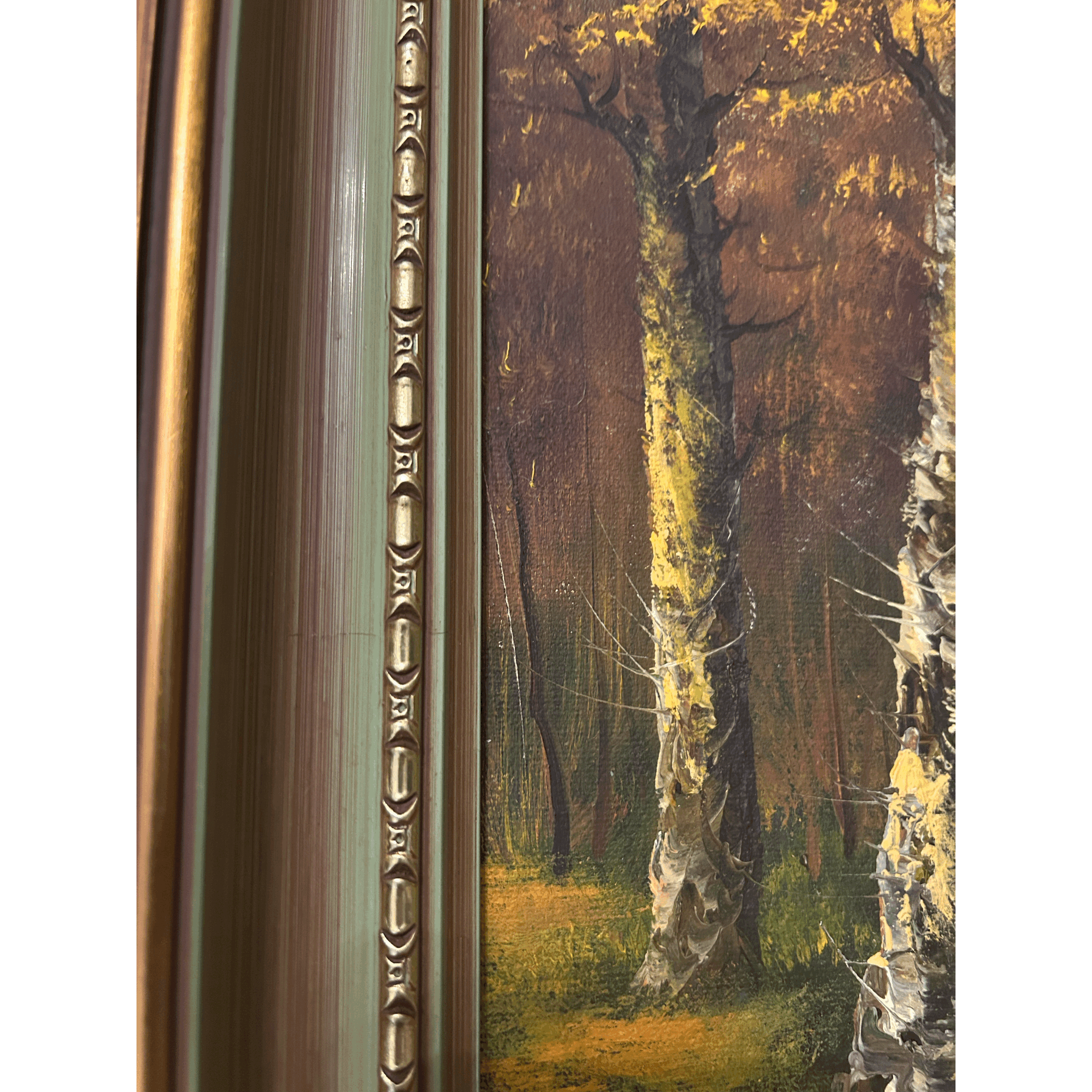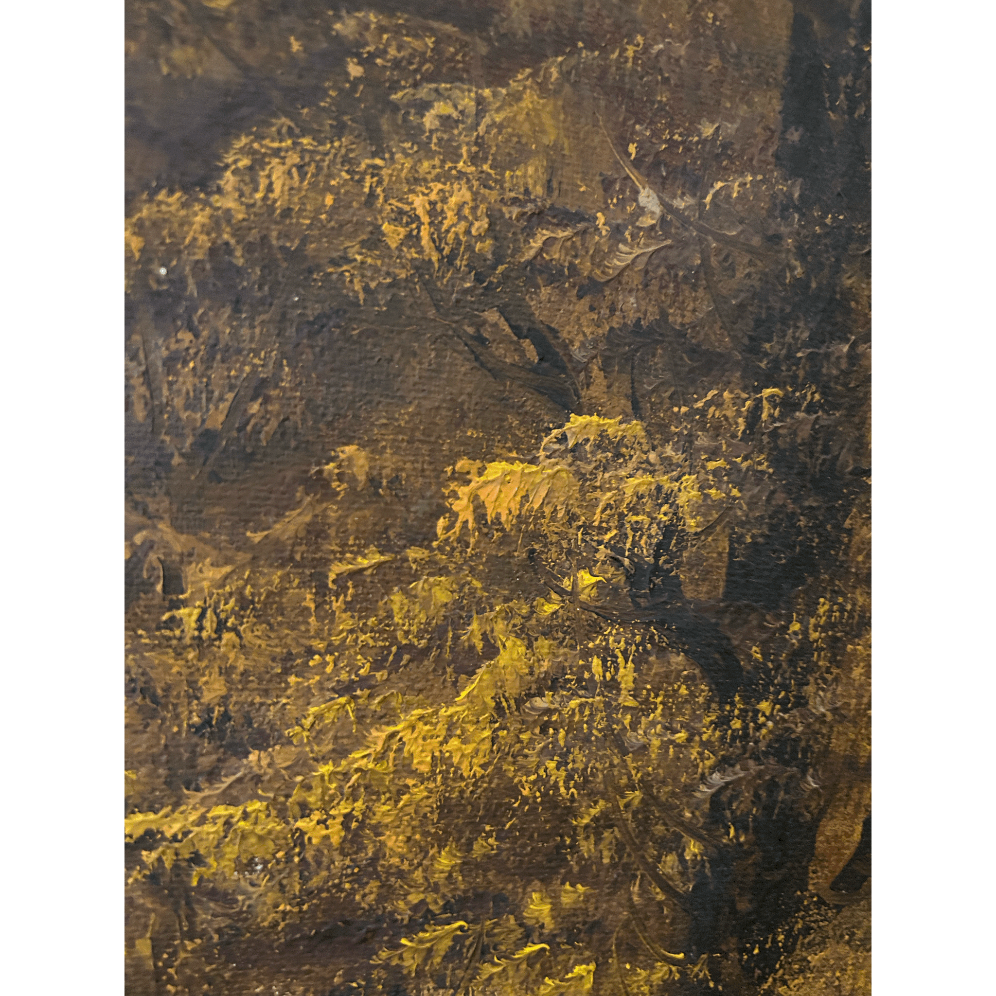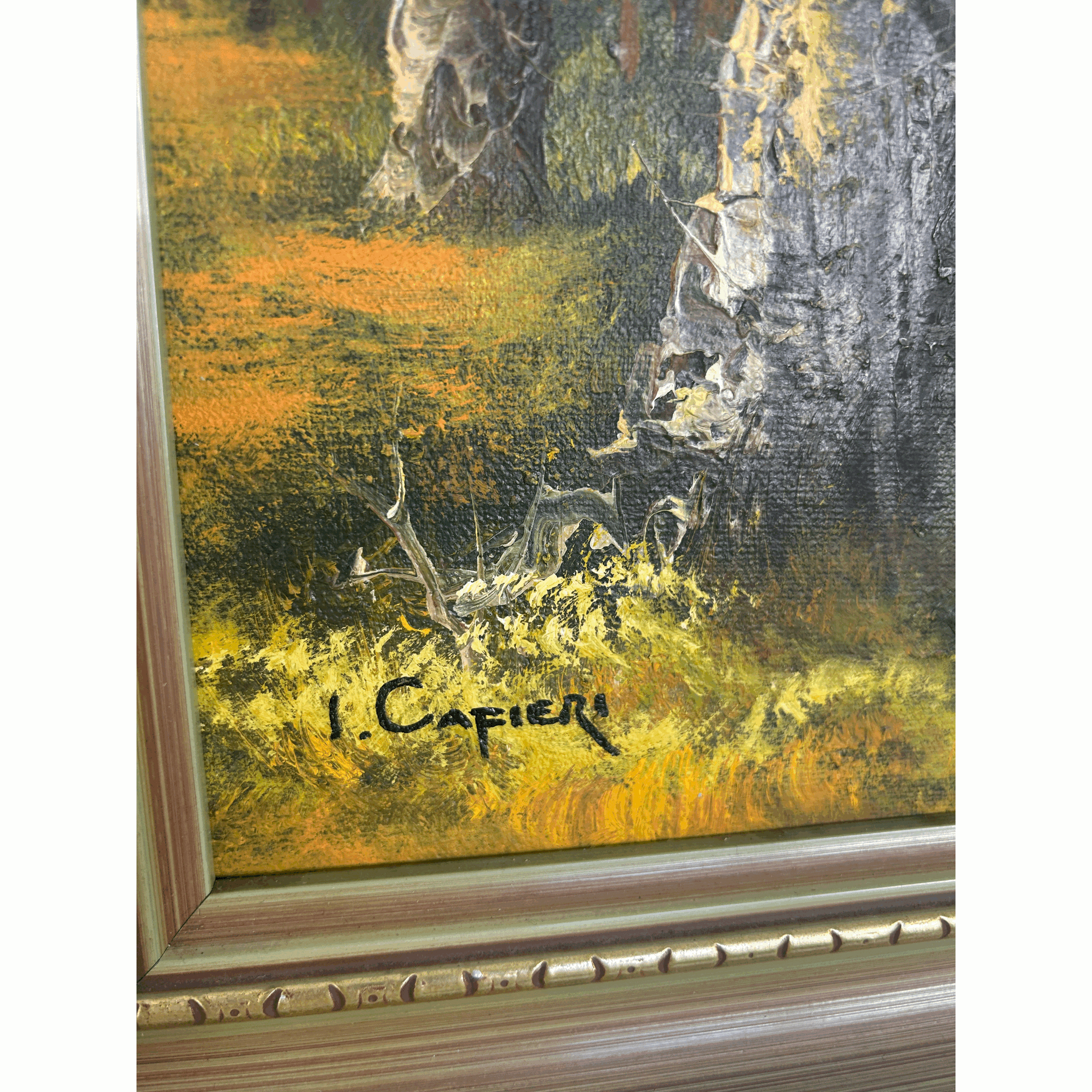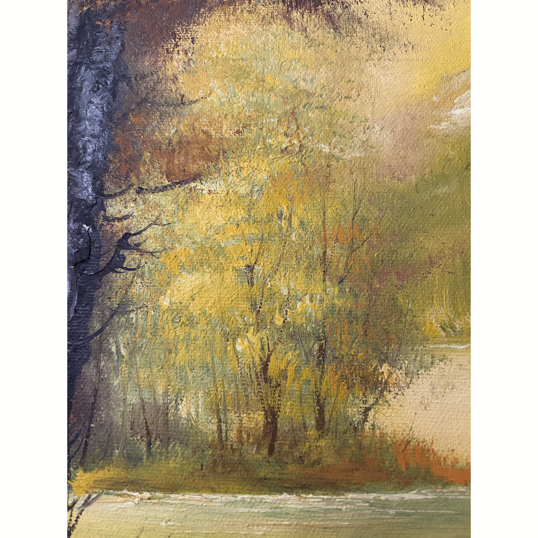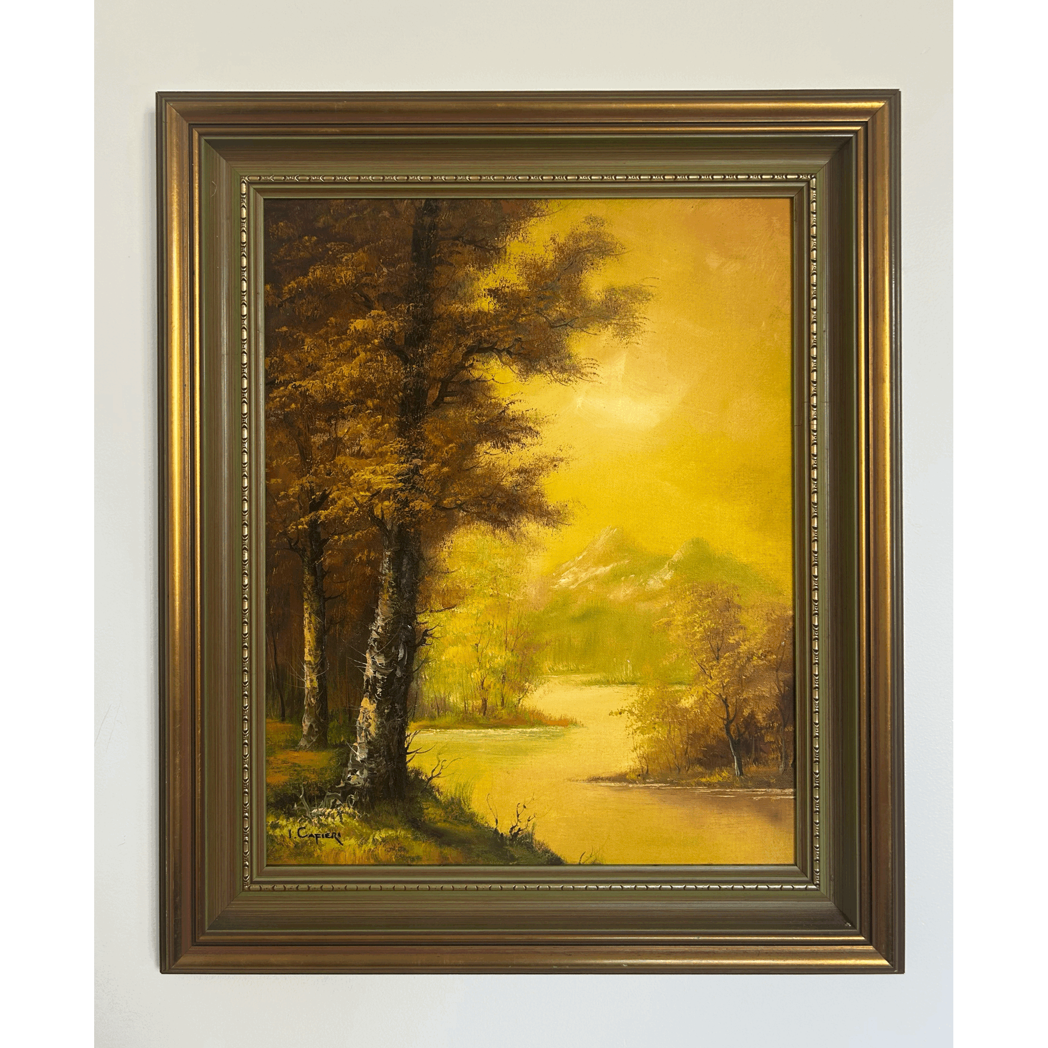 This warm, nostalgic landscape by Irene Cafieri captures a golden-hour moment in nature, with luminous yellow skies casting a dreamy light over autumnal trees and still waters. Painted in oil on canvas and housed in its original ornate frame, the piece is a symbol of the decorative mid- century style embraced by collectors and stylists alike.