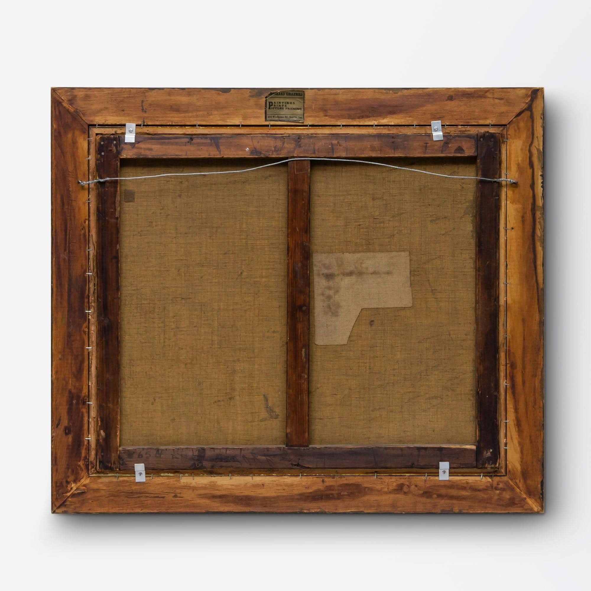 A late 19th-century oil on canvas painting depicting two horses, a man and a dog in front of a stable. Signed lower right by French artist 'A. Leonard'. Label on verso for Meinhard Galleries in Houston, Texas which was operational between 1971-1985.
