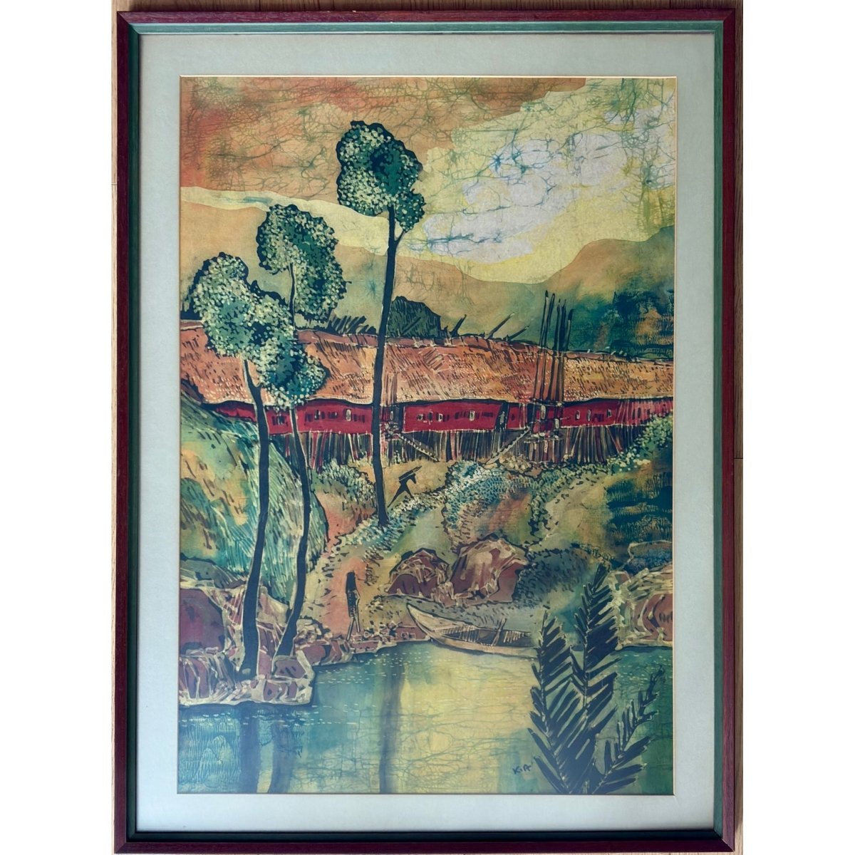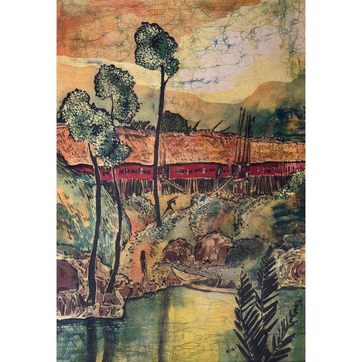 A superb large-format vintage batik painting by Lee Hock Kia (b.1937), renowned Sarawakian batik master celebrated for his lyrical depictions of Malaysian village life. Created circa 1970s, this richly layered batik depicting a riverside longhouse, canoe and two figures on the hillside, rendered in warm earth tones with beautifully controlled wax crackle.