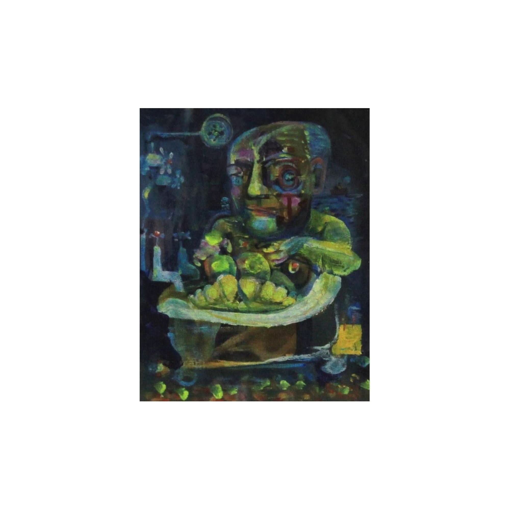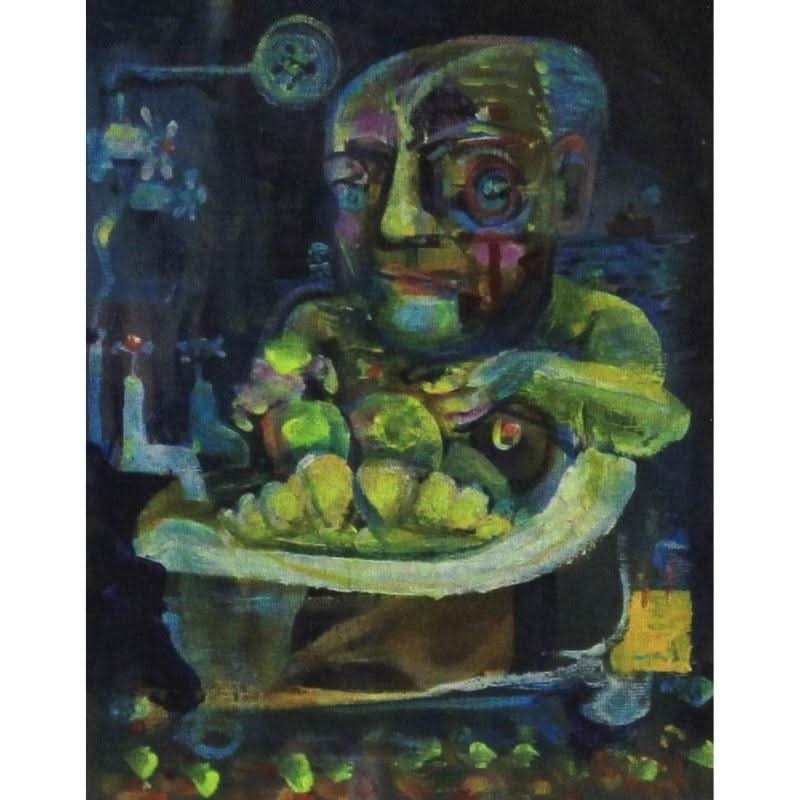 “Olsen’s Bath with Lingering Memories” by acclaimed Artist Victor Rubin. Measures H 25 x W 20cm and comes framed. Acrylic on canvas.
