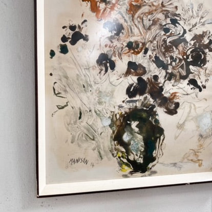 Original mid century artwork oil on paper with fab brown and orange colourway. An interesting abstract still life, signed and dated Manison 74. In good vintage condition.
