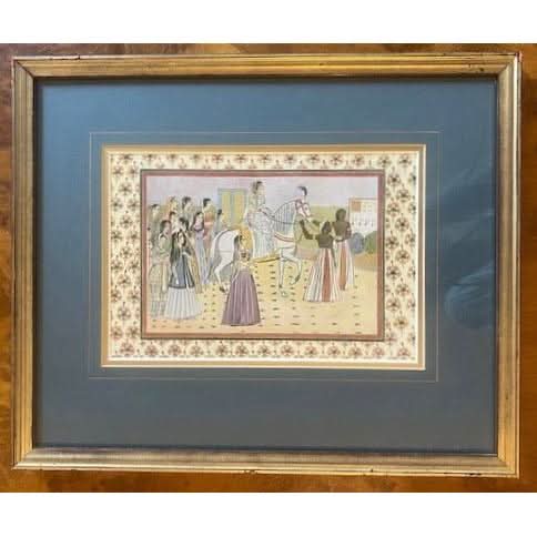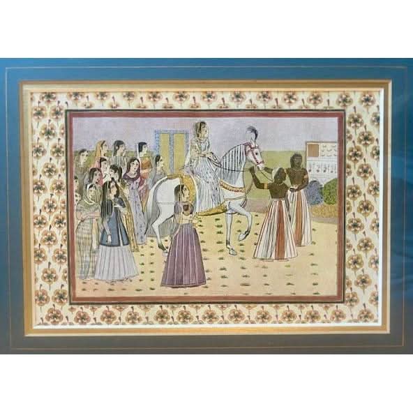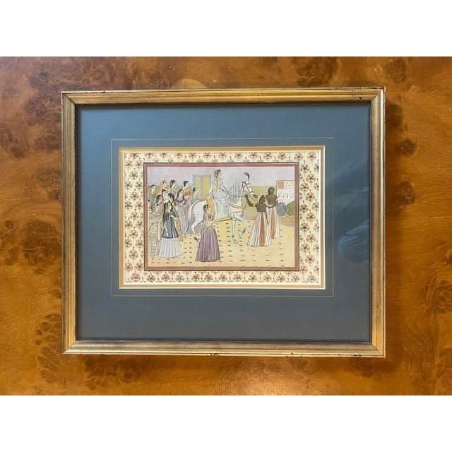 Vintage framed Indian wedding scene, framed beautifully with simple gold frame and dark green / grey mat board. Behind glass. Ready to hang. Landscape. See matching piece, listed separately.