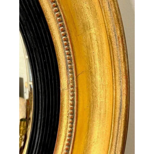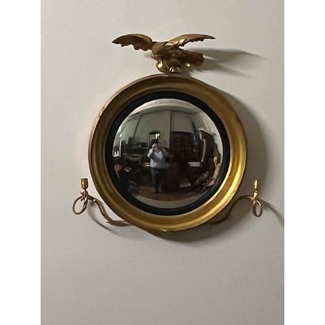 The glass is convex and is surrounded by a black finely reeded slip. The frame is surmounted by a carved gessoed and gilded timber Eagle with wings out spread. At the base are a pair of opposed scrolled sconces that are later added however add to the over all decorative appeal and may be used for candles.