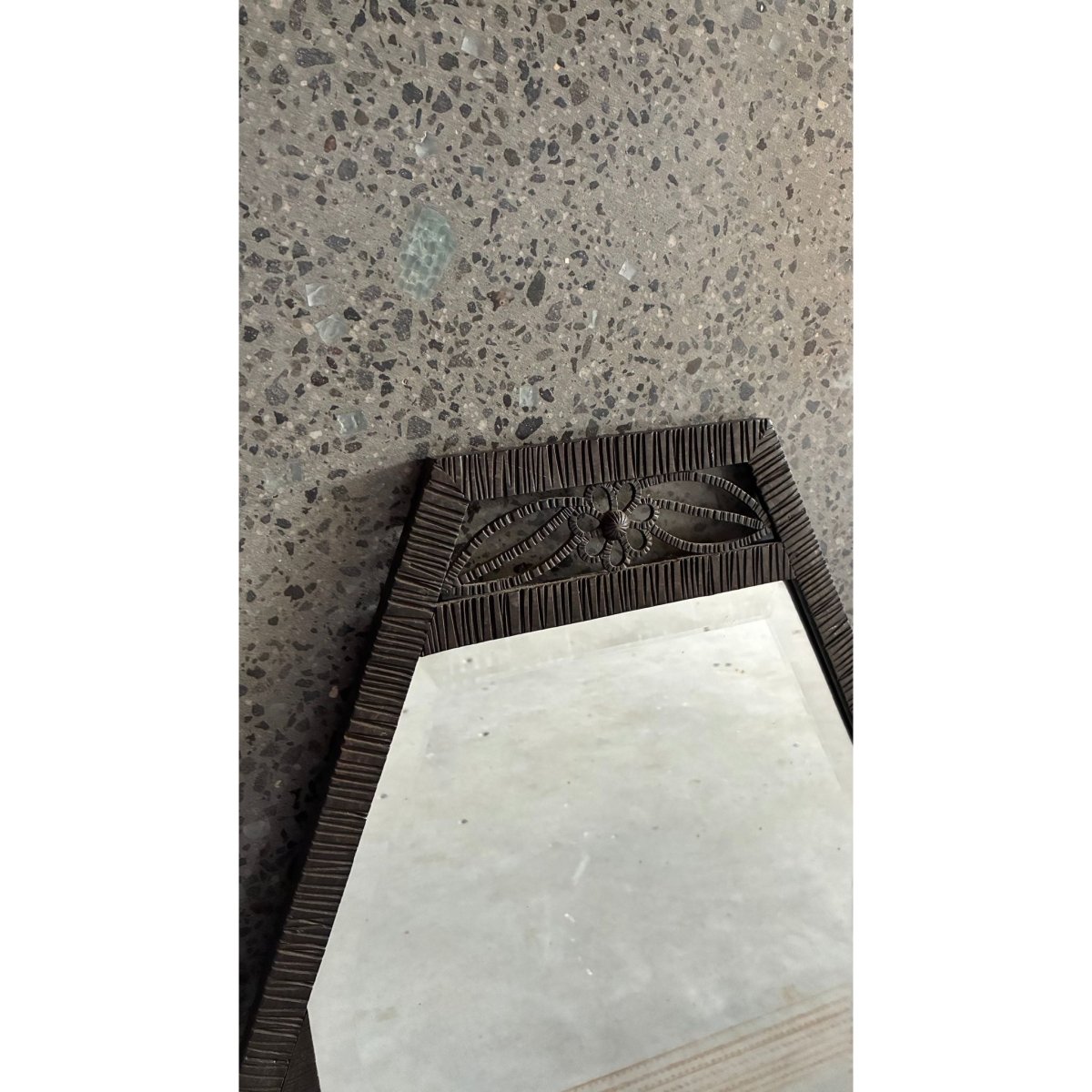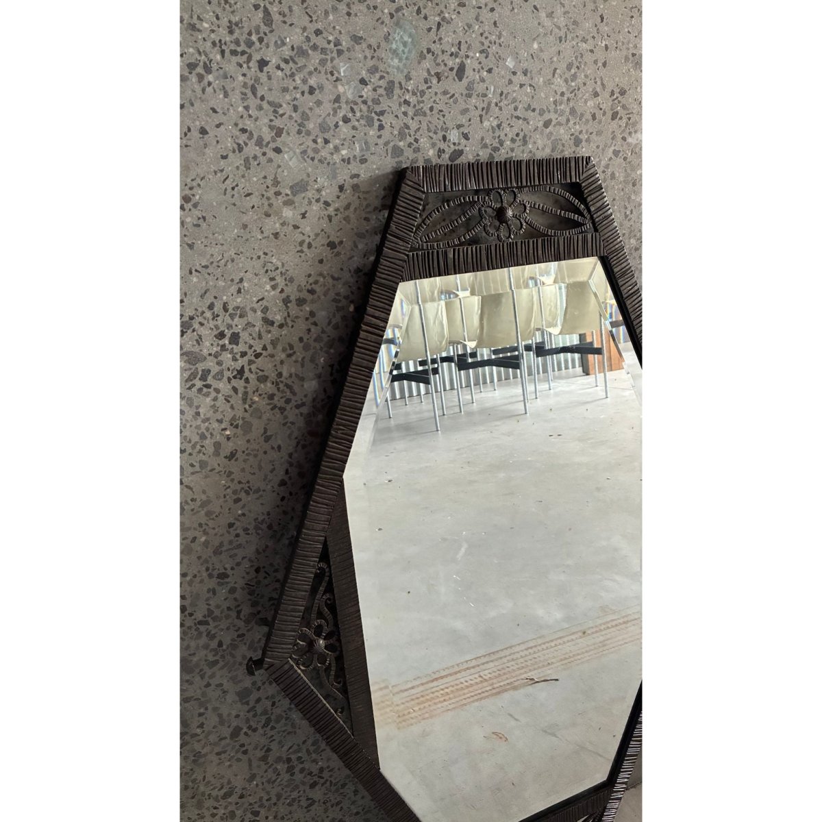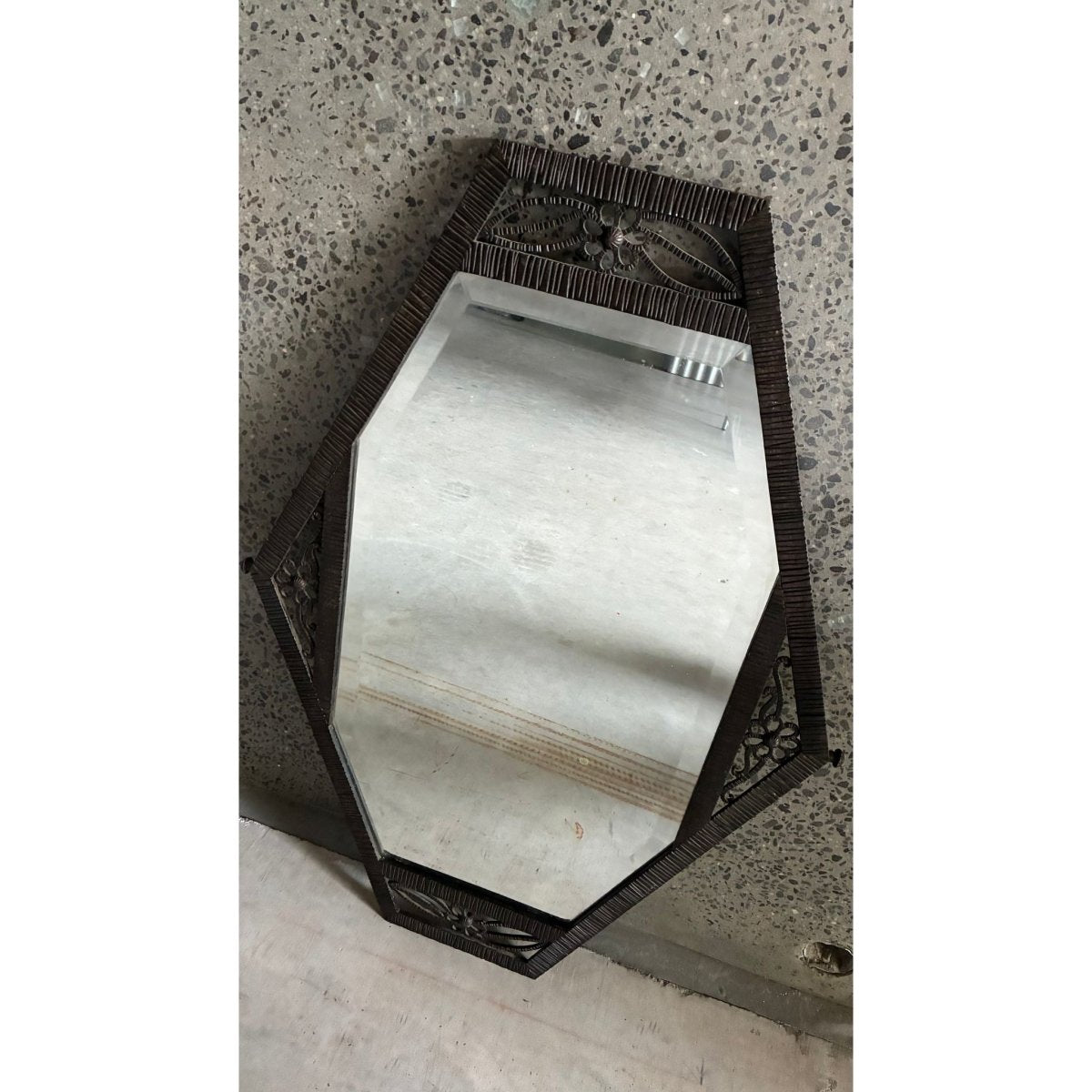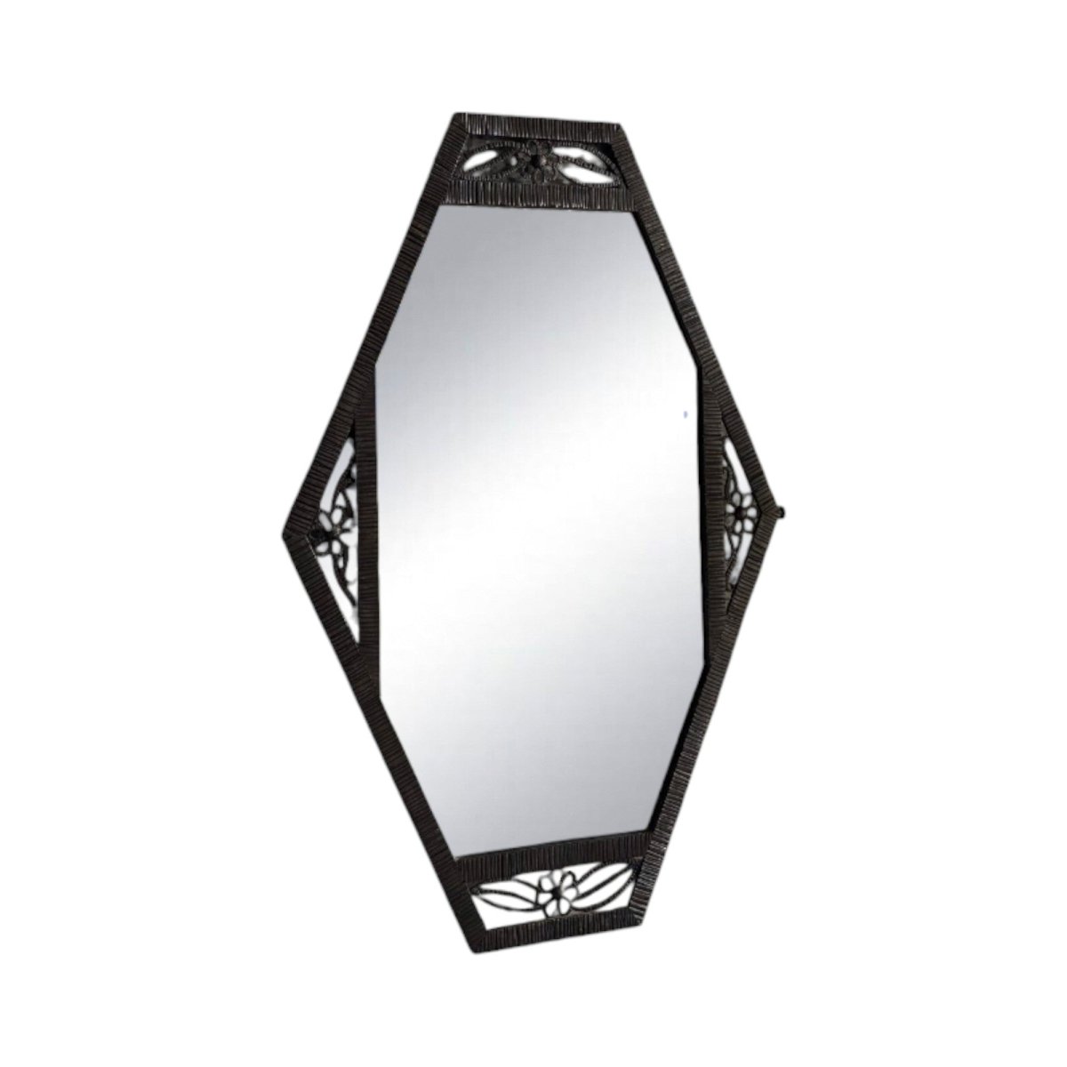 A striking French Art Deco mirror featuring a hexagonal bevelled plate set within a decorative wrought iron frame. The hand-worked metal shows beautiful linear texture and floral detailing, characteristics of the 1930s craftsmanship.