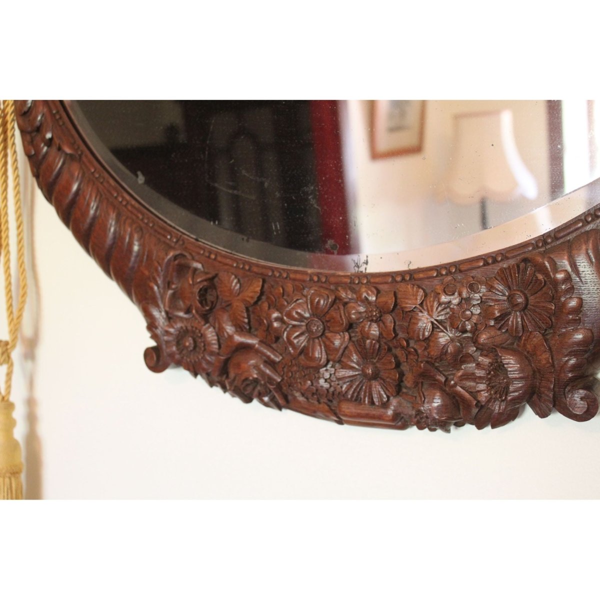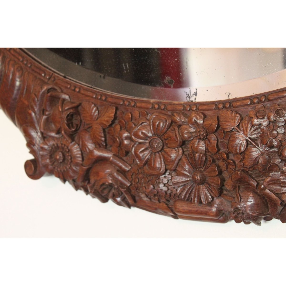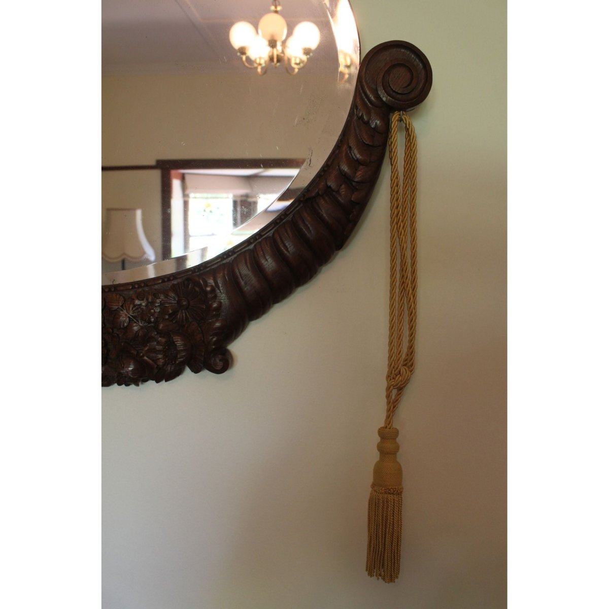 This large, very French, very early Art Deco, wall mirror measures 910 mm across and 705 mm high. The frame in which the mirror sits is carved and stained oak. The design features a mass of flowers flowing from two facing cornucopia, with silk tassels hanging from the ends of the cornucopia. Cornucopia are an ancient symbol of plenty. They can be shells or animal horns which are overflowing with flowers, fruit or cereals - the fruit of the harvest. There are a small loss of the silvering to the rear of the mirror and the tassels are replacements. It dates from the 1920's.