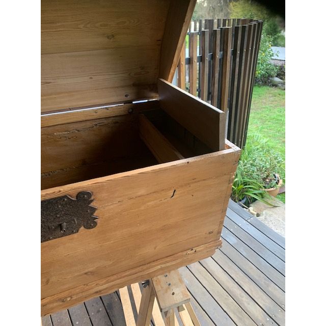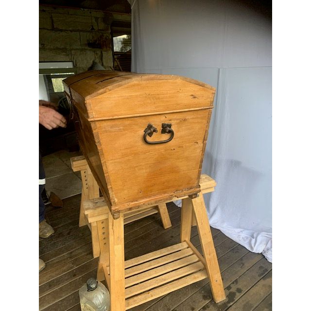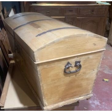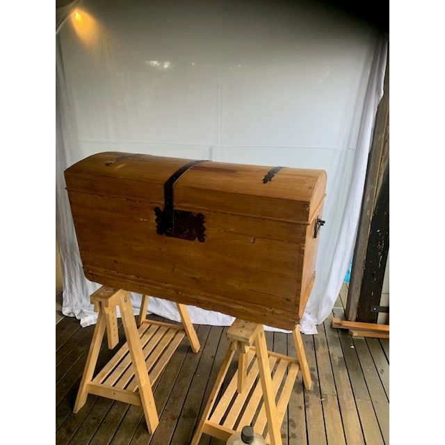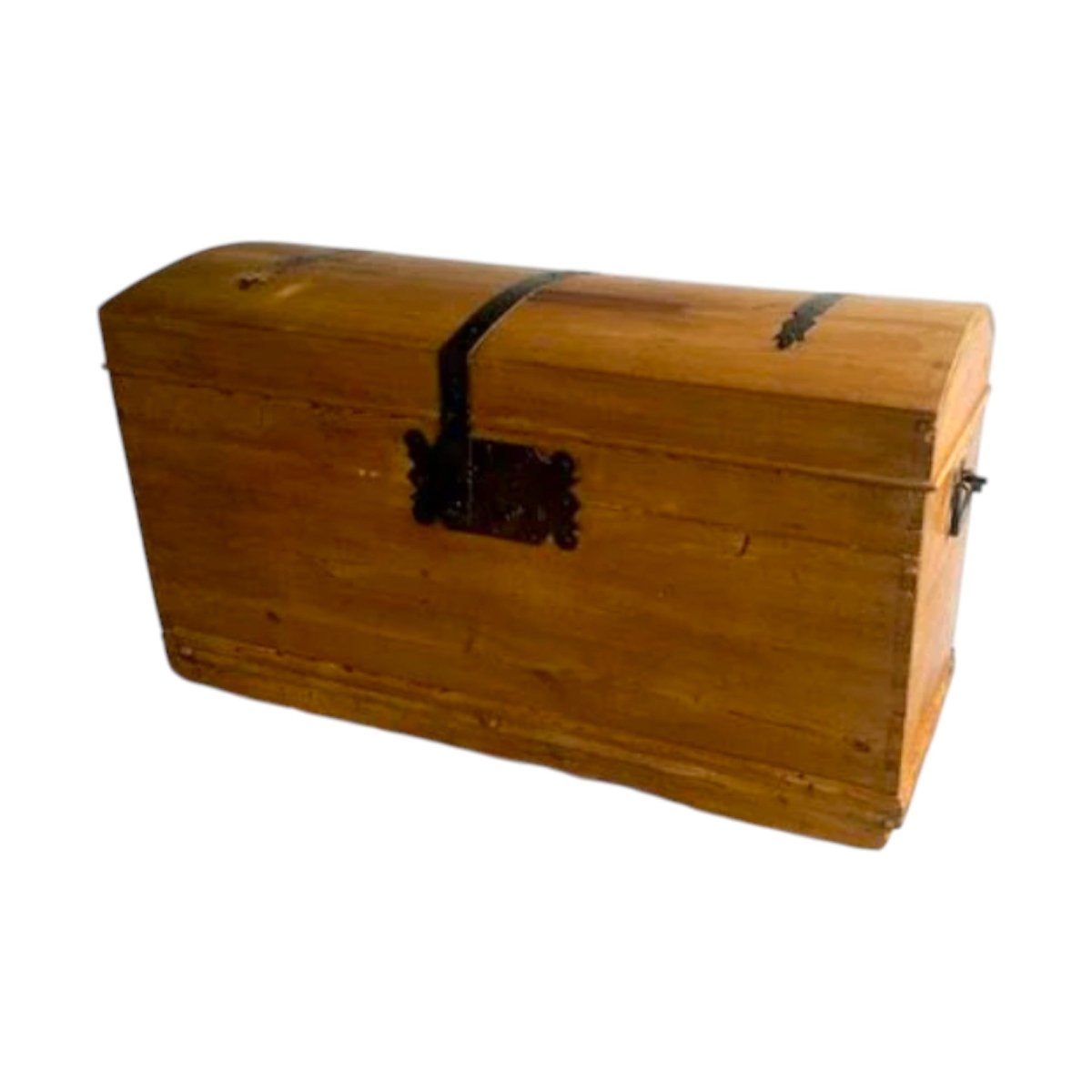 A metal banded dome top coffer with internal candle drawer, This coffer has had some earlier minor woodworm damage to the internal back panel, the piece has been treated. Circa 1850, honey coloured with bee’s wax finish.Original iron hardware.