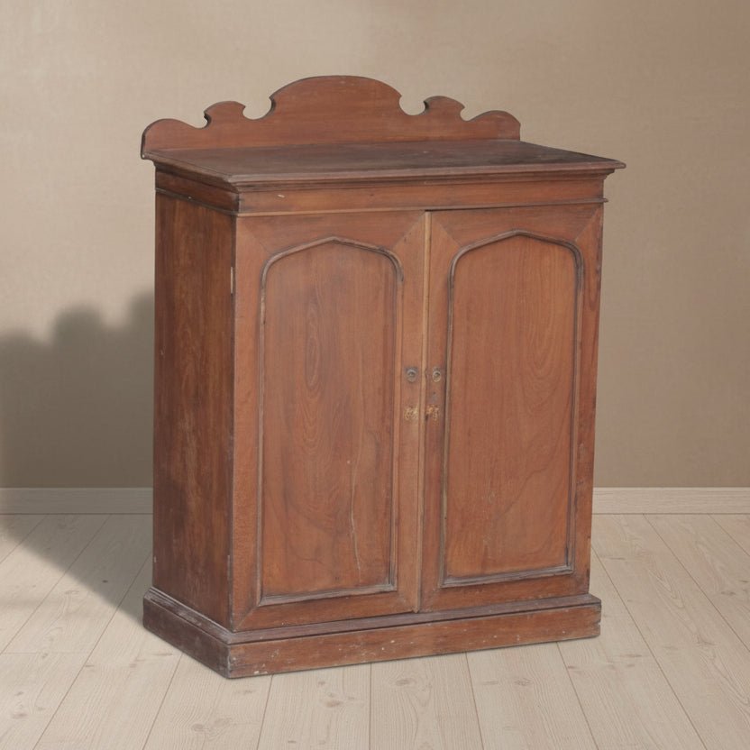 This handsome Anglo-Indian linen press brings authentic colonial character to any interior. Crafted around 1900 for the British market in India, it marries practical British design with skilled Indian woodworking. The cabinet showcases a graceful shaped cornice and paired fielded panel doors that open to reveal generous shelving and two working drawers inside. Built from solid teak with a beautifully aged patina, it still wears its original brass ring pulls and hardware. A refined, functional piece that speaks to heritage craftsmanship and timeless proportions.