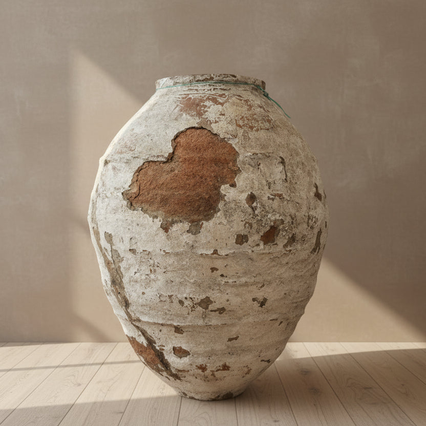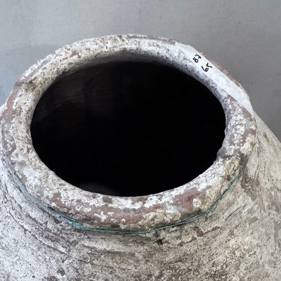 This original, solid and heavy vessel is exactly as shown. Originally used to store olive oil, it’s a one-of-a-kind piece that has weathered uniquely over time. Gathered layers of sediment paint and patina make it a stunning display piece.