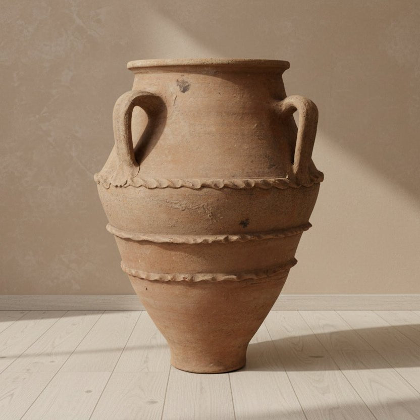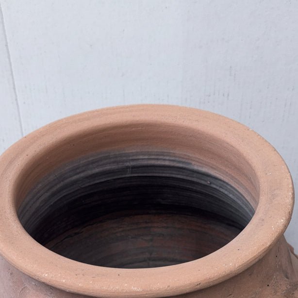 This original, solid and heavy vessel is exactly as shown. Originally used to store olive oil, it’s a one-of-a-kind piece that has weathered uniquely over time. Gathered layers of sediment paint and patina make it a stunning display piece.