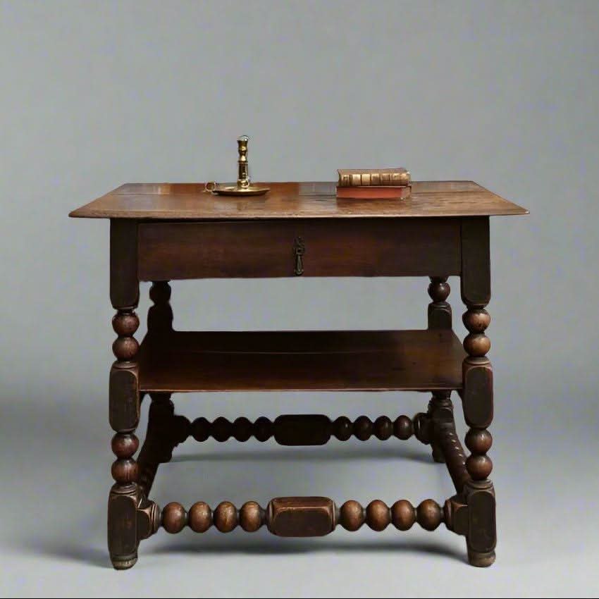 Discover the charm of our Louis XIII Oak Side Table, an antique piece with a single drawer, shelf, and bobbin legs. Perfect for adding a touch of history to your home decor.