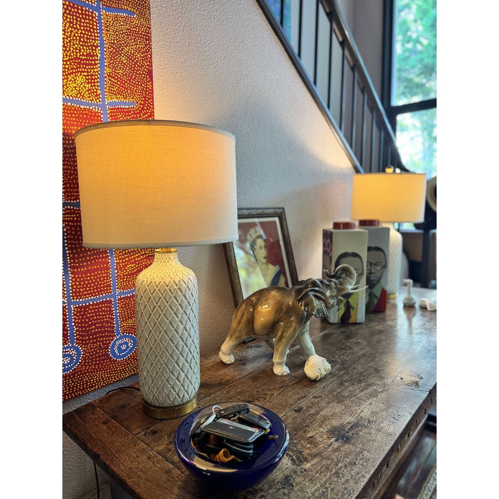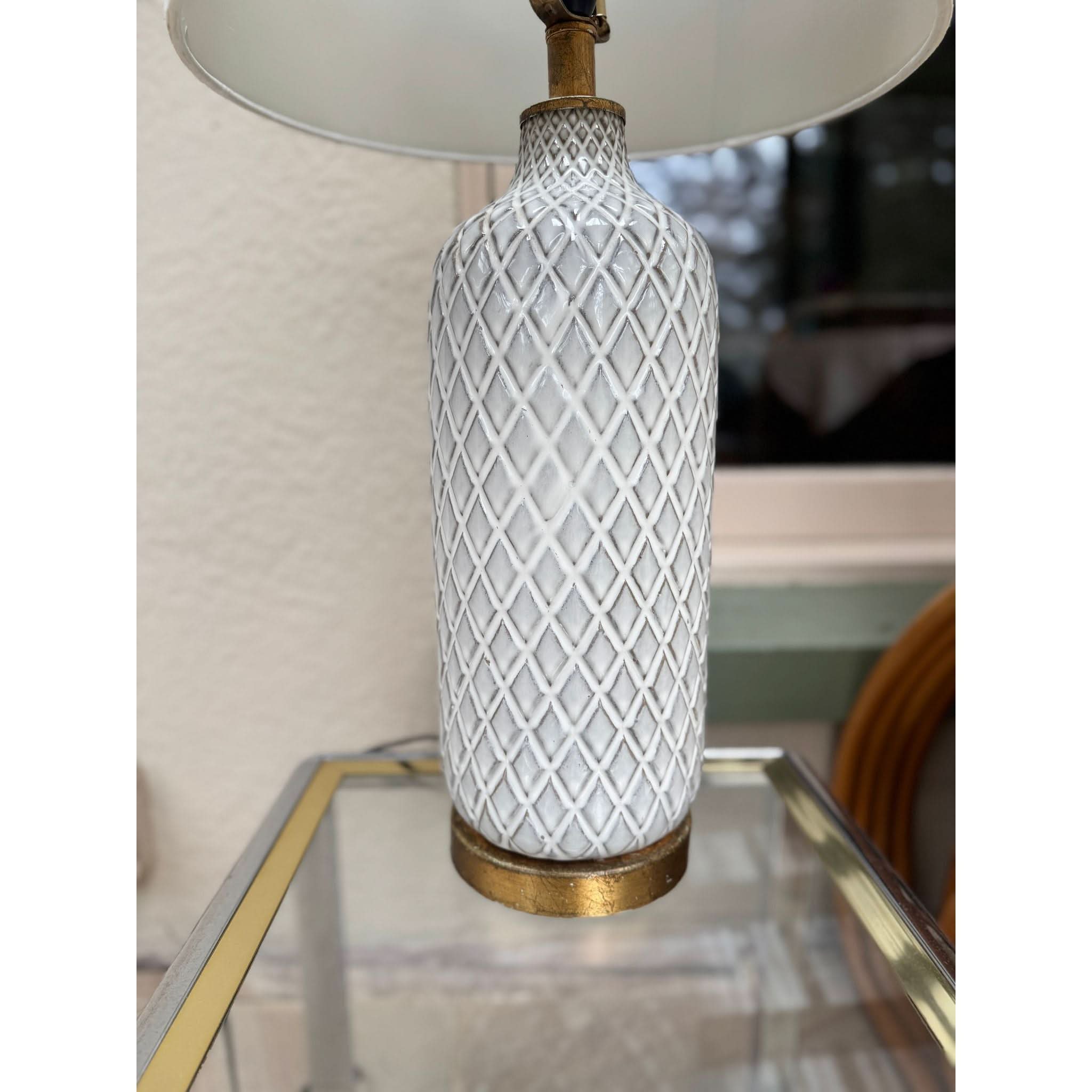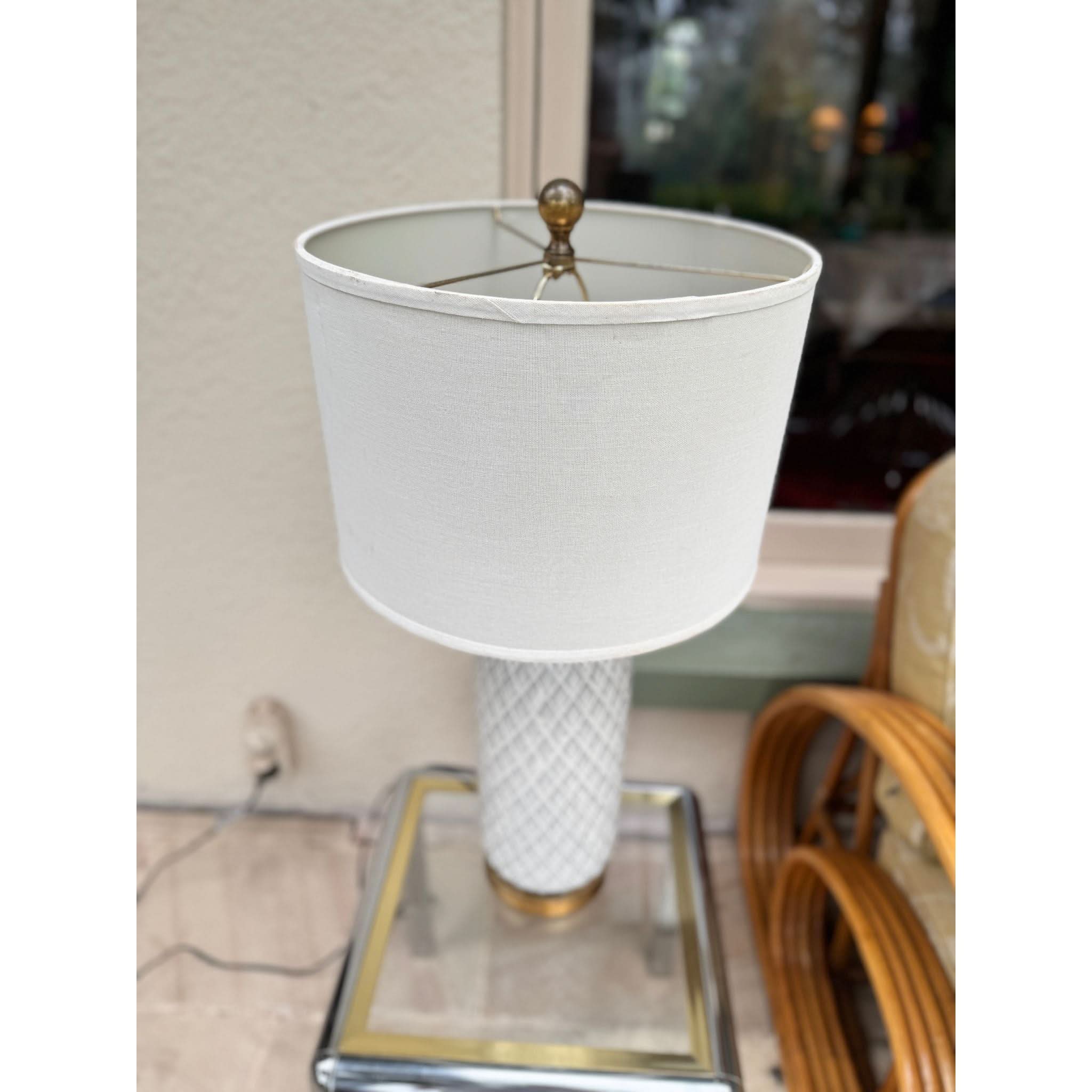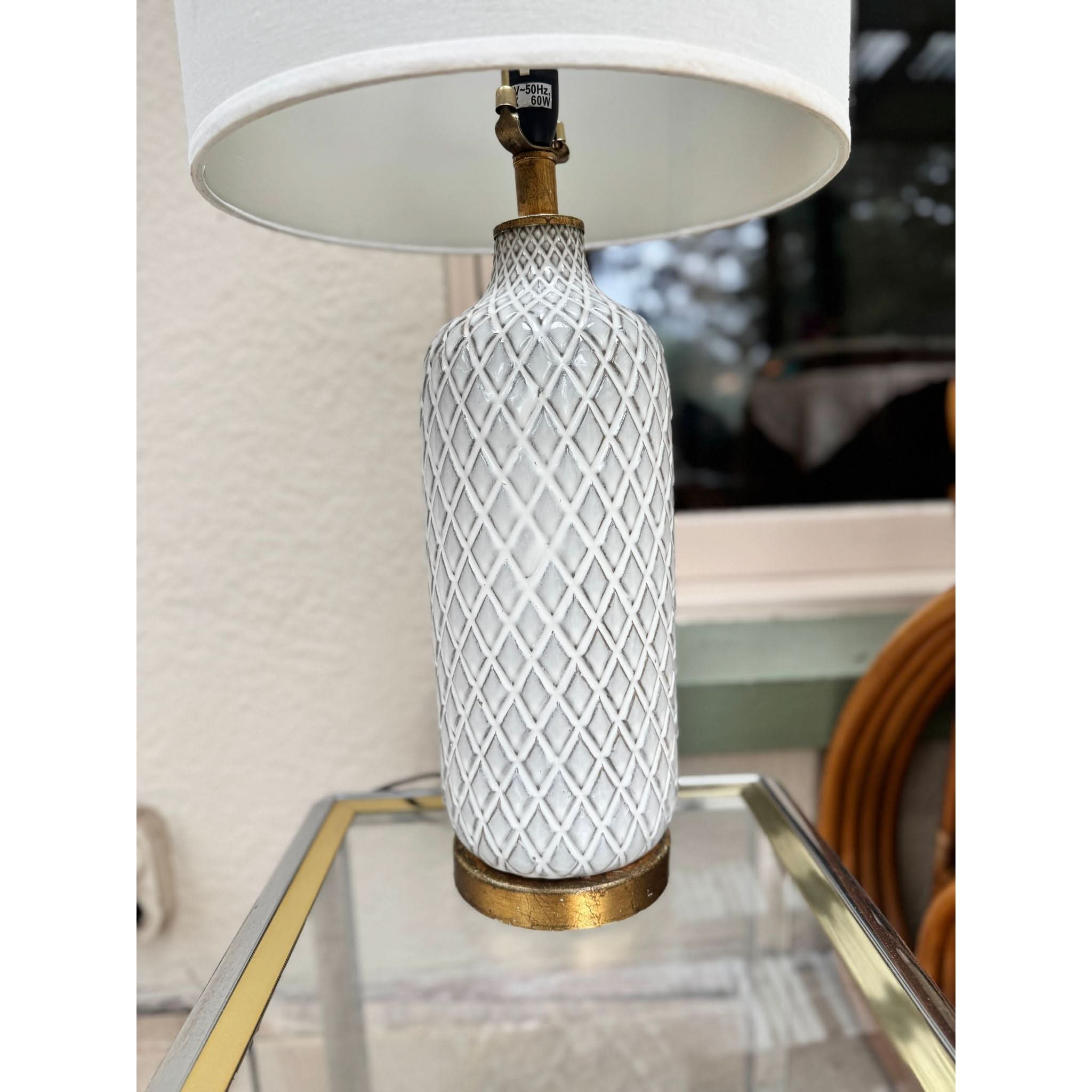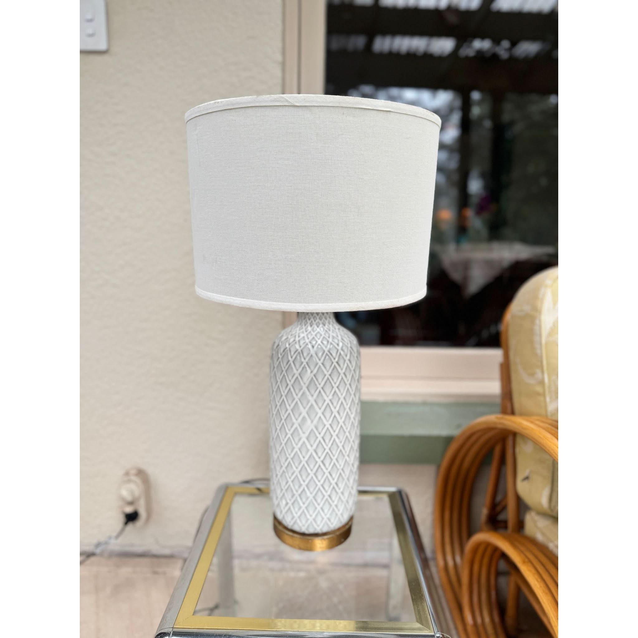 Made from ceramic with a white glaze we have a pair of these lamps in stock with matching drum shades, gold timber bases and brass fittings.