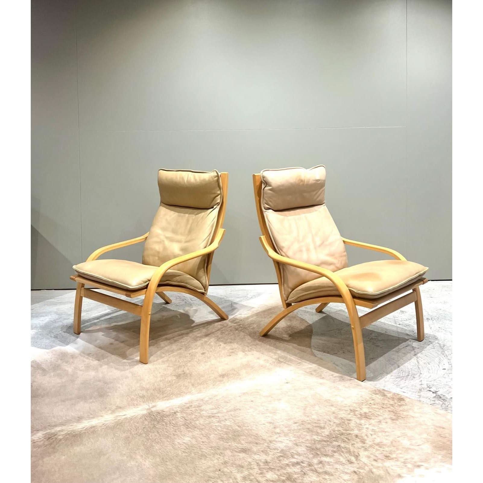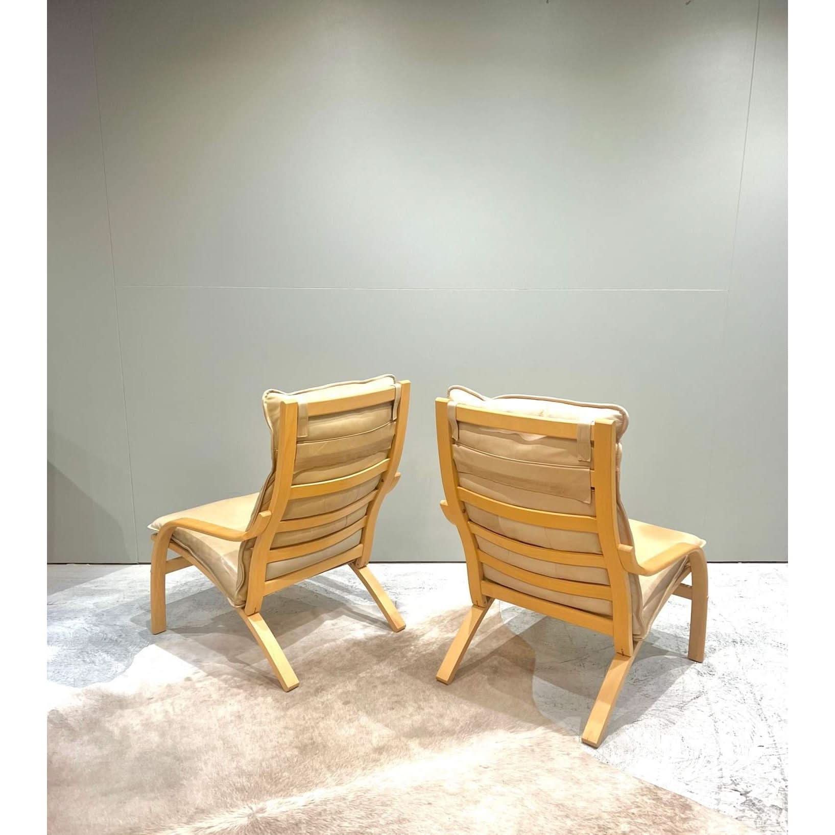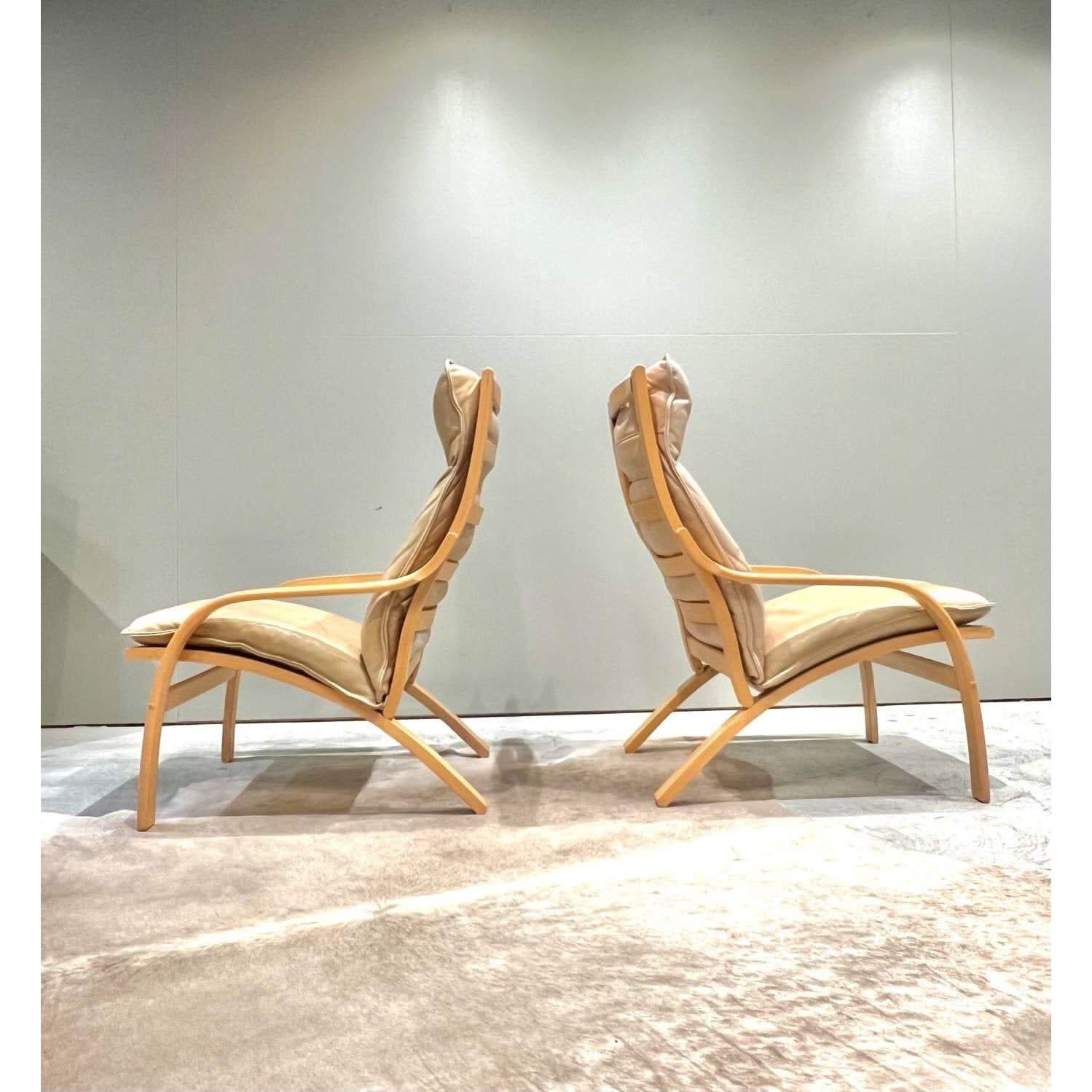 A pair of authentic Model 1 mid-century Scandinavian lounge chairs by Mogens Hansen for Stouby. Upholstered in butterscotch leather, with a blonde-wood frame.