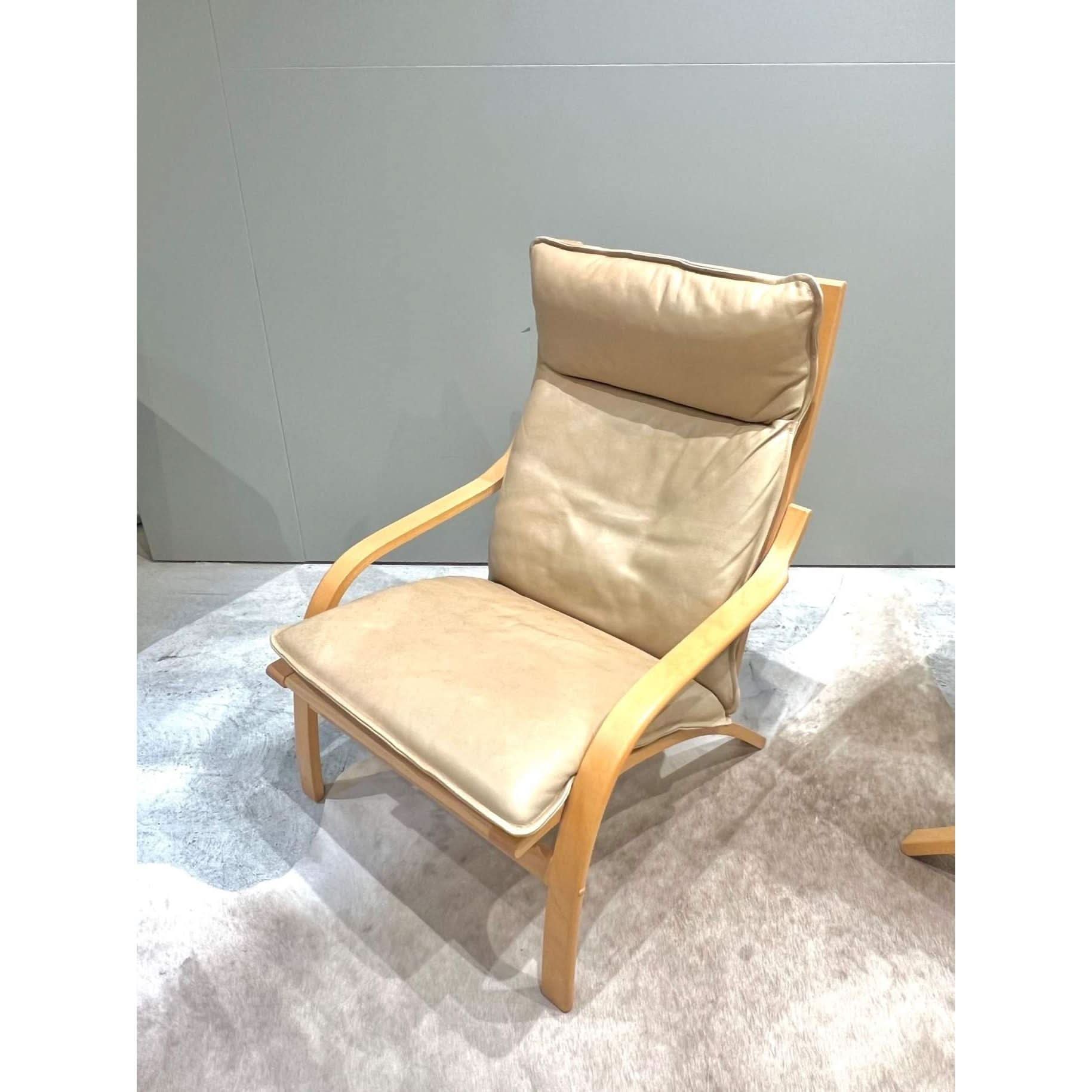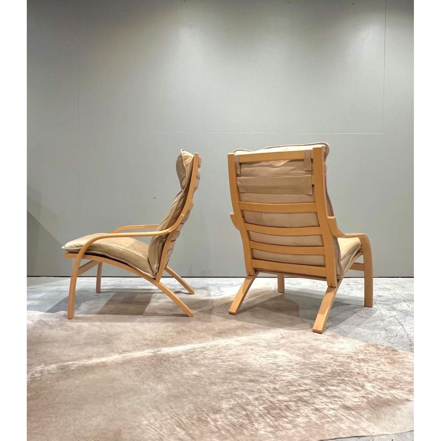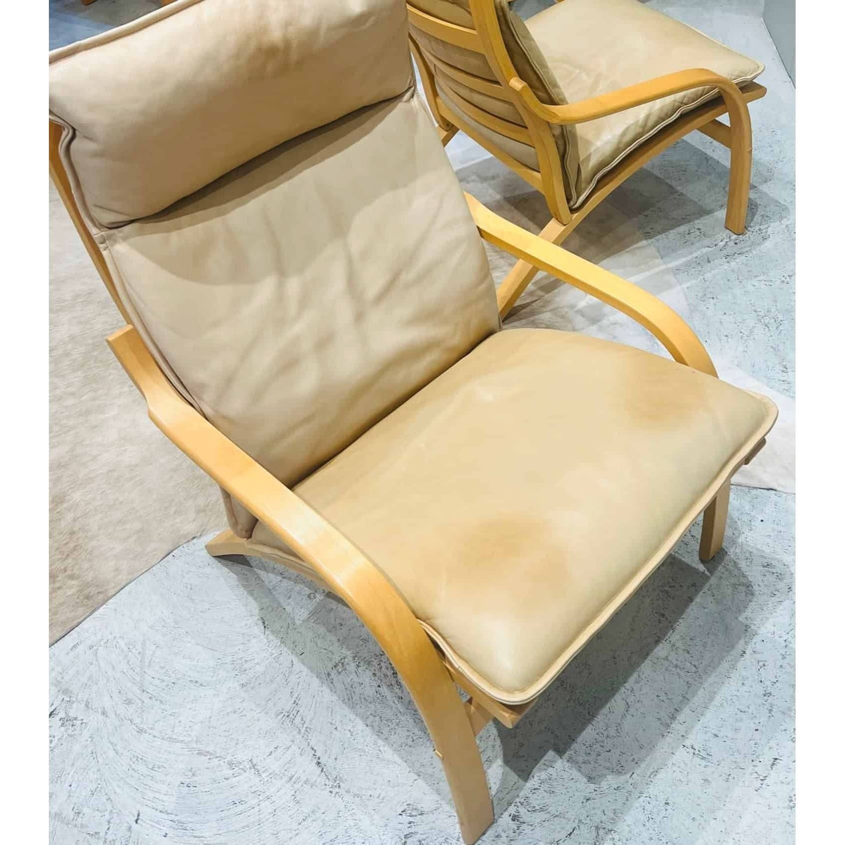A pair of authentic Model 1 mid-century Scandinavian lounge chairs by Mogens Hansen for Stouby. Upholstered in butterscotch leather, with a blonde-wood frame.
