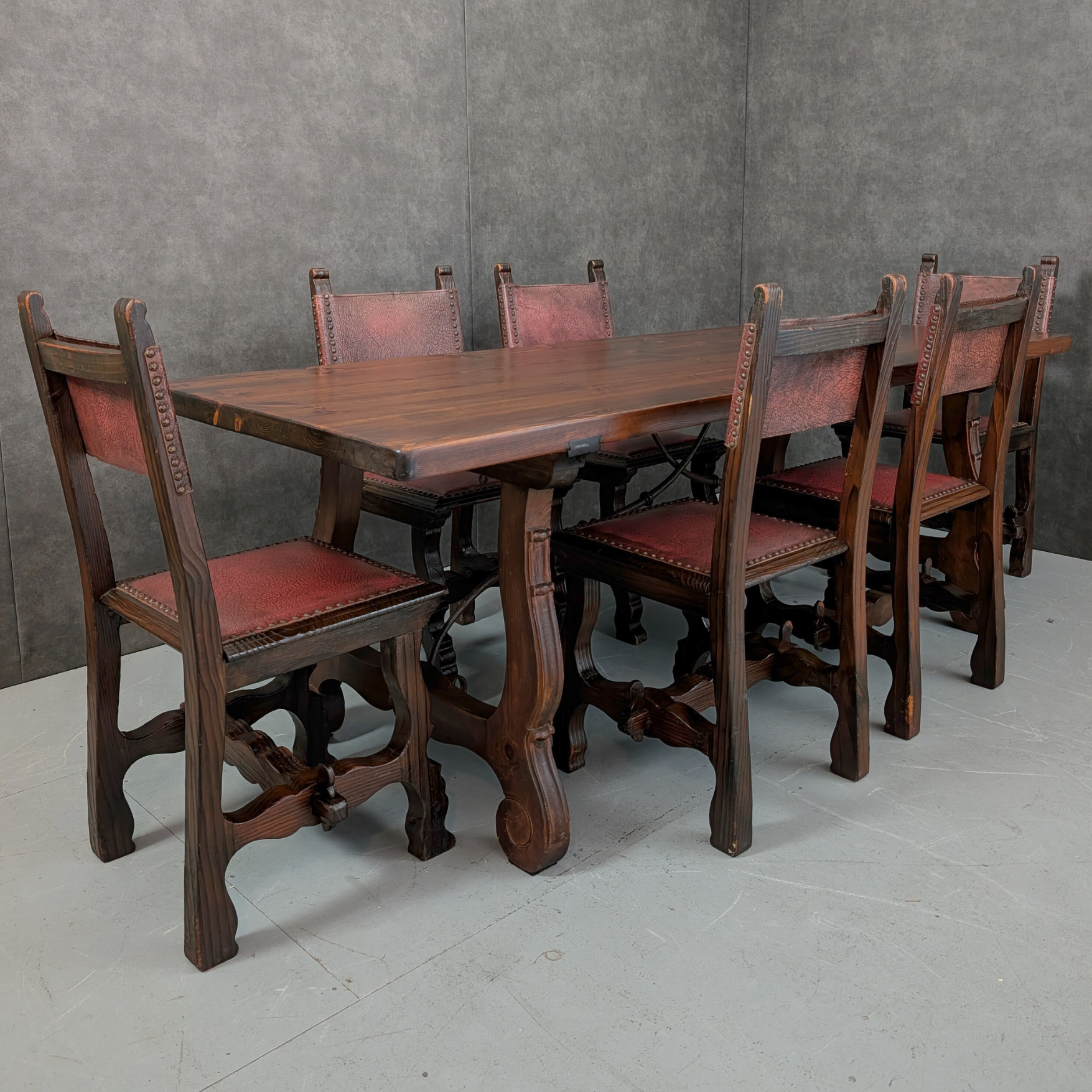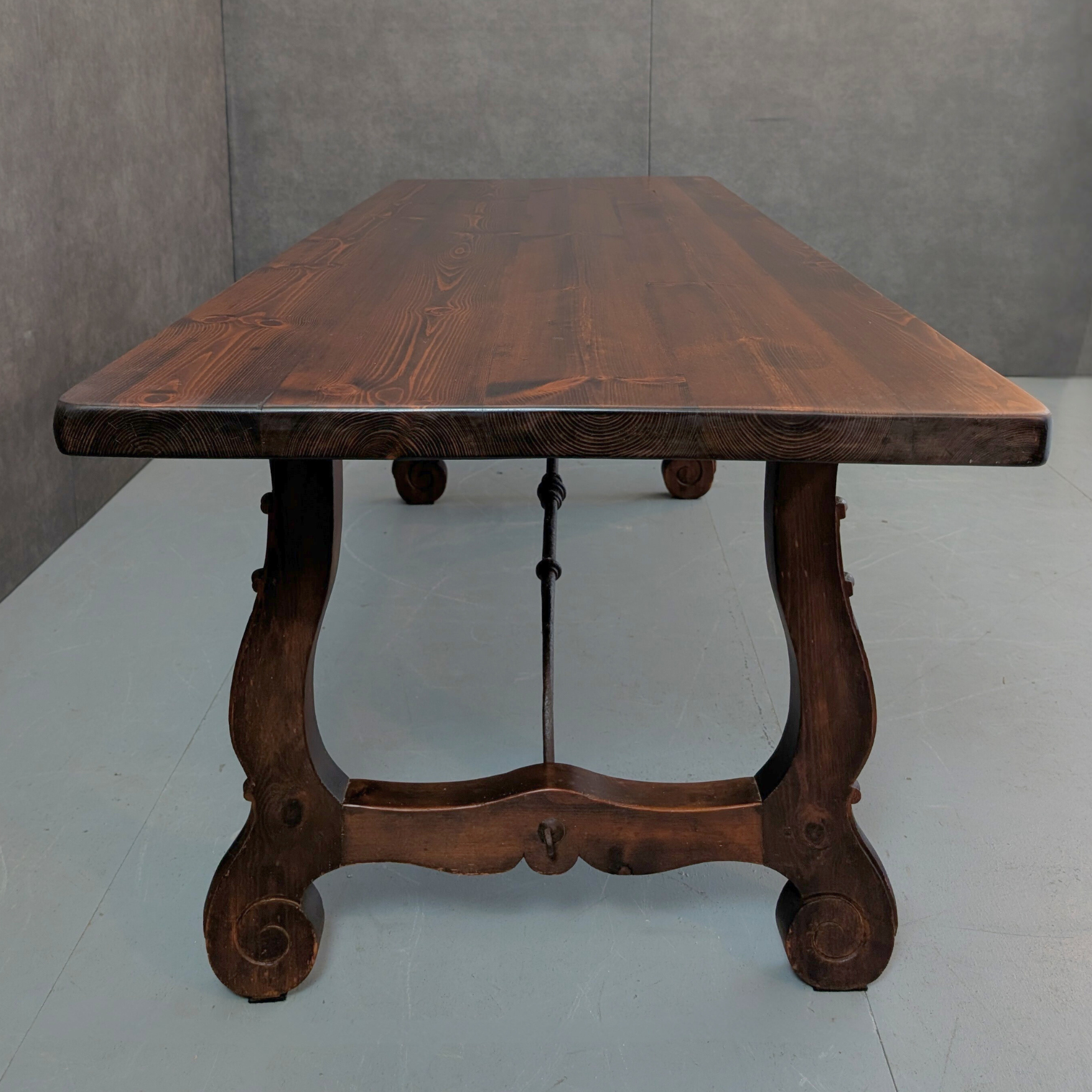 Hand crafted in Spain during the 19th century, this refectory table is formed from solid European chestnut, a timber long favoured across rural Spain for its durability, workability and pronounced grain. The top presents wide boards with strong latewood banding and depth of tone, sitting above shaped trestle ends joined by a forged iron stretcher that reinforces both structure and lineage. The scrolled feet and hand worked detailing speak to provincial craftsmanship rather than factory production. At 210 centimetres in length, it carries the scale and authority expected of a true refectory piece, built to serve generations and still entirely at ease in a contemporary interior.