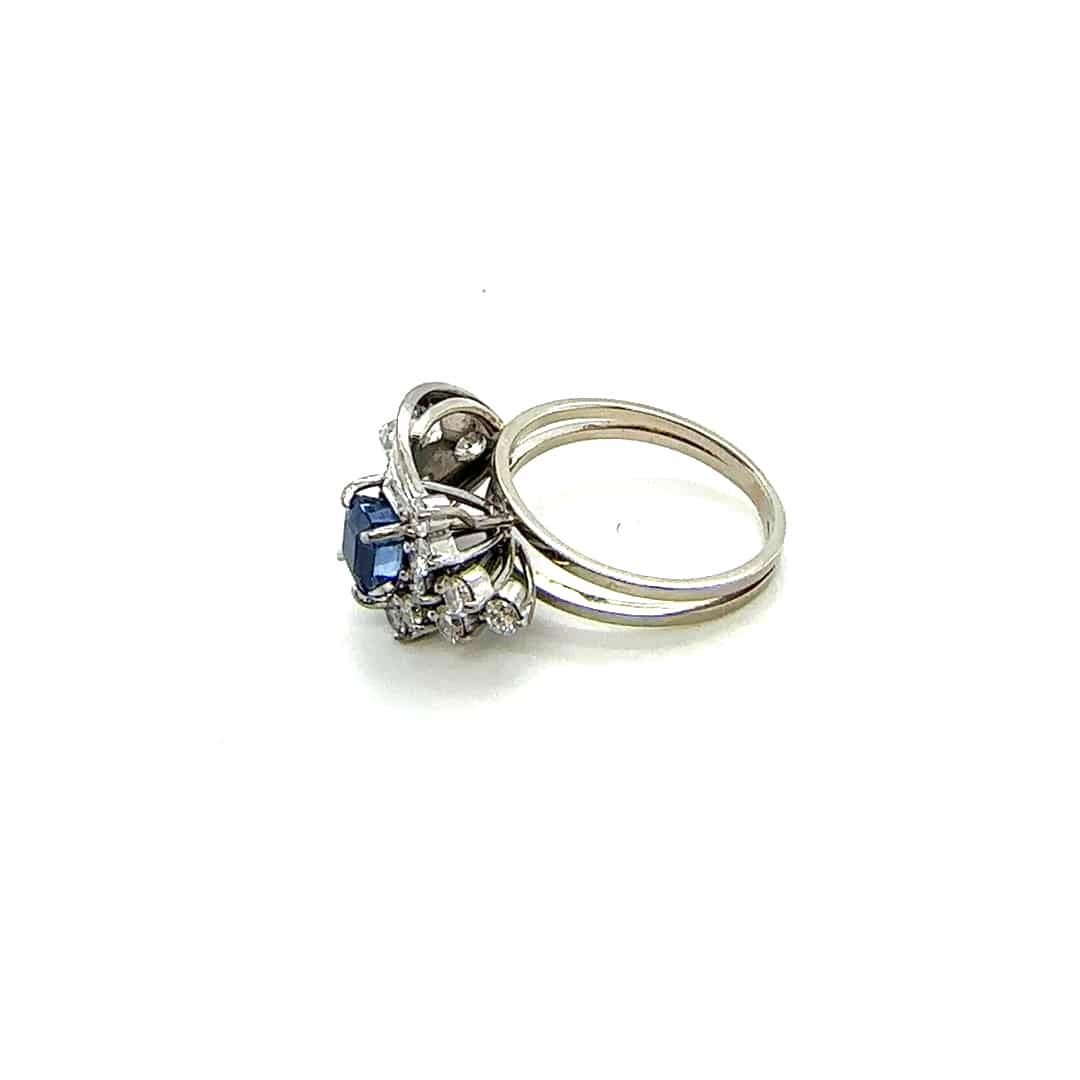 This ornate ring features one emerald cut mid-deep blue sapphire of 1.24ct. It is surrounded by eight round brilliant cut diamonds and six mixed old cut diamonds.