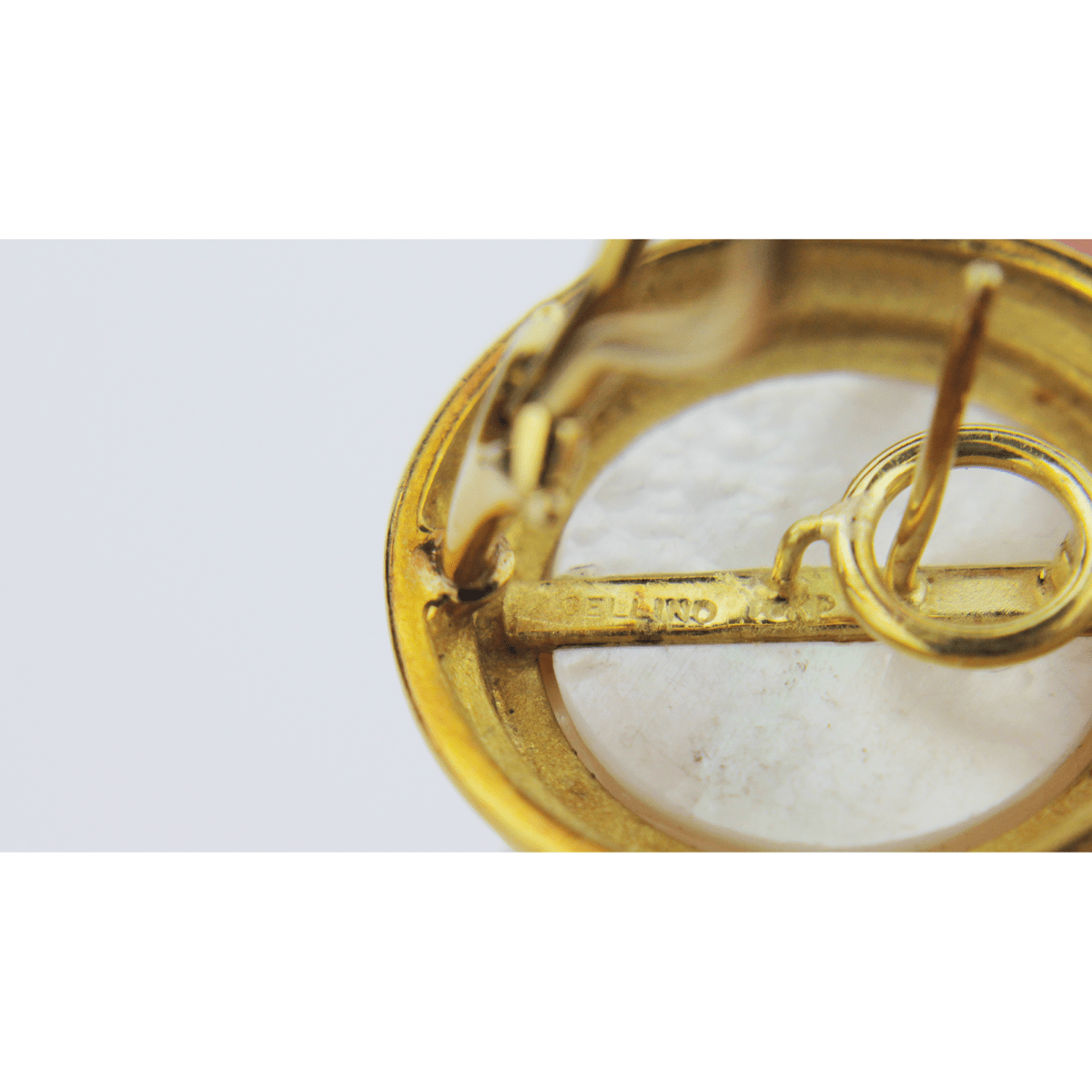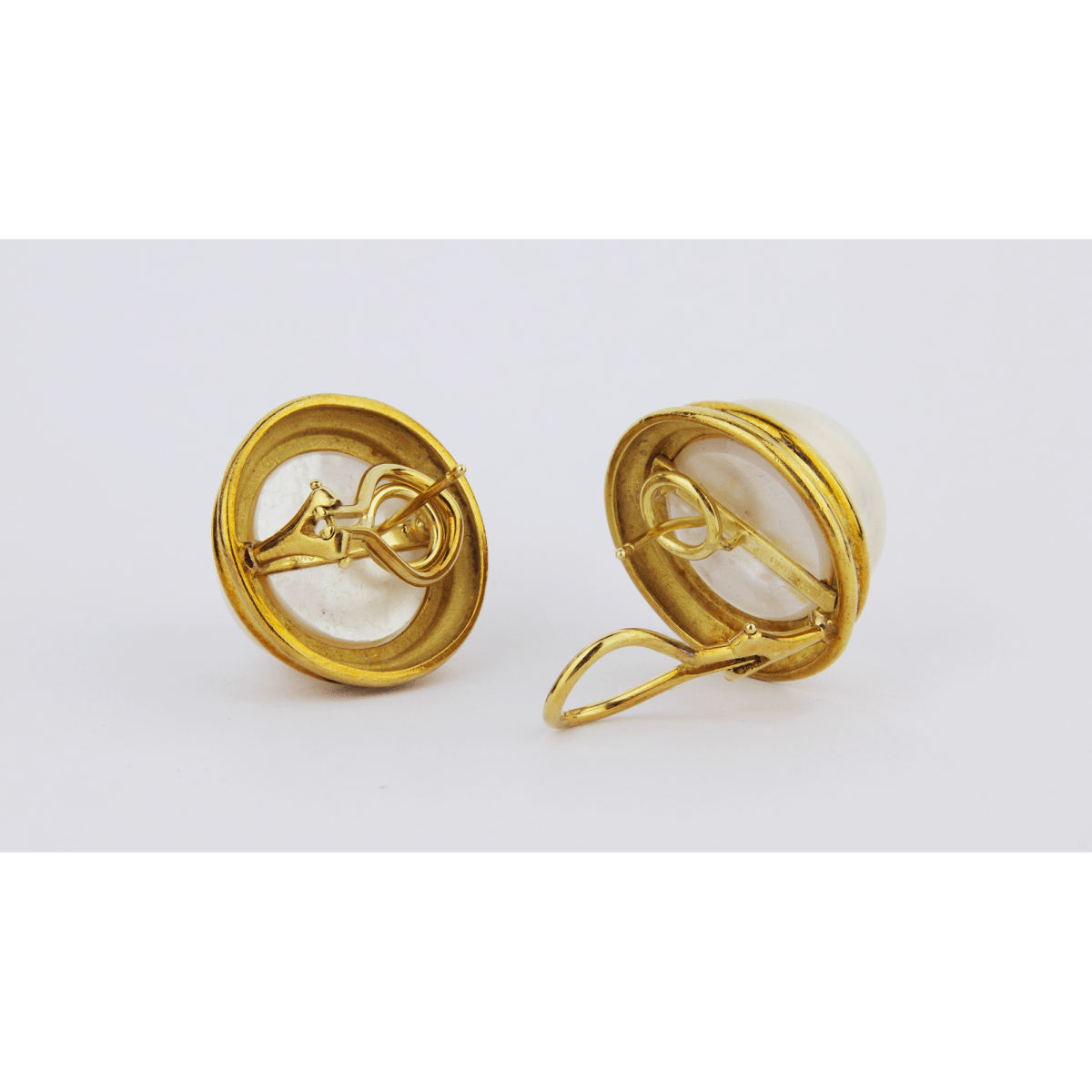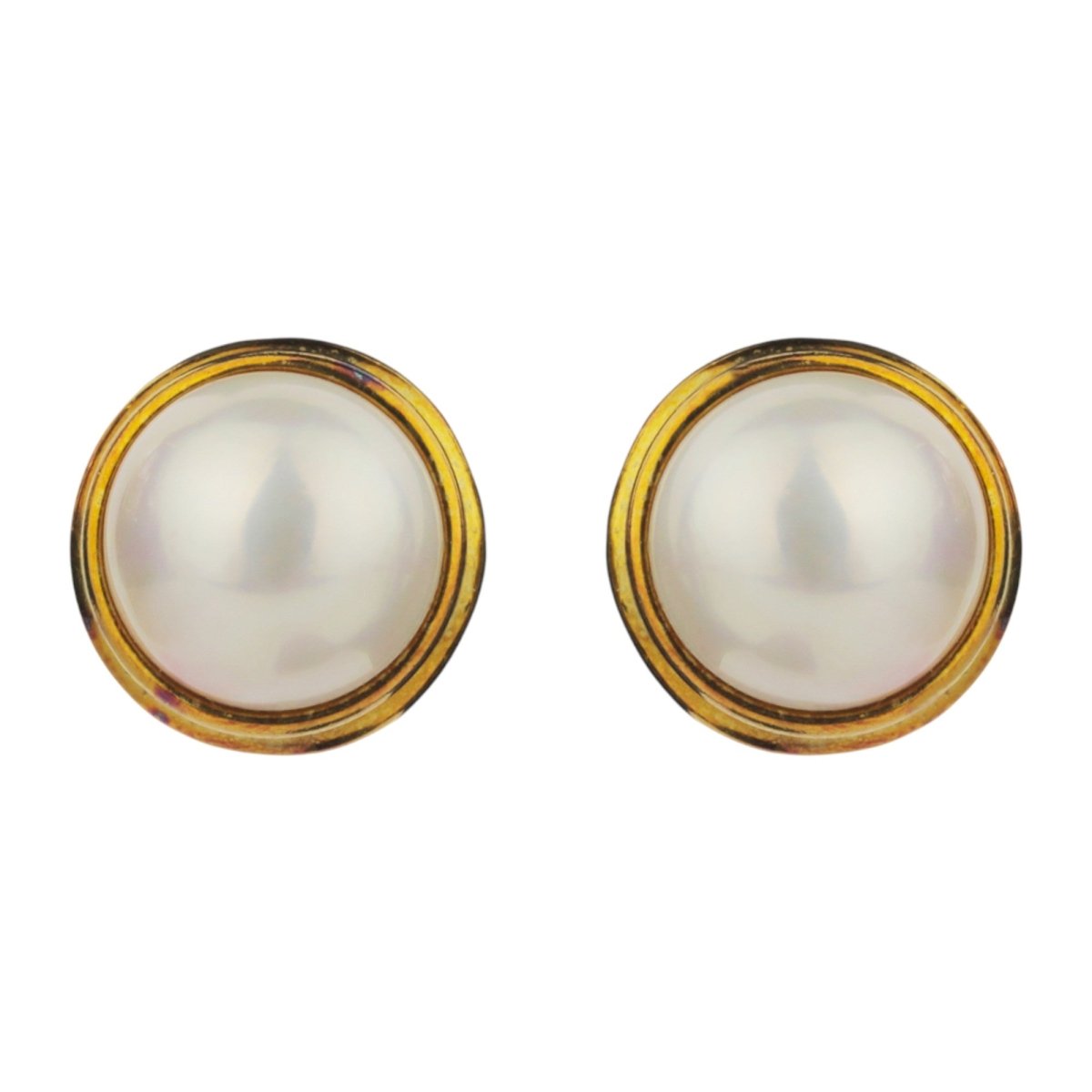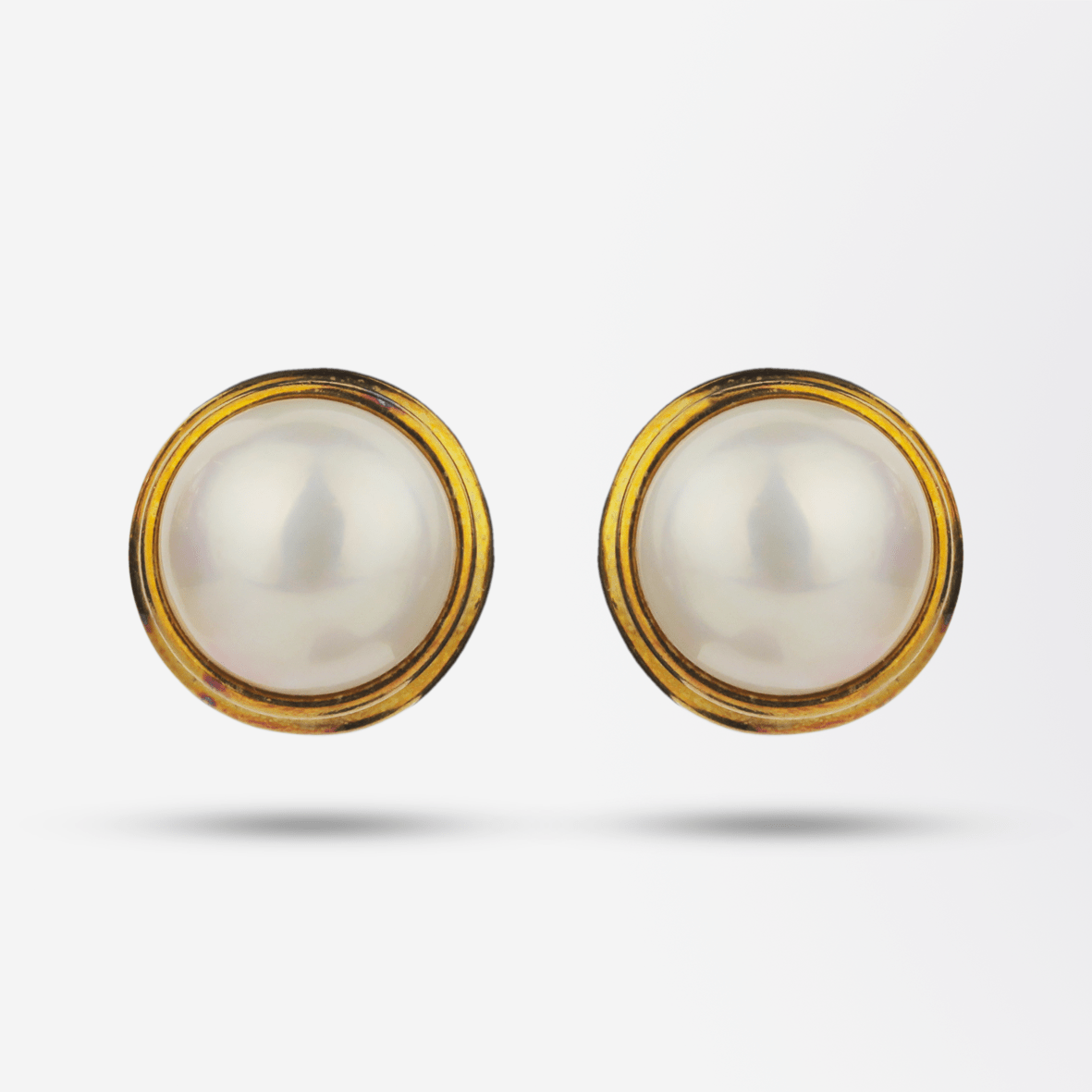 The standout quality of the mabe pearls in this pair of earrings is what makes them the elegant statement they truly are. Exceptional lustre and free of blemishes, they are accented by a simple frame of 18kt yellow gold. Marked '18K' and 'Cellino' to the rear, they have a post and a French clip to stabilise them on the ear.