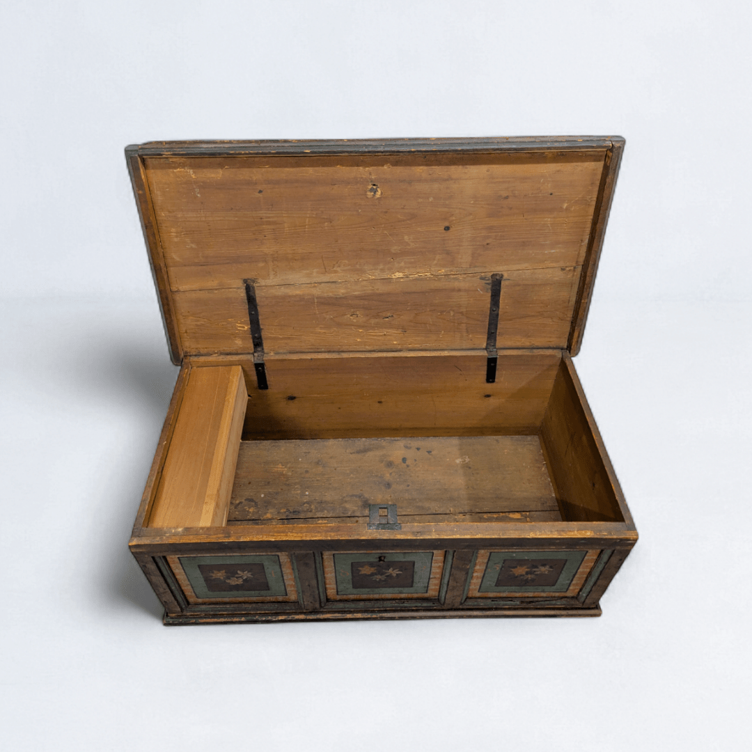 This example shows all the hallmarks of the type: heavy timber construction, forged ironwork, and front panels painted with stylised florals framed by linear borders. The surface carries its age with quiet dignity — patina layered across centuries, yet with colour and motif intact. Inside, the chest remains well preserved, including its original candle-box compartment.