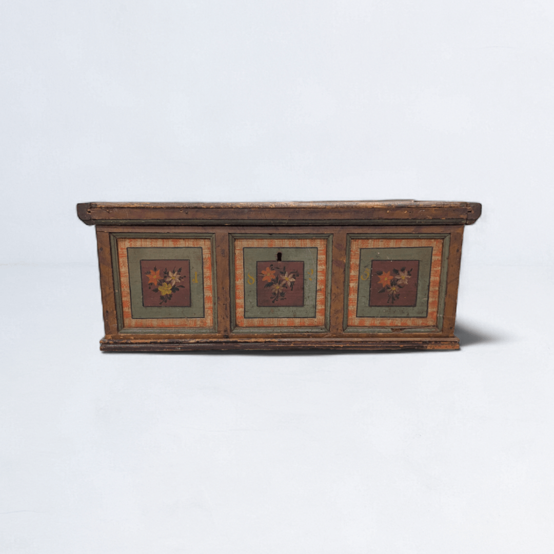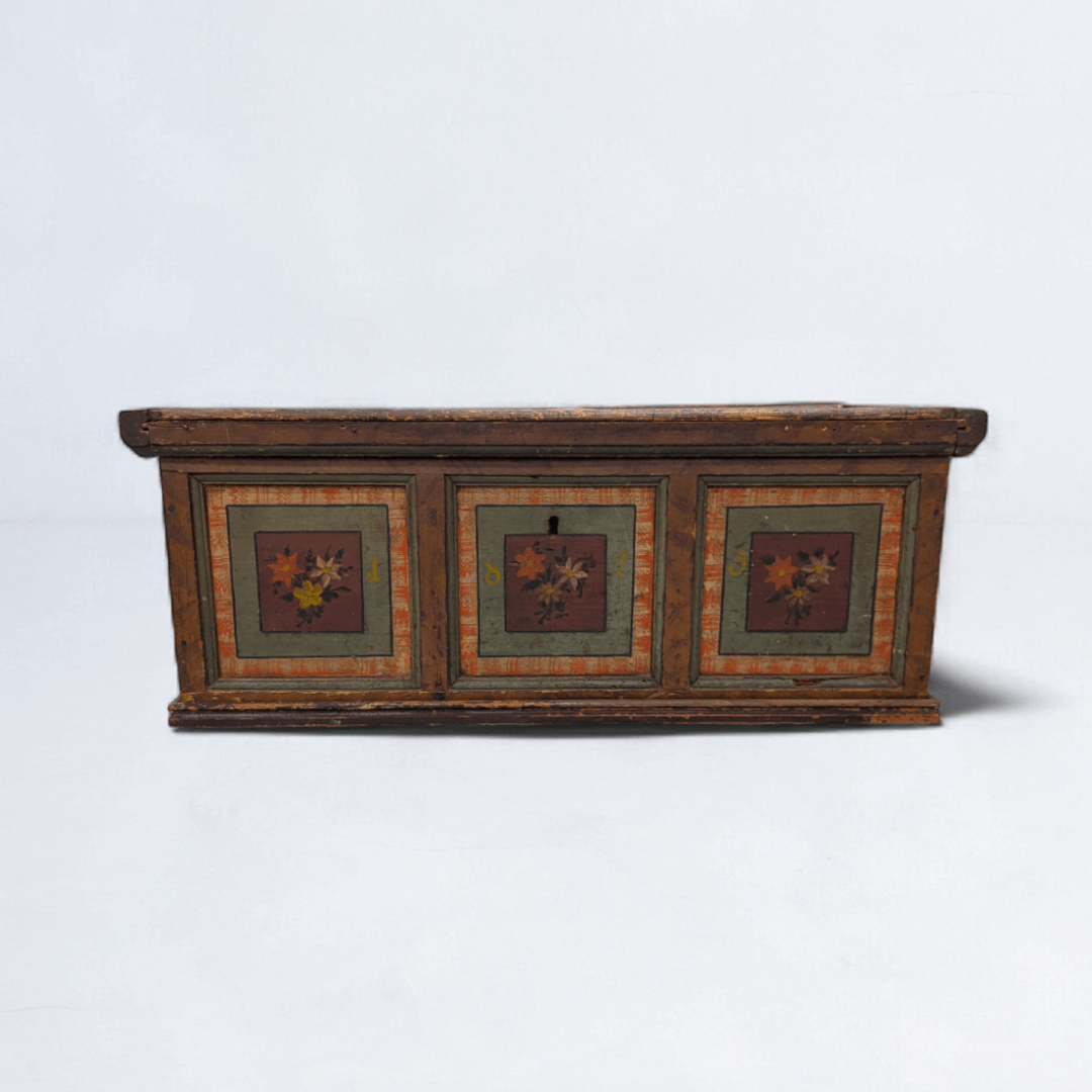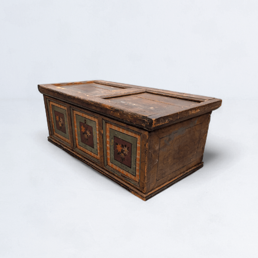 An authentic Alpine dowry chest, hand-painted with floral panels in rich tones of red, green, and ochre. Originating from the Tyrol / Alpine region of Central Europe, these chests were traditionally commissioned for marriage, serving both as storage and as a symbolic vessel of lineage, prosperity, and craft.