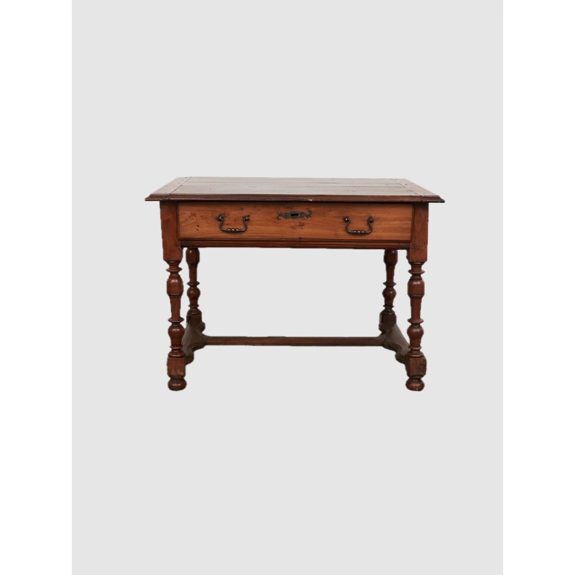 An 18thc French Walnut table with drawer , turned legs on a stretcher base.