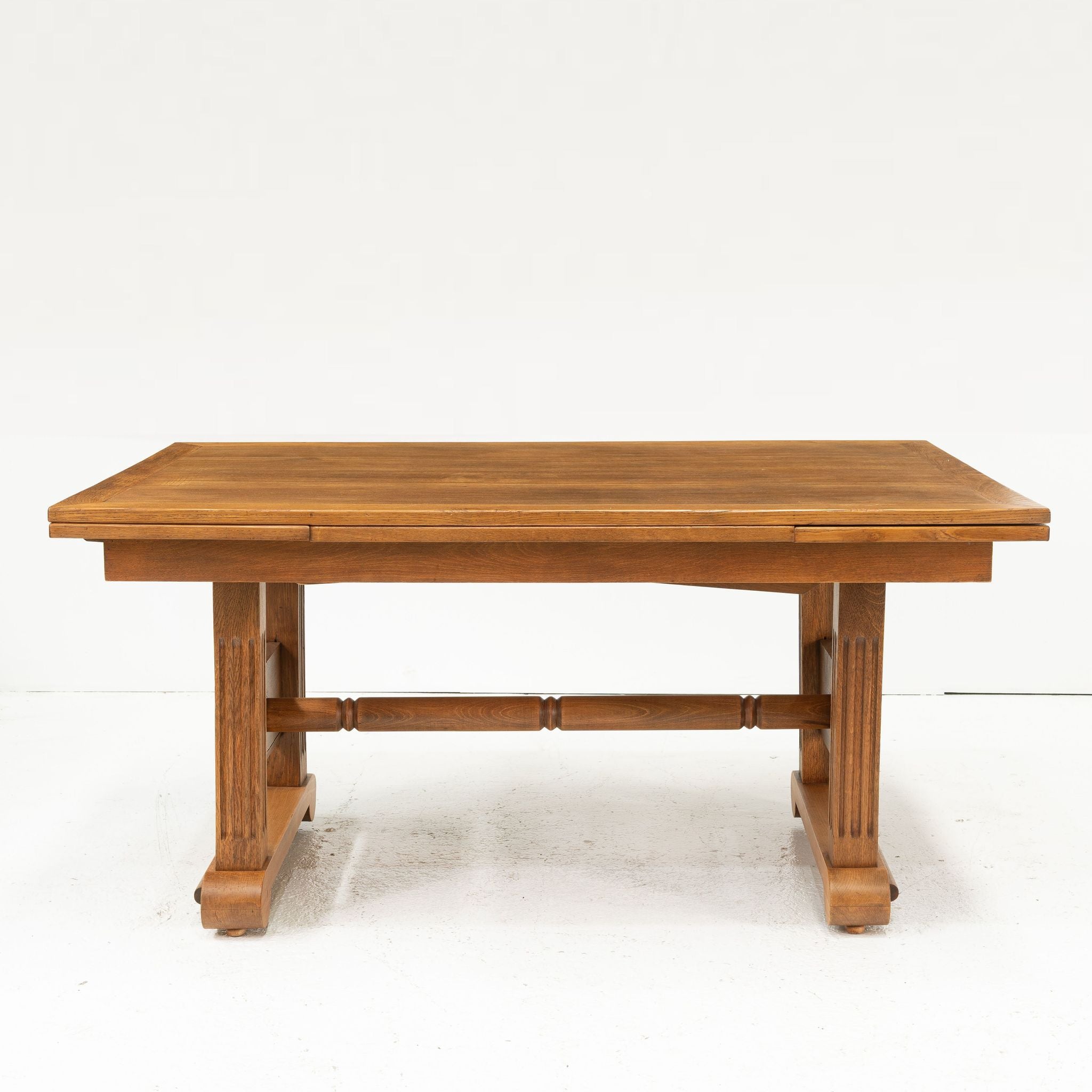 The rectangular top opening to two extensions, above four reeded legs with three concentric circles with central stretcher