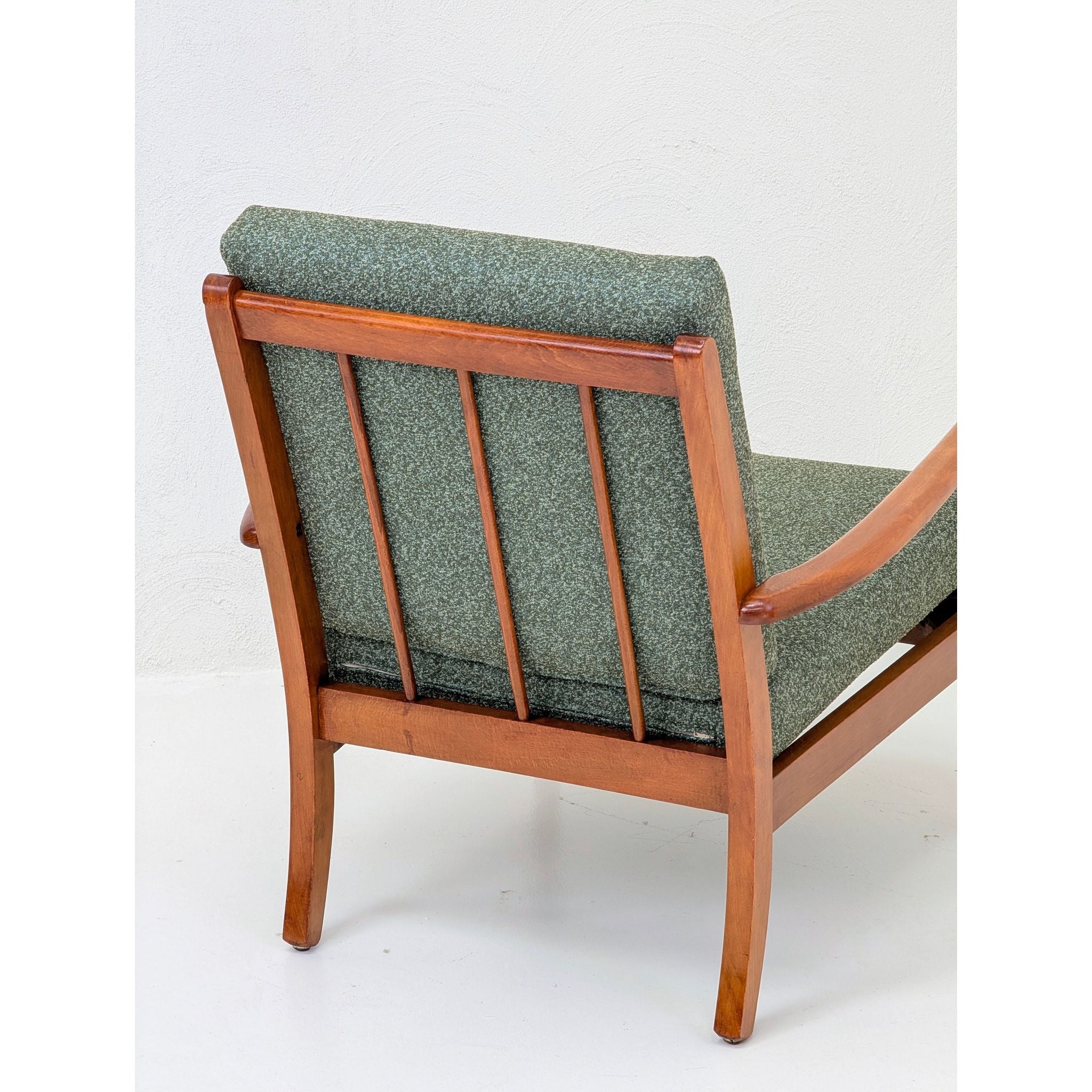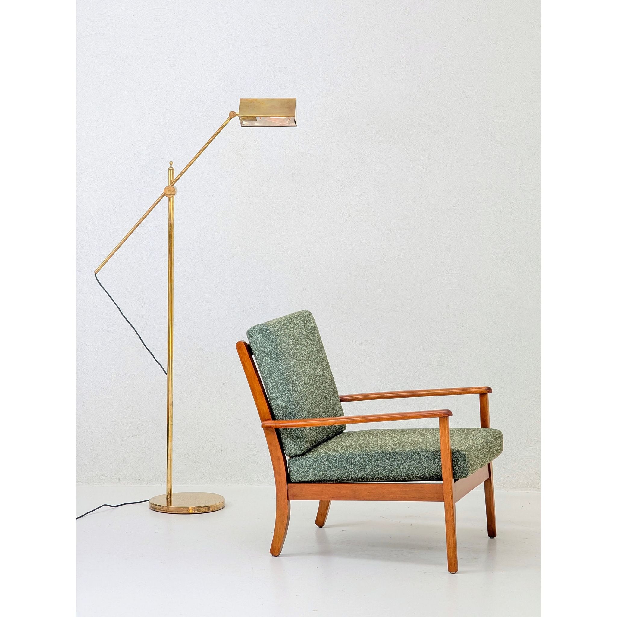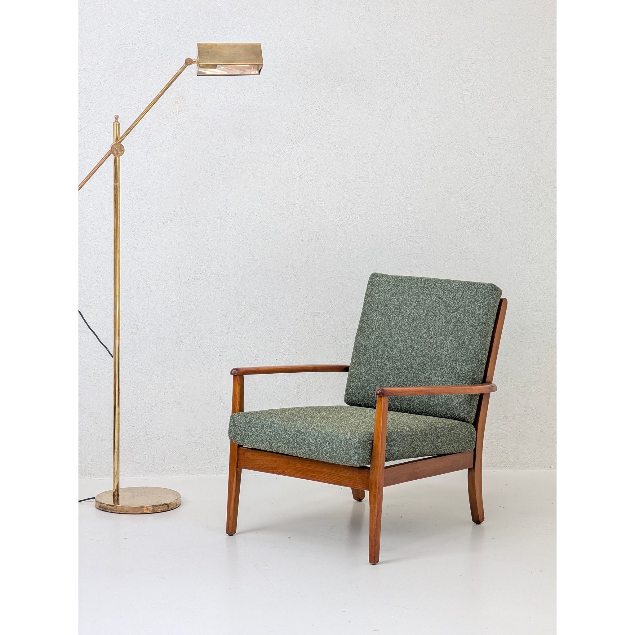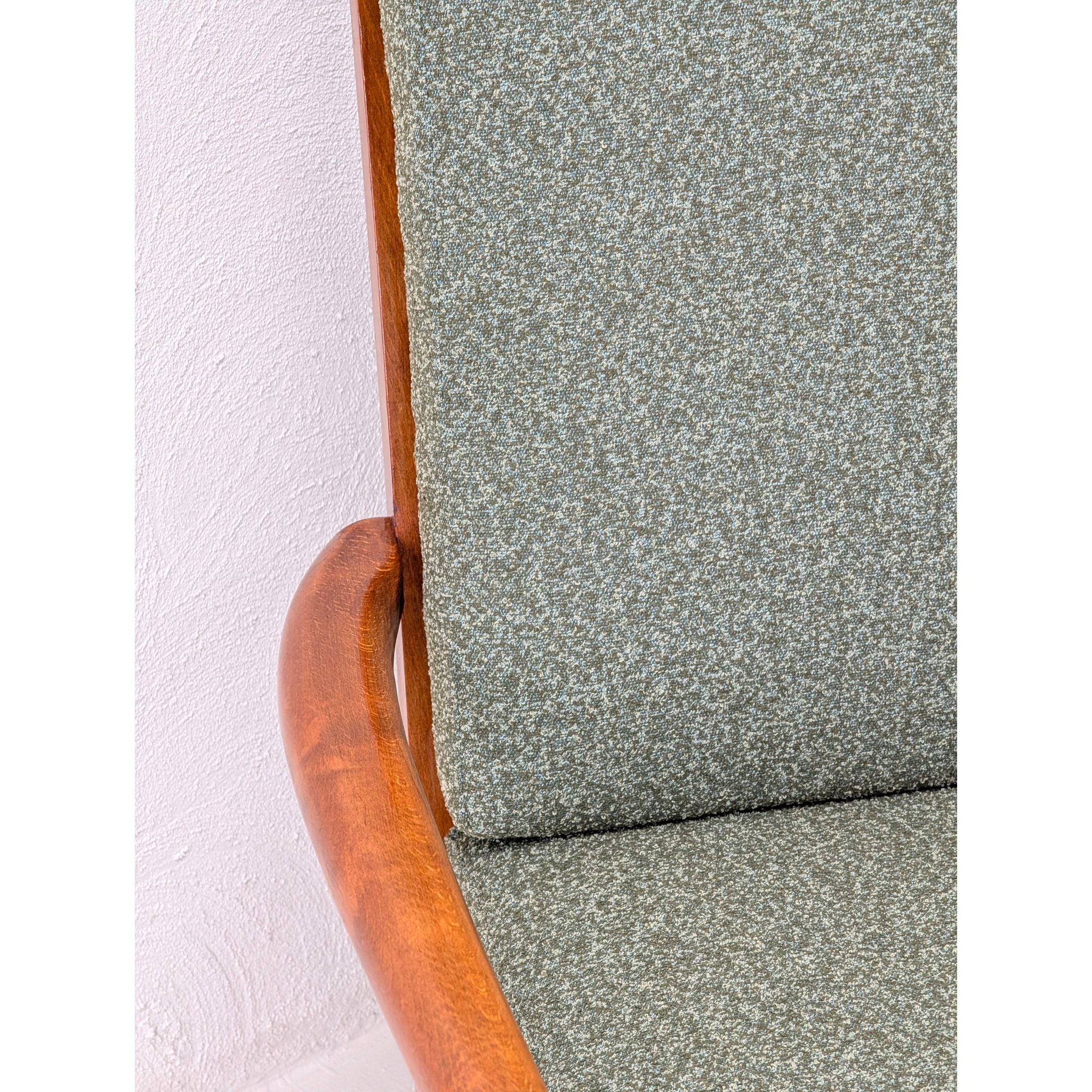 Newly upholstered in Warwick Halo easy-care fabric in a rich Olive tone. This textile features a refined textured weave, providing a soft, tactile contrast to the structural oak frame. Engineered to be stain-resistant and durable, it ensures this functional piece of mid-century art is as practical as it is beautiful.