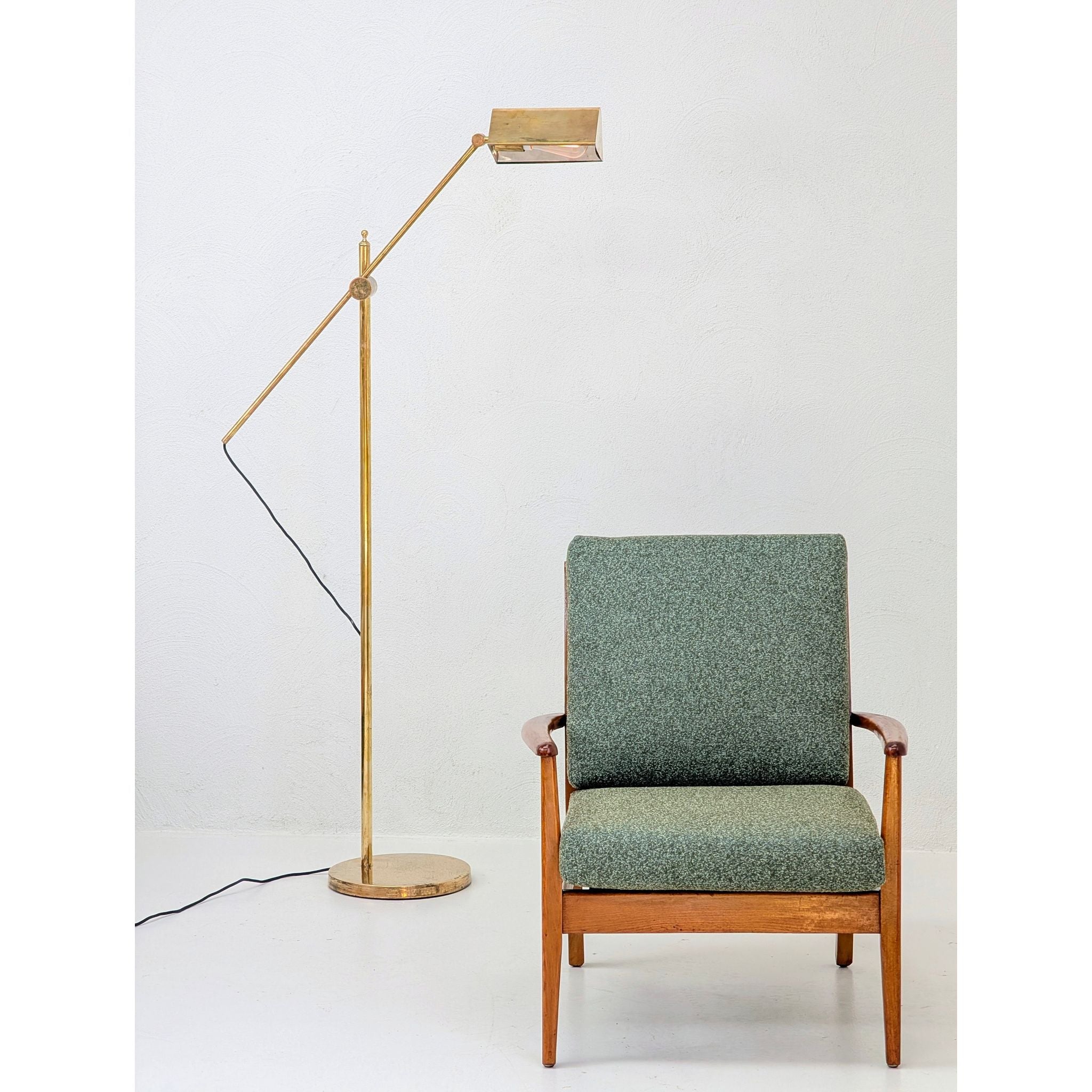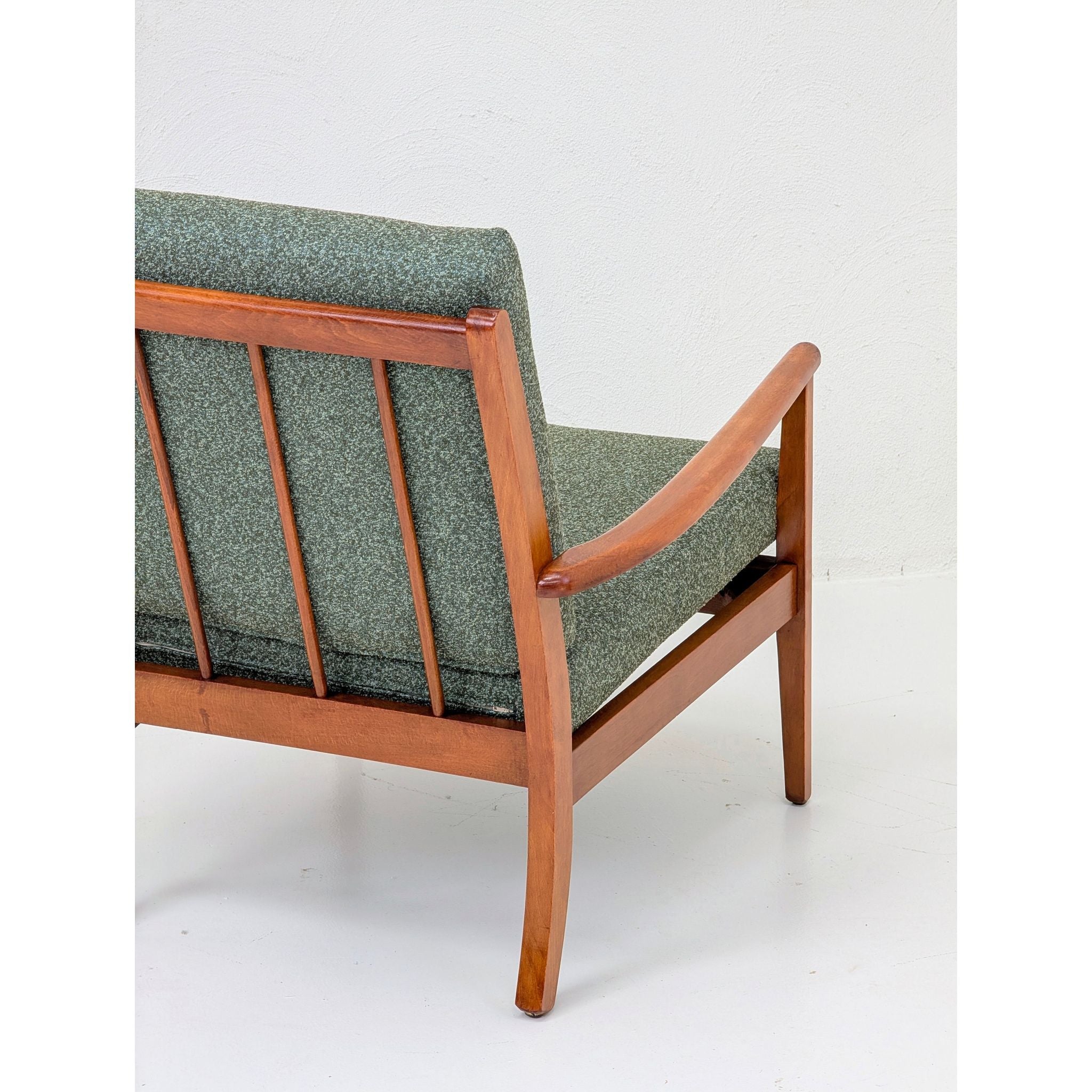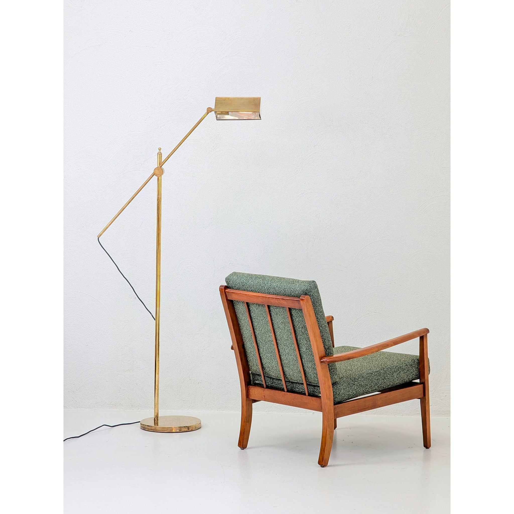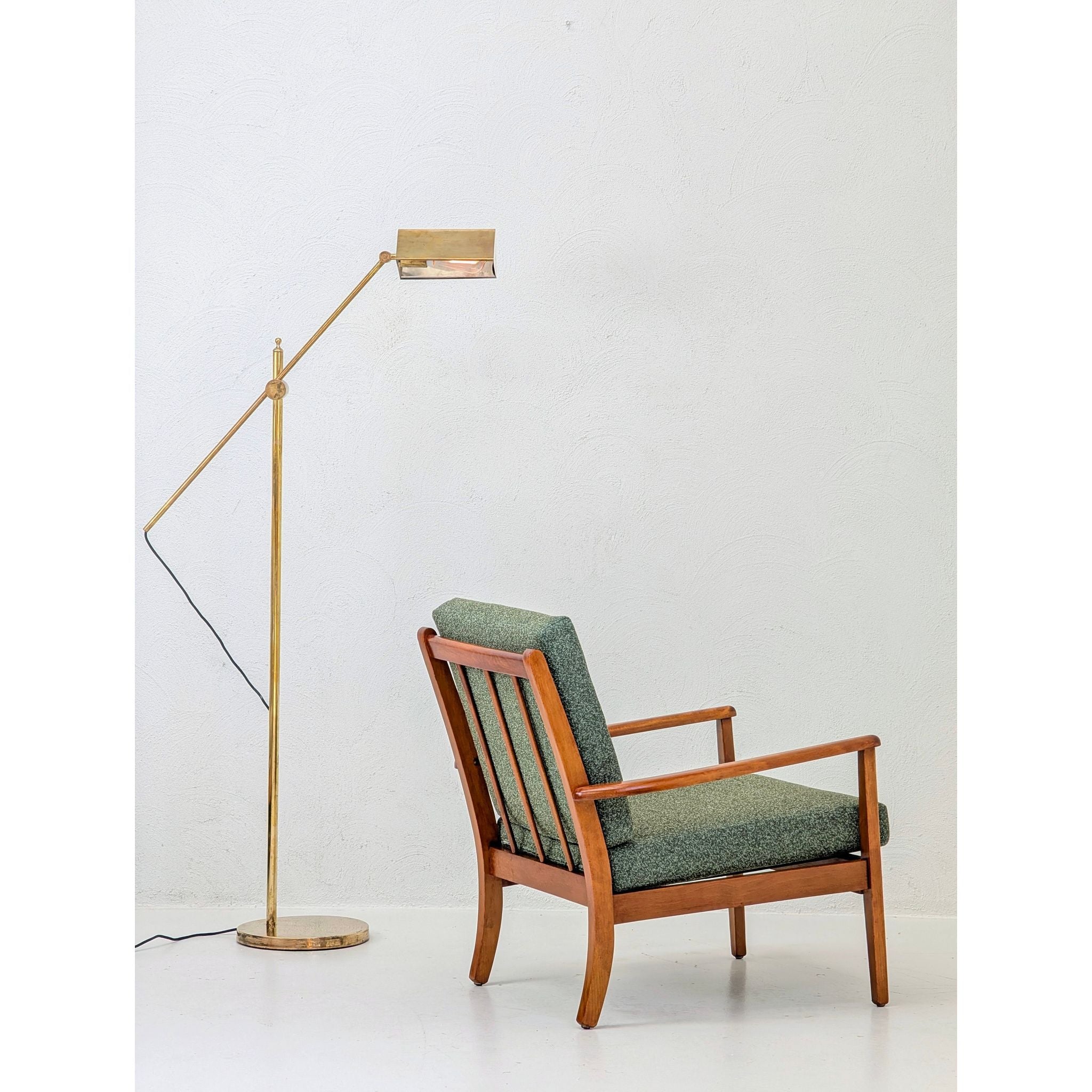 Newly upholstered in Warwick Halo easy-care fabric in a rich Olive tone. This textile features a refined textured weave, providing a soft, tactile contrast to the structural oak frame. Engineered to be stain-resistant and durable, it ensures this functional piece of mid-century art is as practical as it is beautiful.