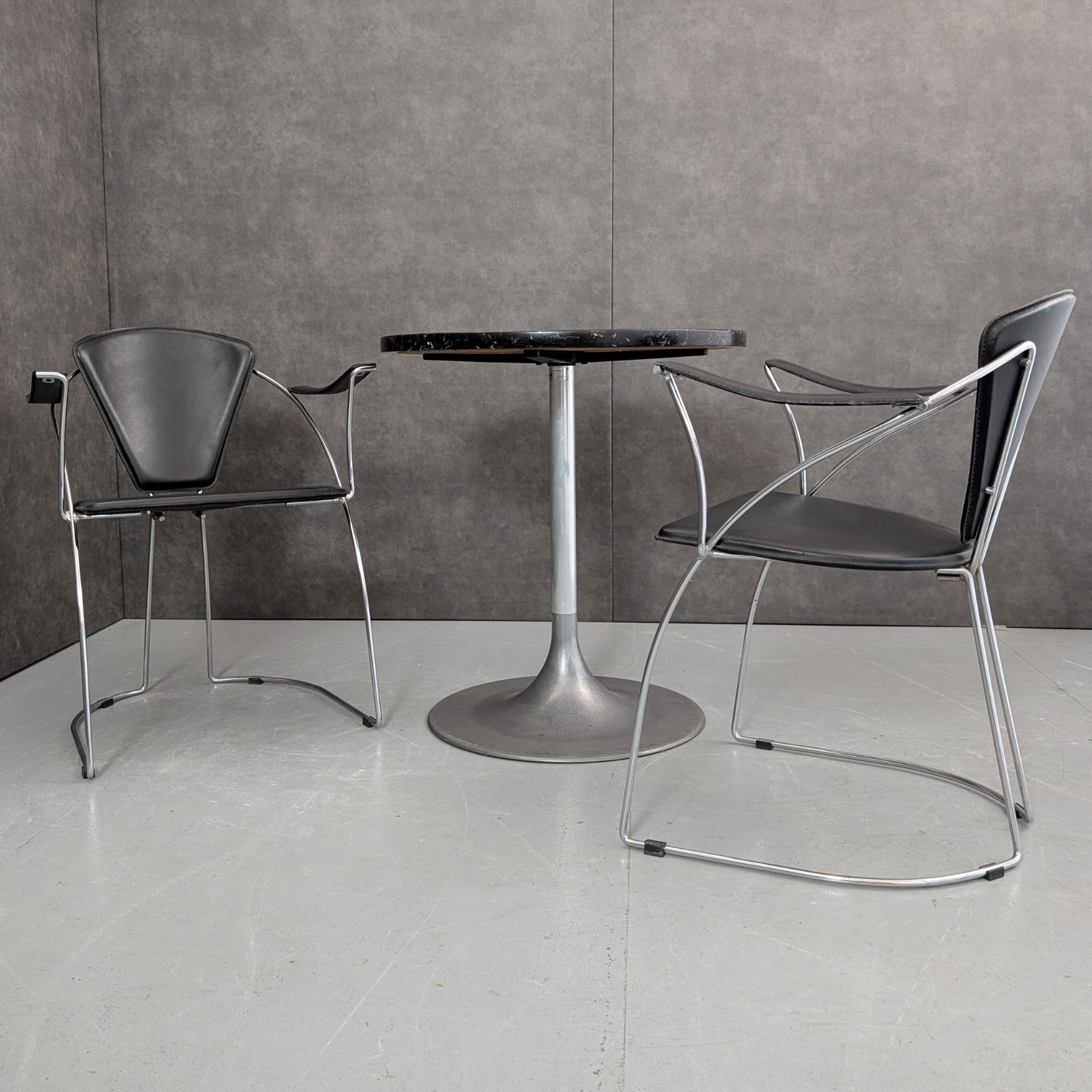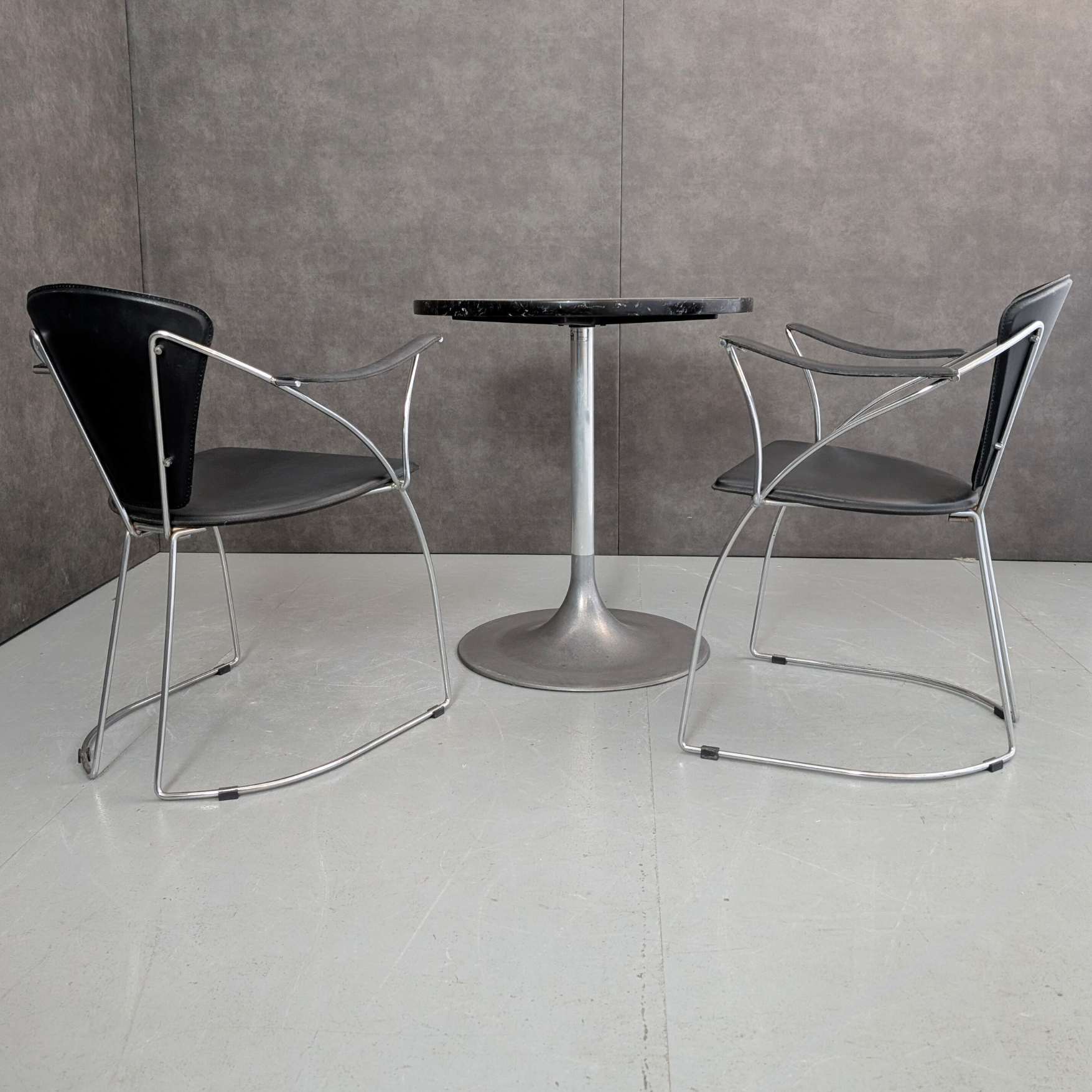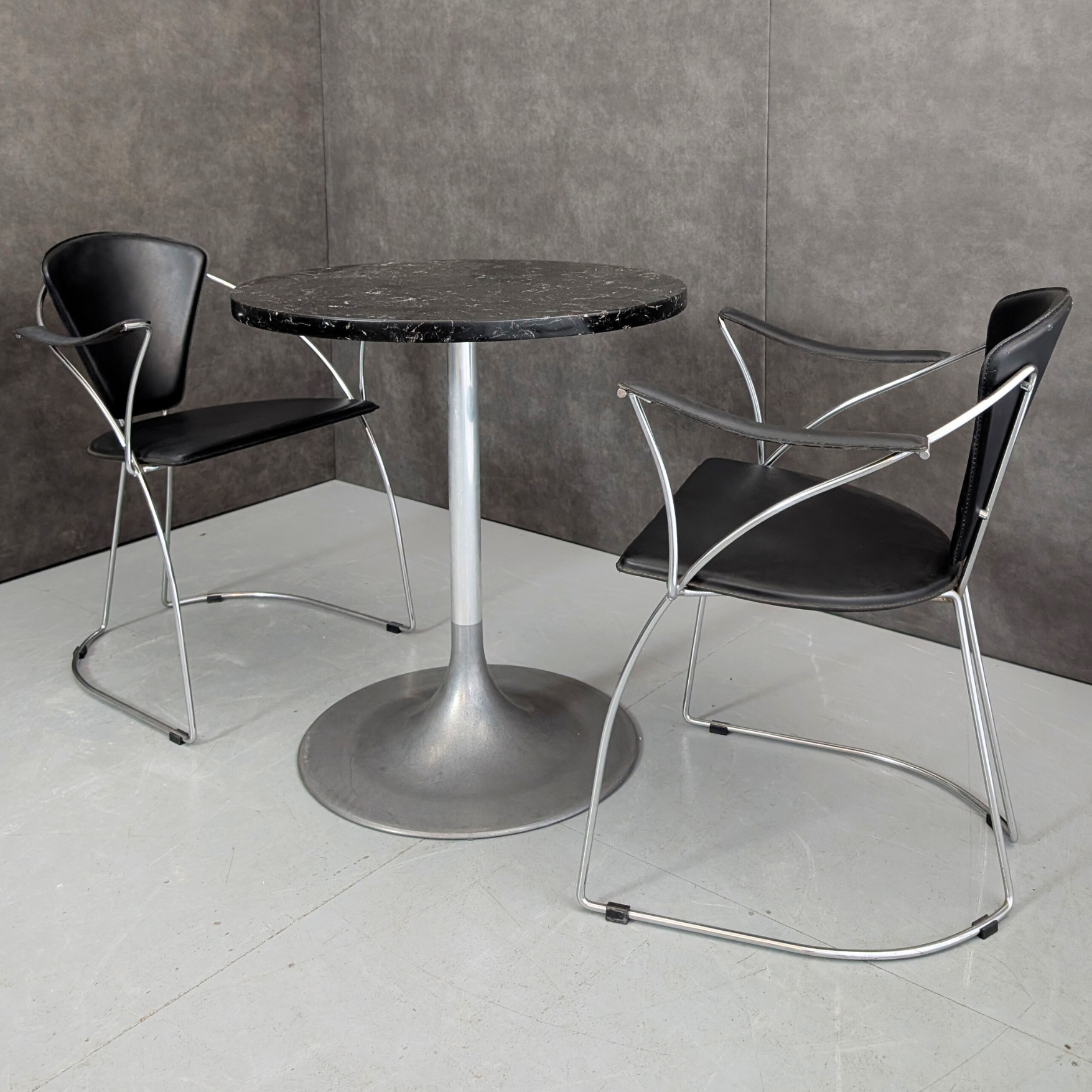 Produced in Italy during the 1960s, the aluminium pedestal table reflects the modernist pursuit of a single unified base, removing the obstruction of four legs and allowing greater freedom around the table. The cast aluminium base and column express the era’s fascination with industrial materials brought into domestic settings, while the black stone top introduces weight and contrast. Paired here with Arrben Linda chairs from 1980s Italy, the chrome cantilever frame carries original black saddle leather in a composition that refined the Bauhaus lineage into something leaner and more precise. Together they create a compact dining setting that suits apartment living, studio workspaces, or a kitchen corner where material contrast and disciplined Italian design carry the room.