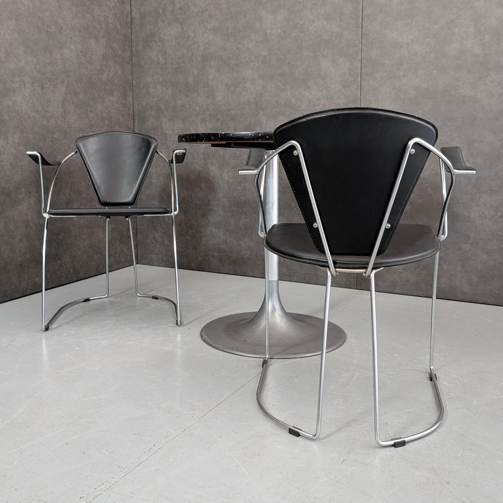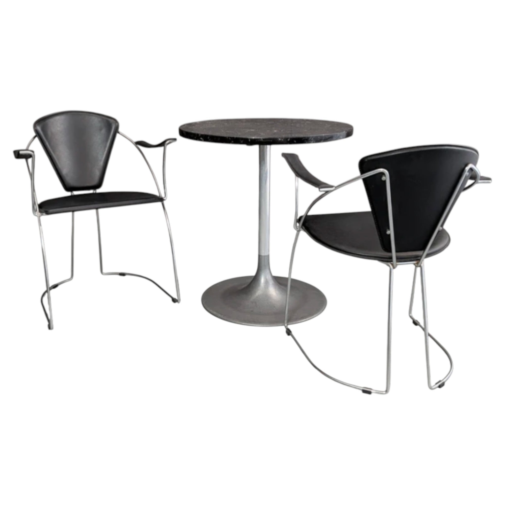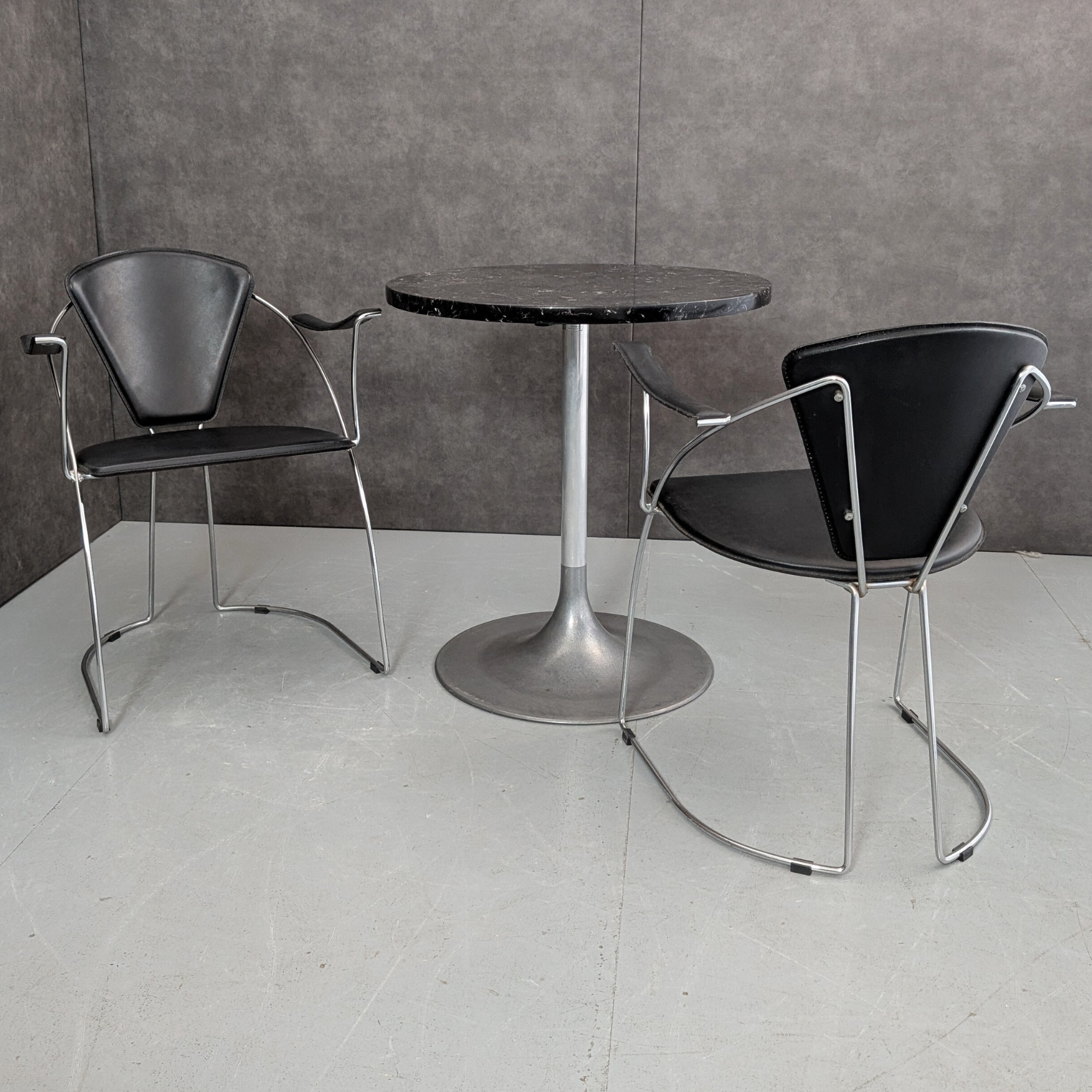 Produced in Italy during the 1960s, the aluminium pedestal table reflects the modernist pursuit of a single unified base, removing the obstruction of four legs and allowing greater freedom around the table. The cast aluminium base and column express the era’s fascination with industrial materials brought into domestic settings, while the black stone top introduces weight and contrast. Paired here with Arrben Linda chairs from 1980s Italy, the chrome cantilever frame carries original black saddle leather in a composition that refined the Bauhaus lineage into something leaner and more precise. Together they create a compact dining setting that suits apartment living, studio workspaces, or a kitchen corner where material contrast and disciplined Italian design carry the room.