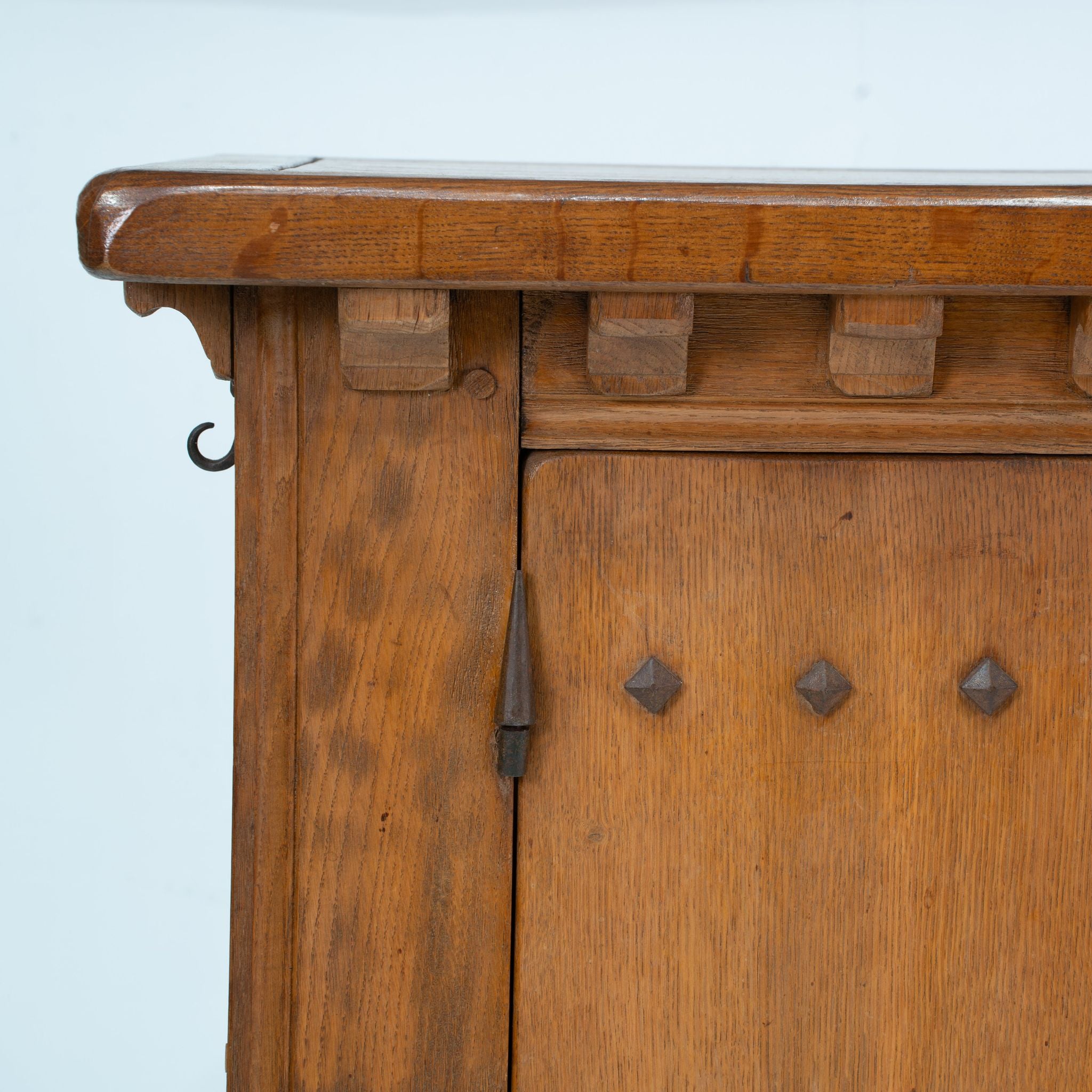 The four cabinet doors with applied overscale nailheads and escutcheons, opening to reveal a single shelf