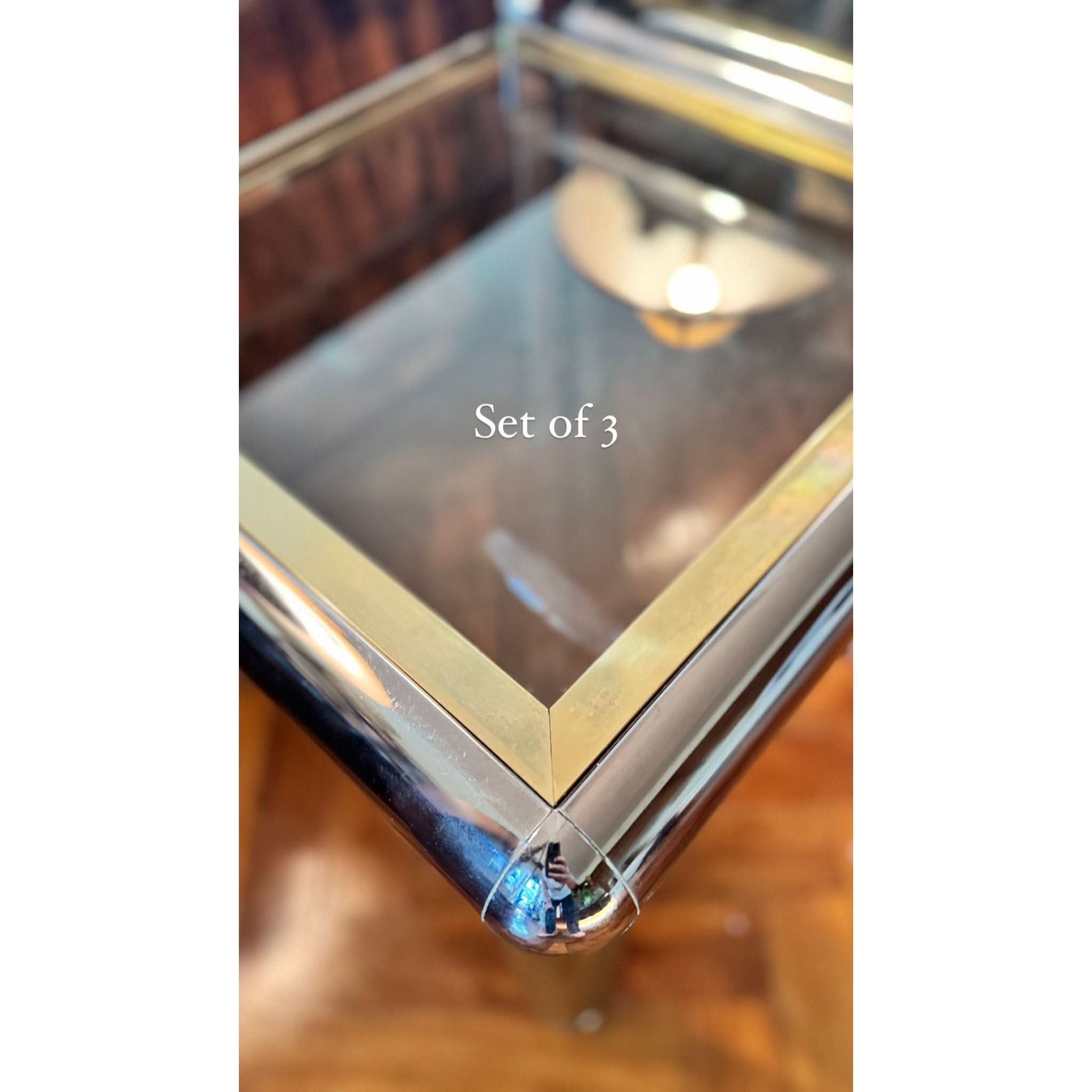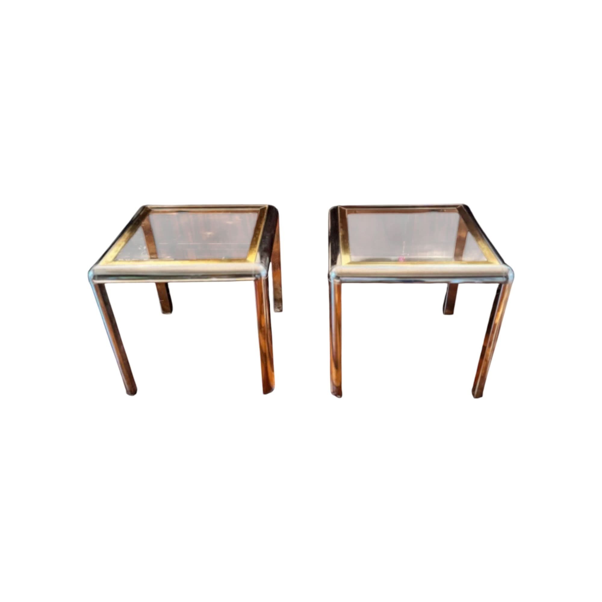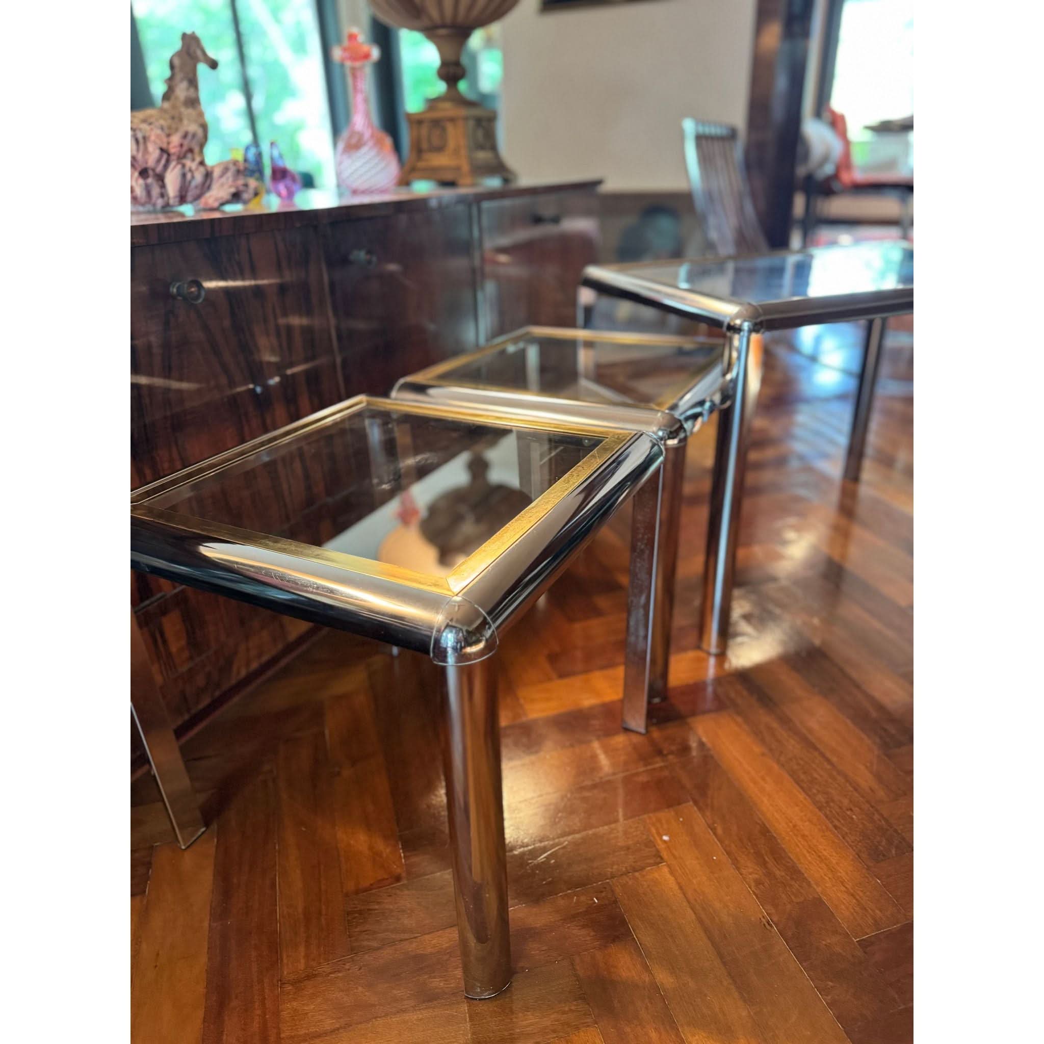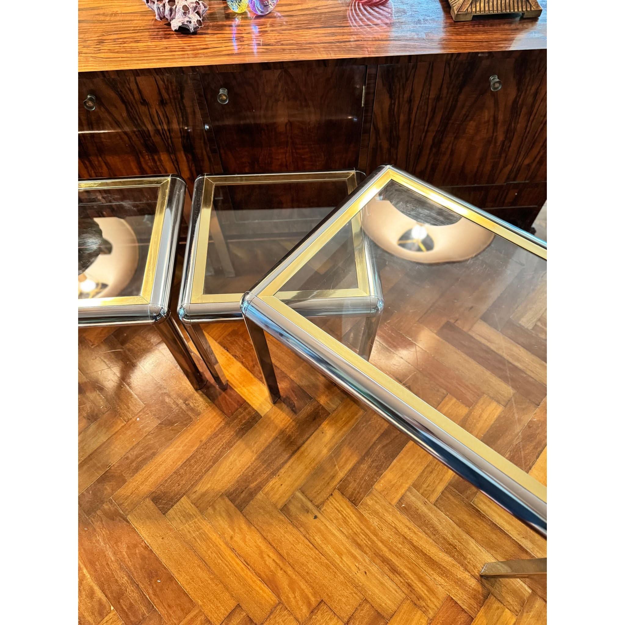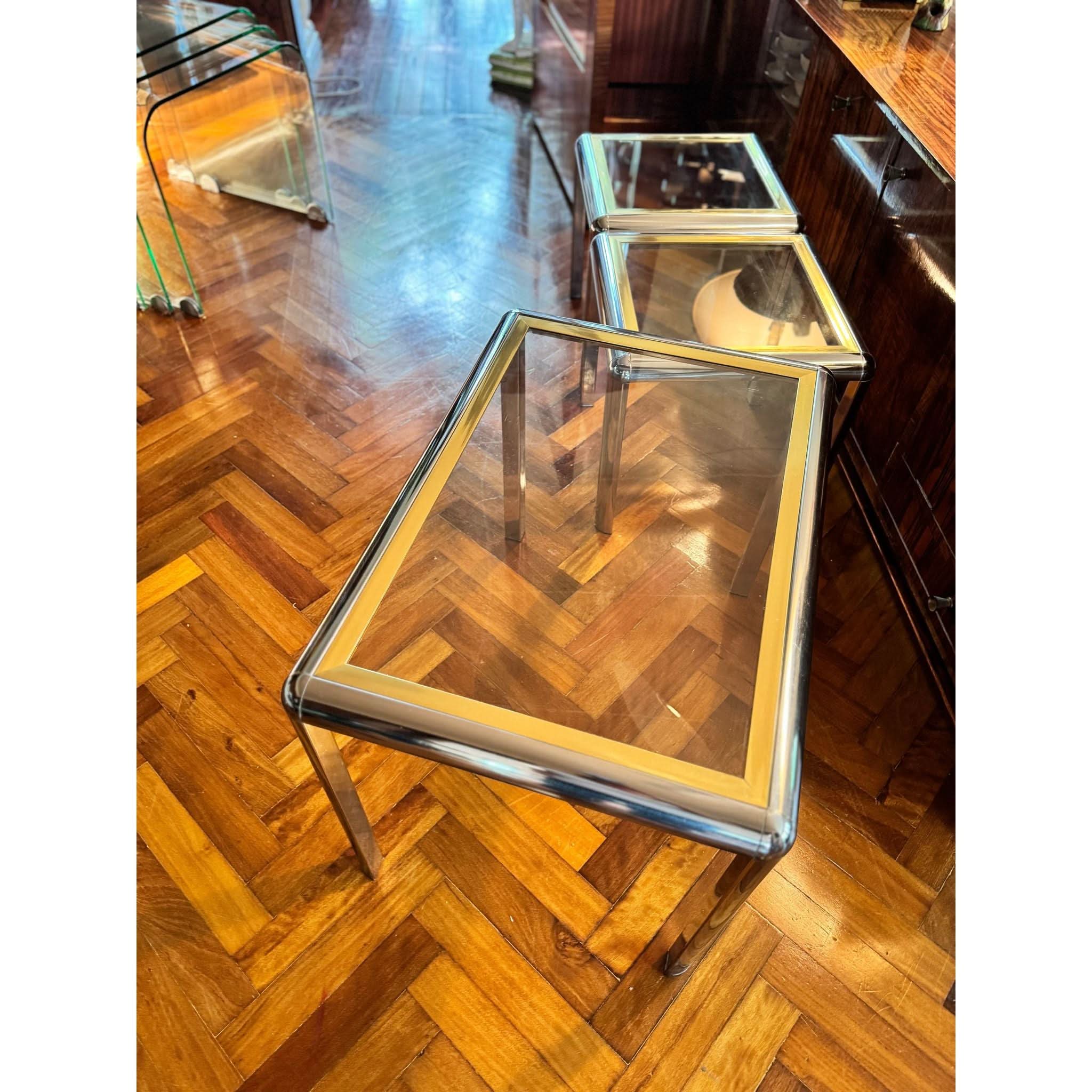 This fabulous set of 1970s tubular tables is made all the more punchy by the addition of a brass trim insert. Maker unknown but very much in the style of DIA (Design Institute of America). Comprising of a pair of side tables and a longer, higher coffee table. 2 x Side tables 42 x 42 x 40 high Coffee table 67.5 x 47 x 49 high