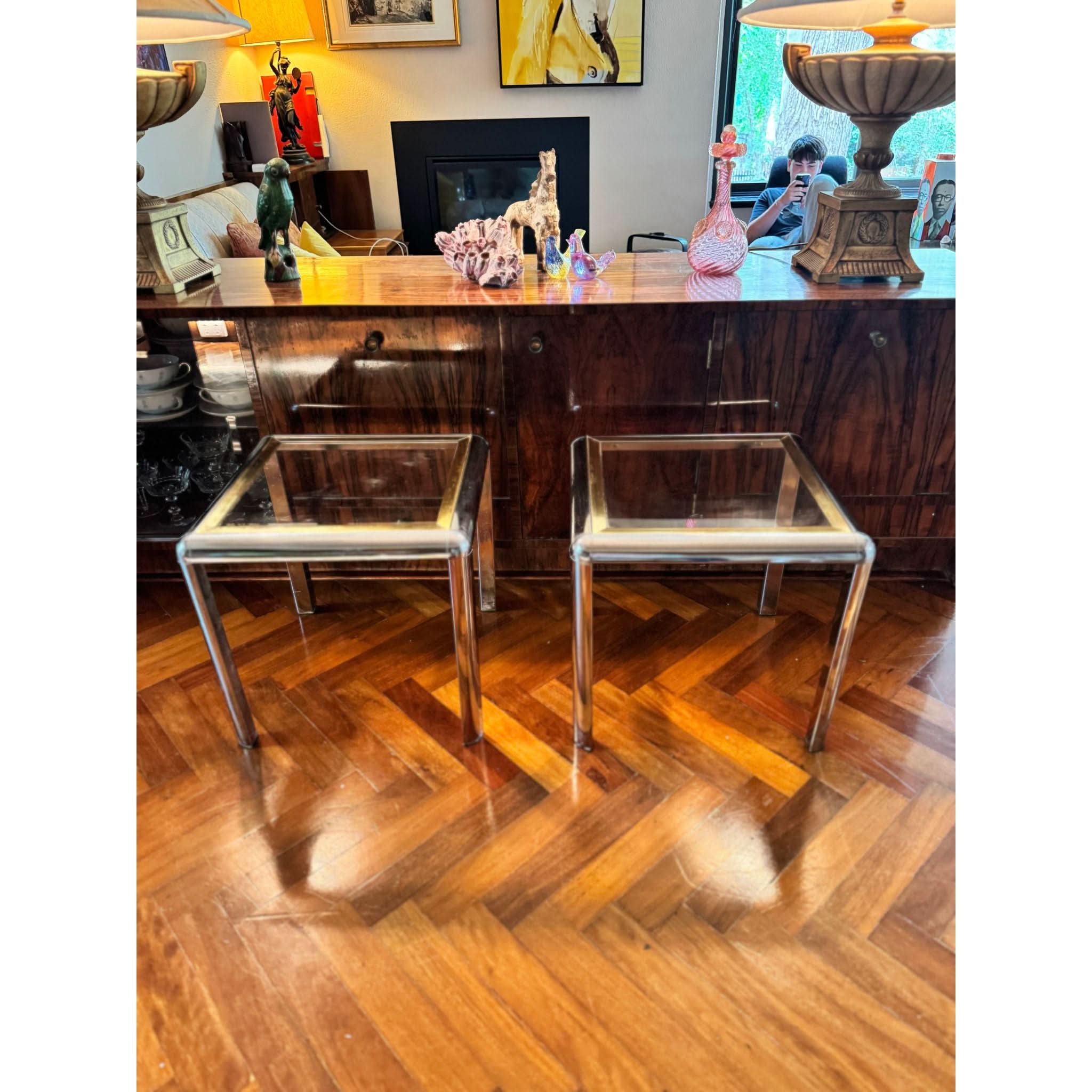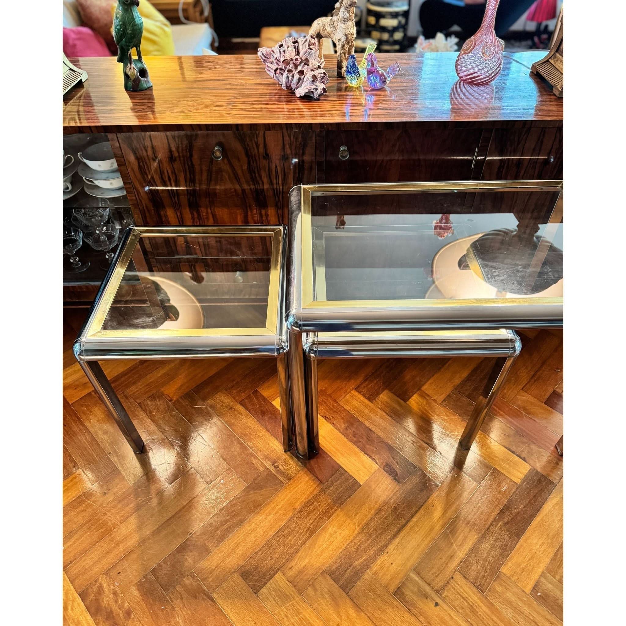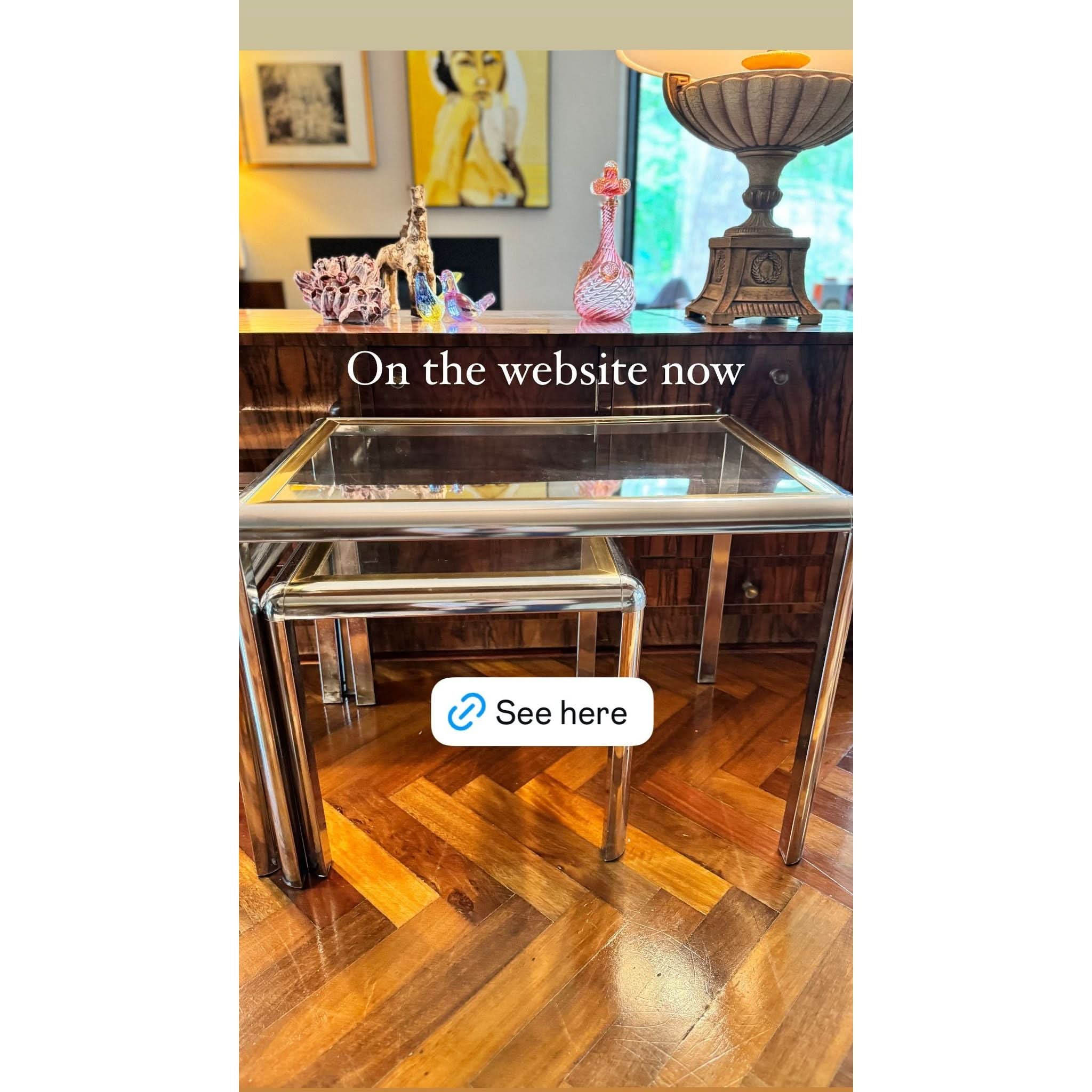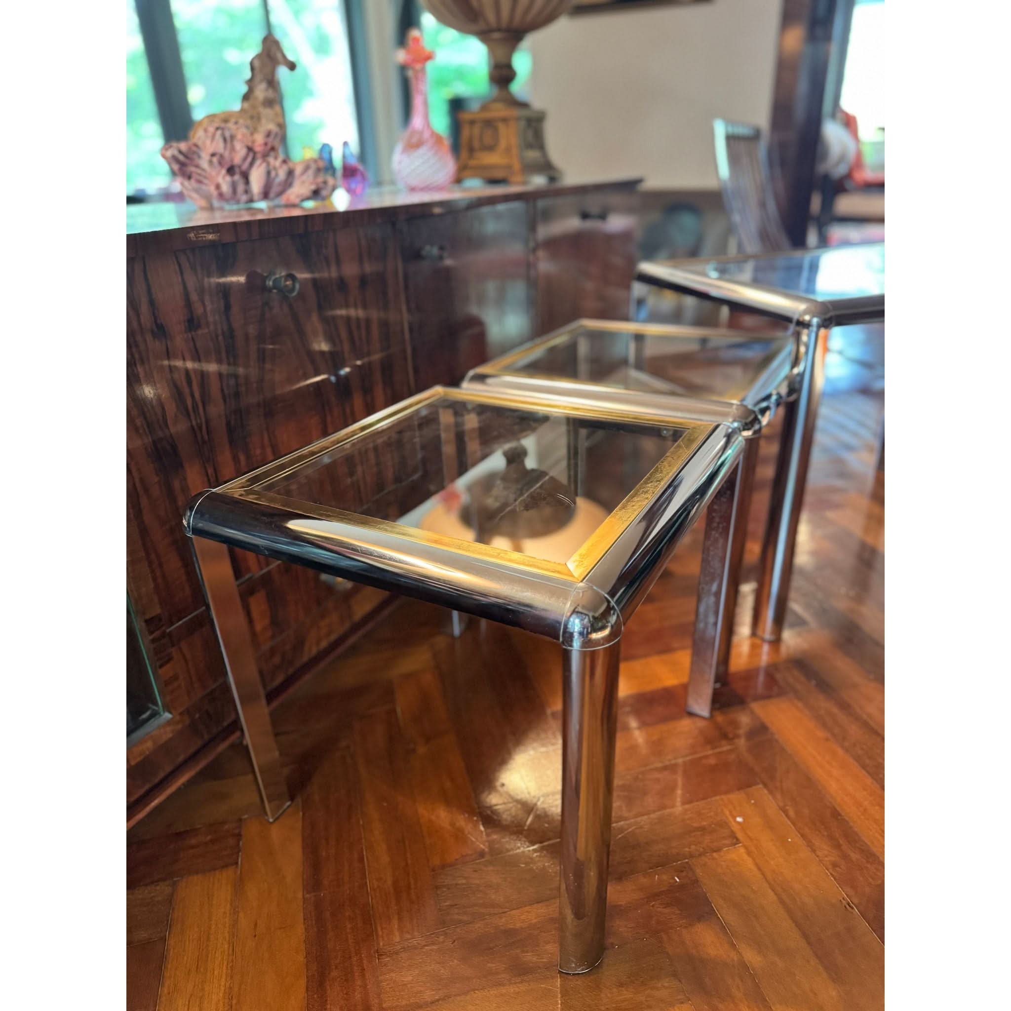 This fabulous set of 1970s tubular tables is made all the more punchy by the addition of a brass trim insert. Maker unknown but very much in the style of DIA (Design Institute of America). Comprising of a pair of side tables and a longer, higher coffee table. 2 x Side tables 42 x 42 x 40 high Coffee table 67.5 x 47 x 49 high