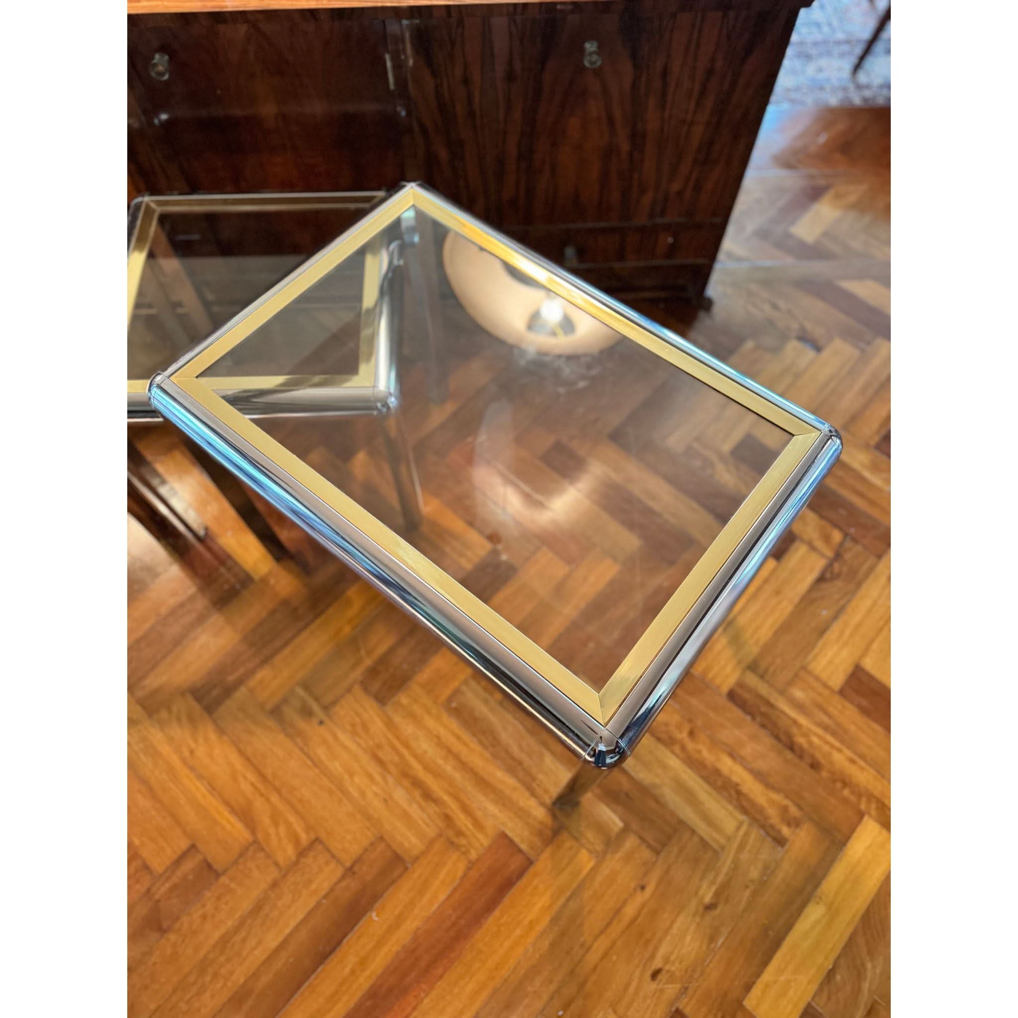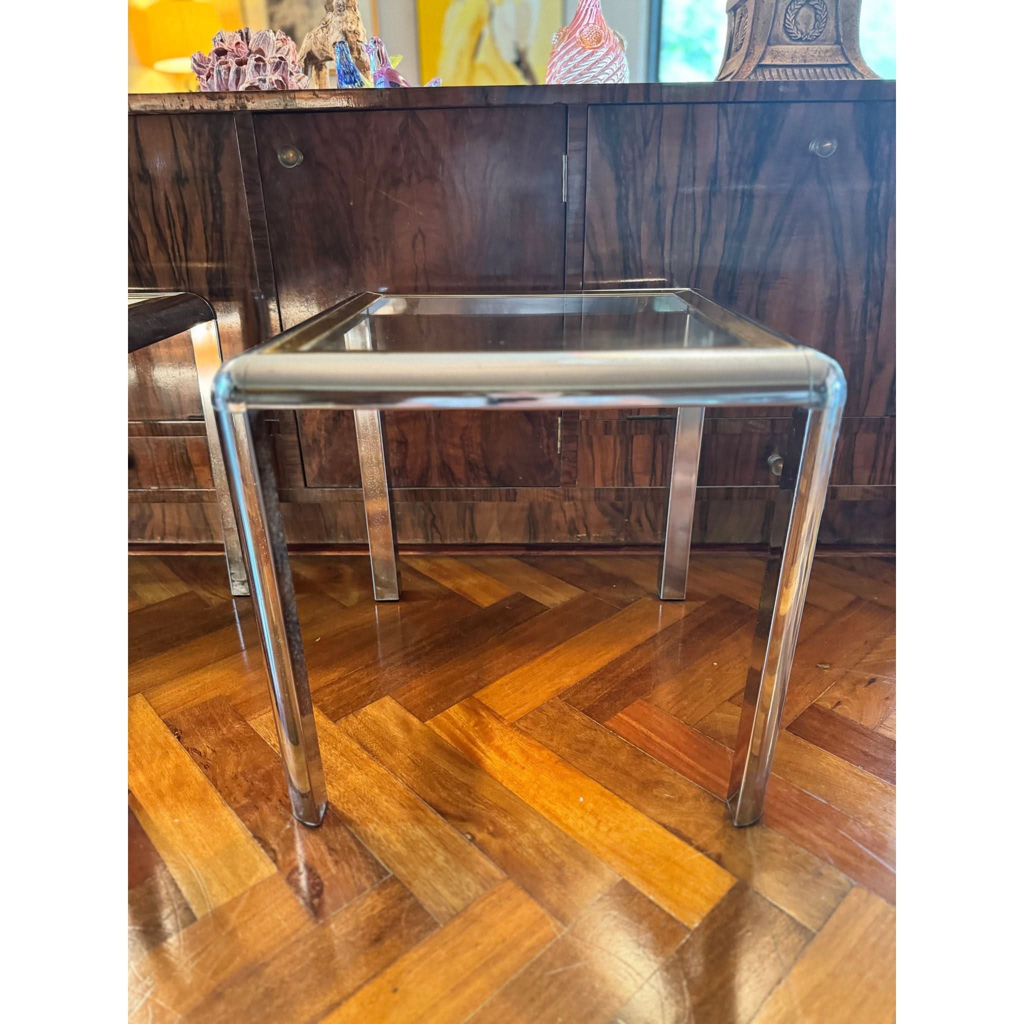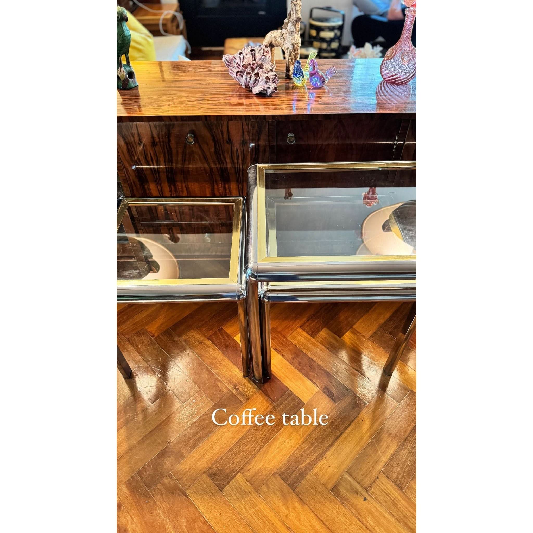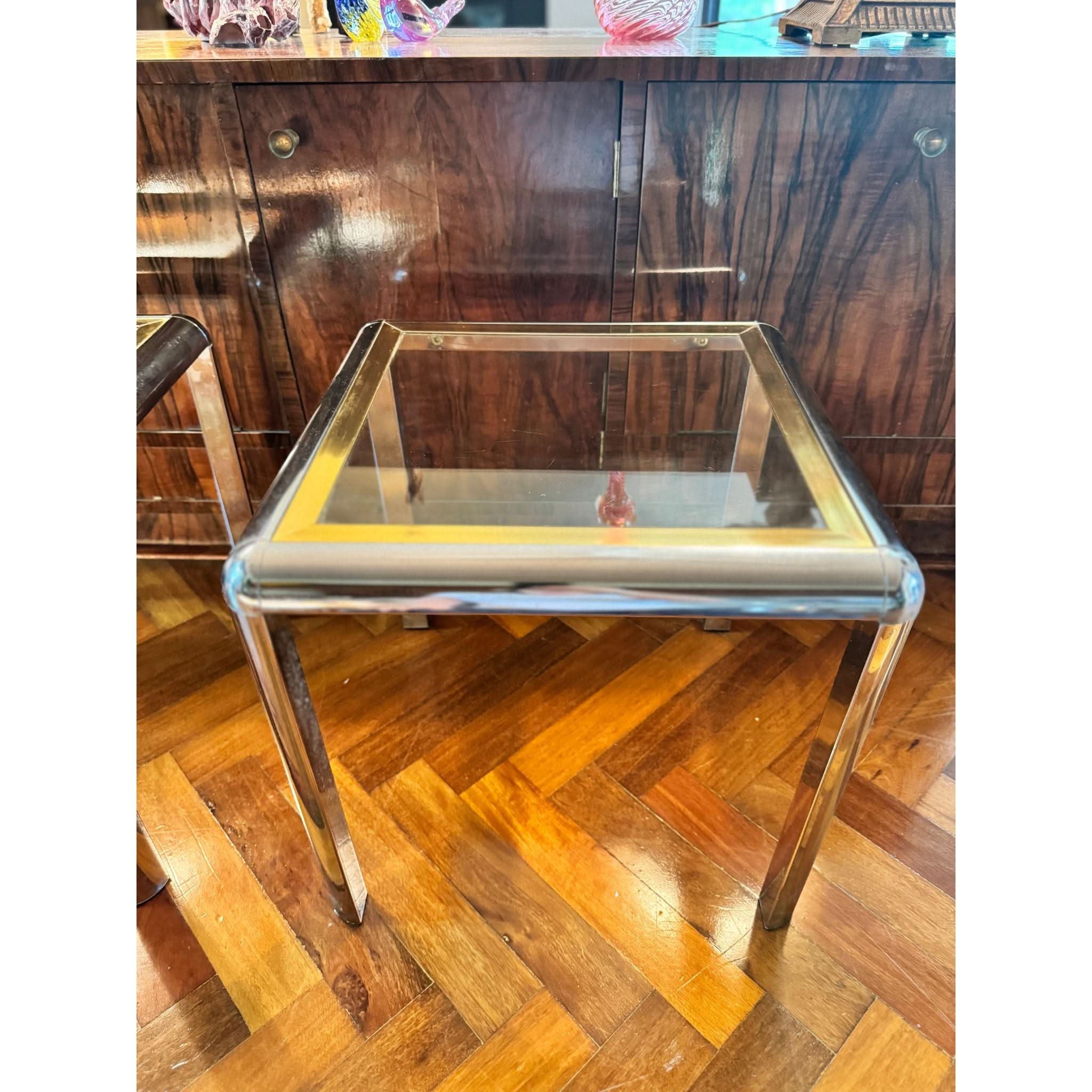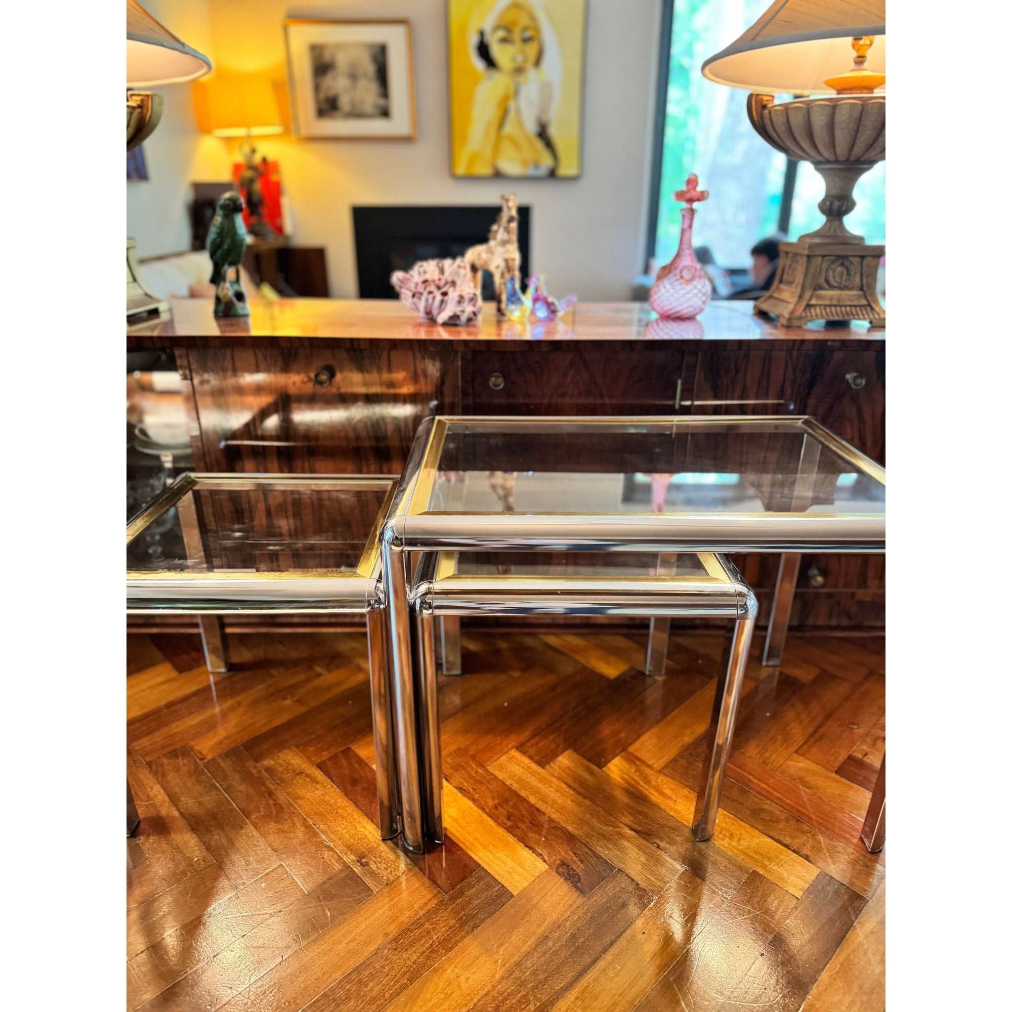 This fabulous set of 1970s tubular tables is made all the more punchy by the addition of a brass trim insert. Maker unknown but very much in the style of DIA (Design Institute of America). Comprising of a pair of side tables and a longer, higher coffee table. 2 x Side tables 42 x 42 x 40 high Coffee table 67.5 x 47 x 49 high
