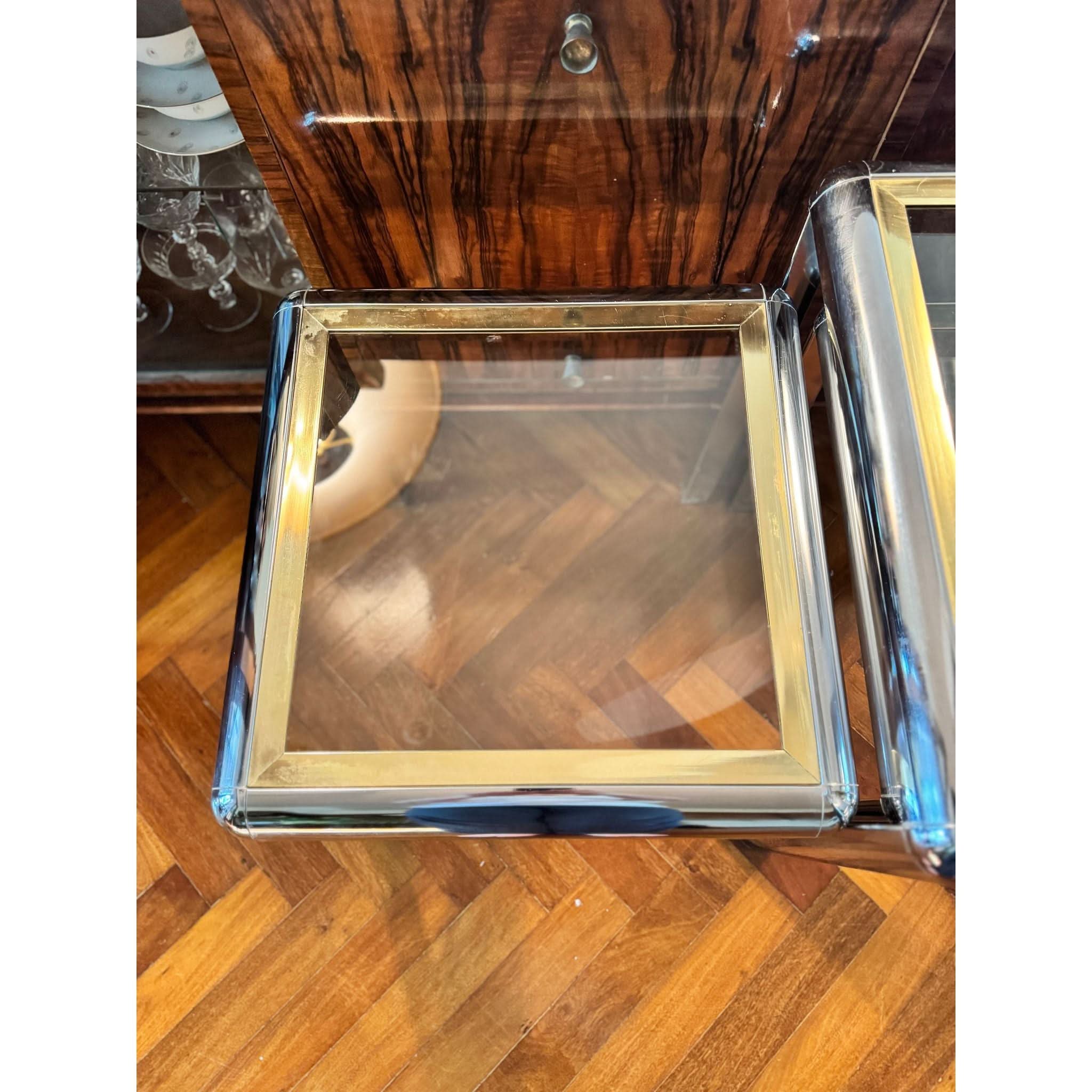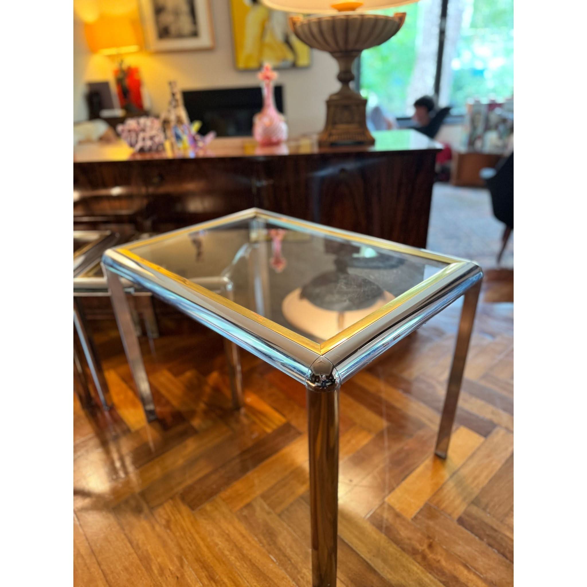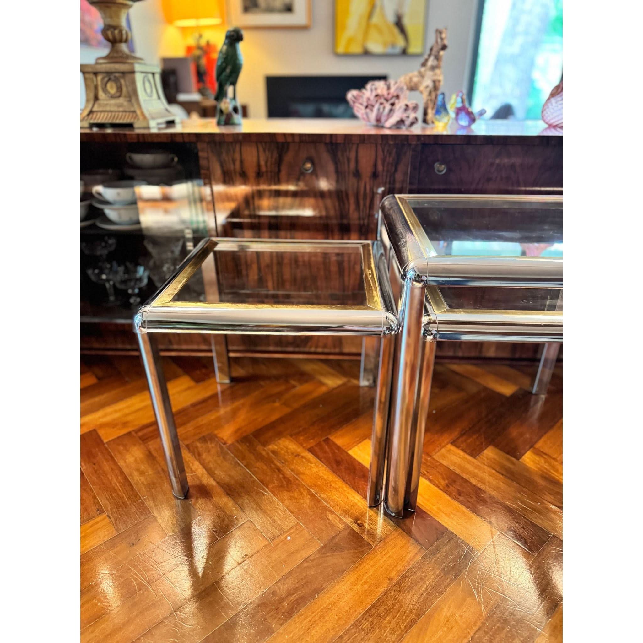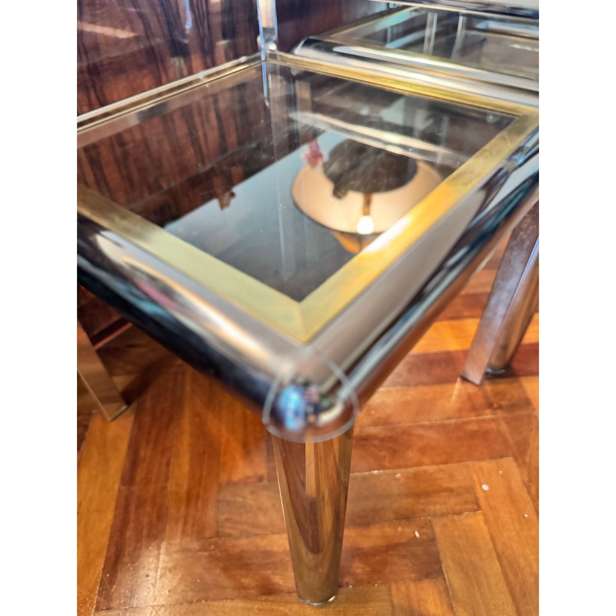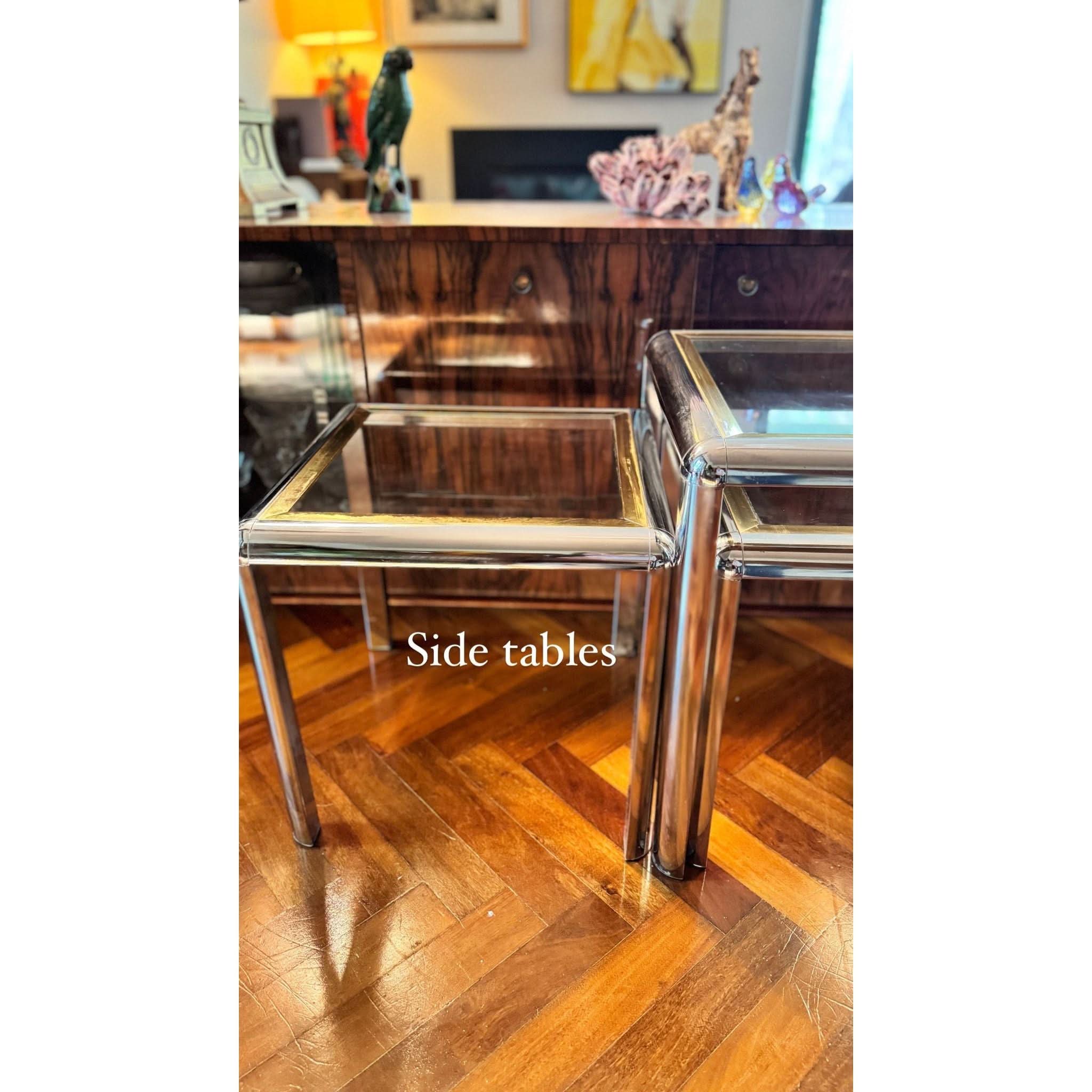 This fabulous set of 1970s tubular tables is made all the more punchy by the addition of a brass trim insert. Maker unknown but very much in the style of DIA (Design Institute of America). Comprising of a pair of side tables and a longer, higher coffee table. 2 x Side tables 42 x 42 x 40 high Coffee table 67.5 x 47 x 49 high