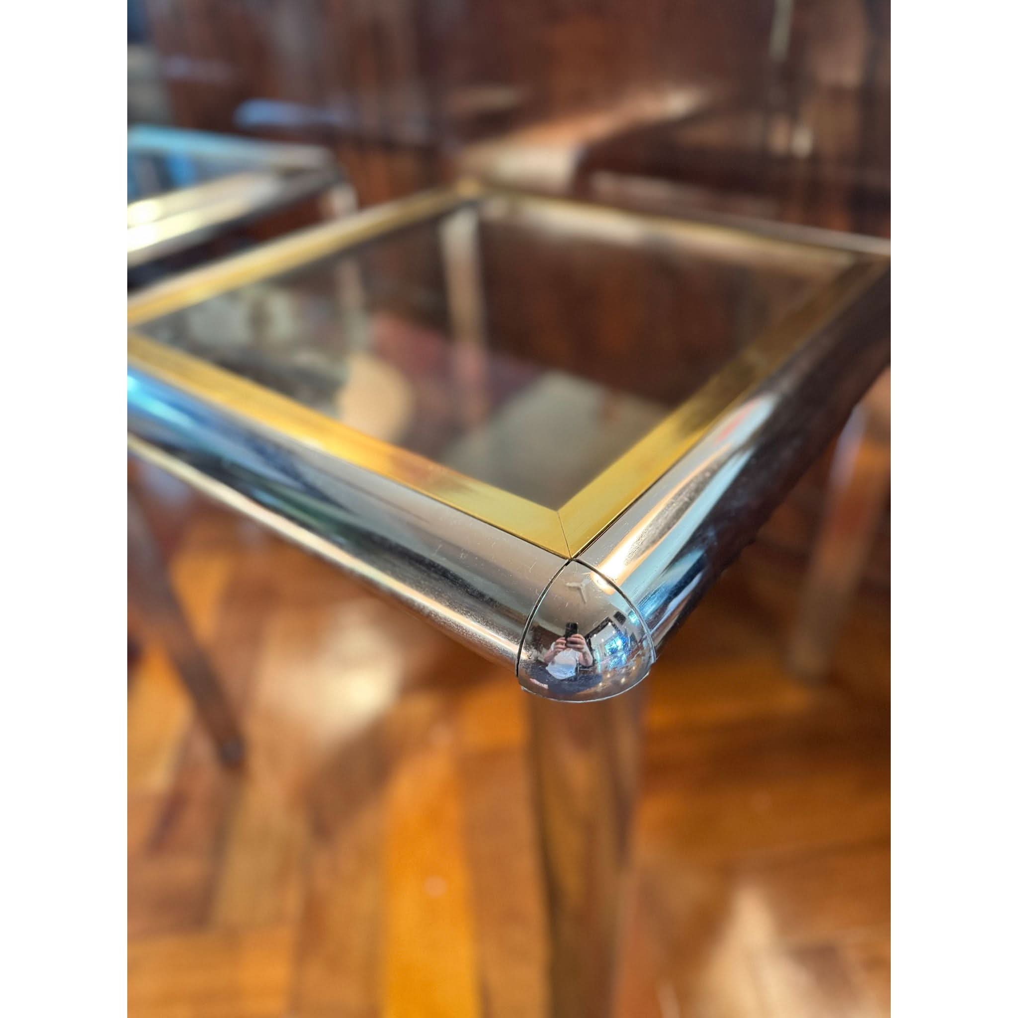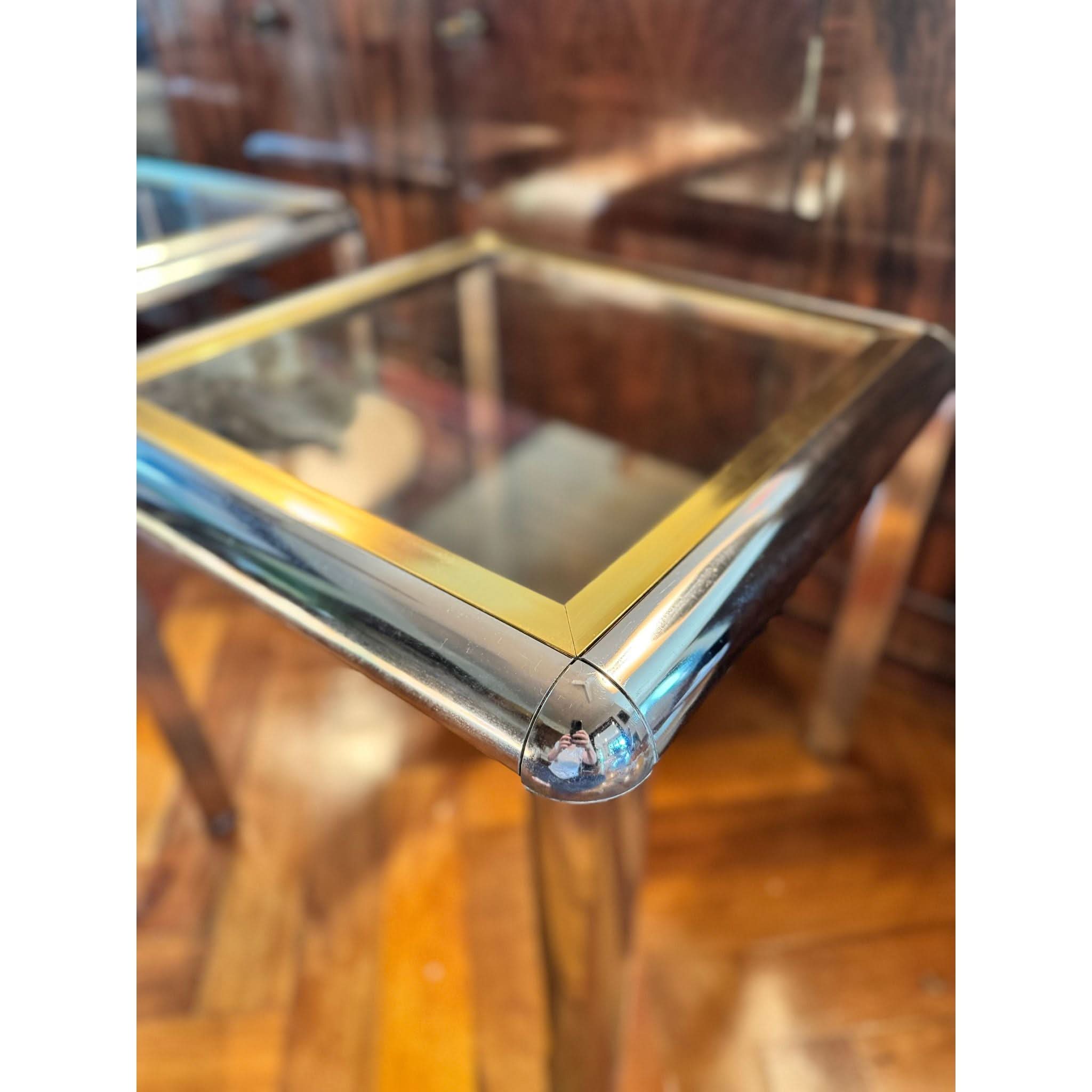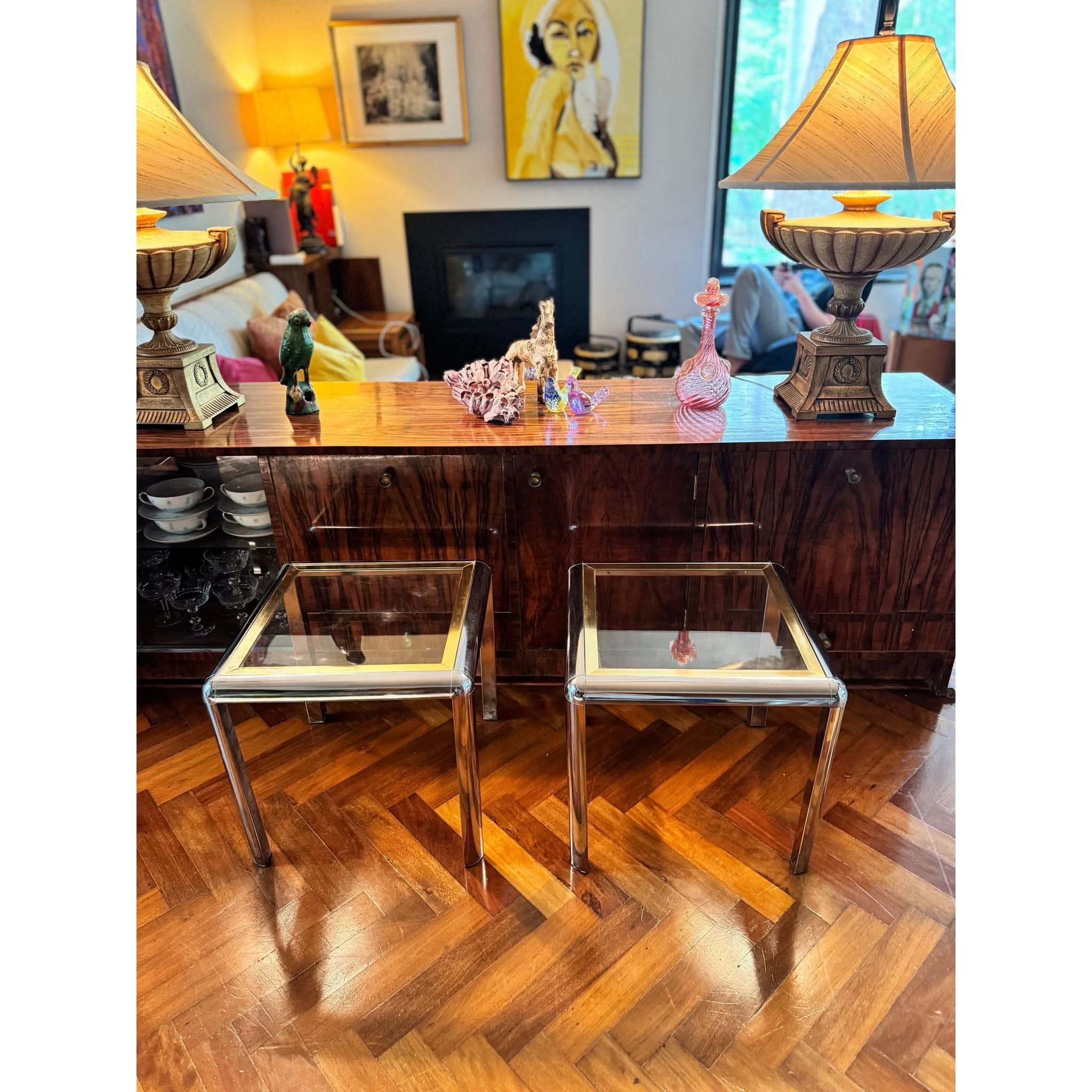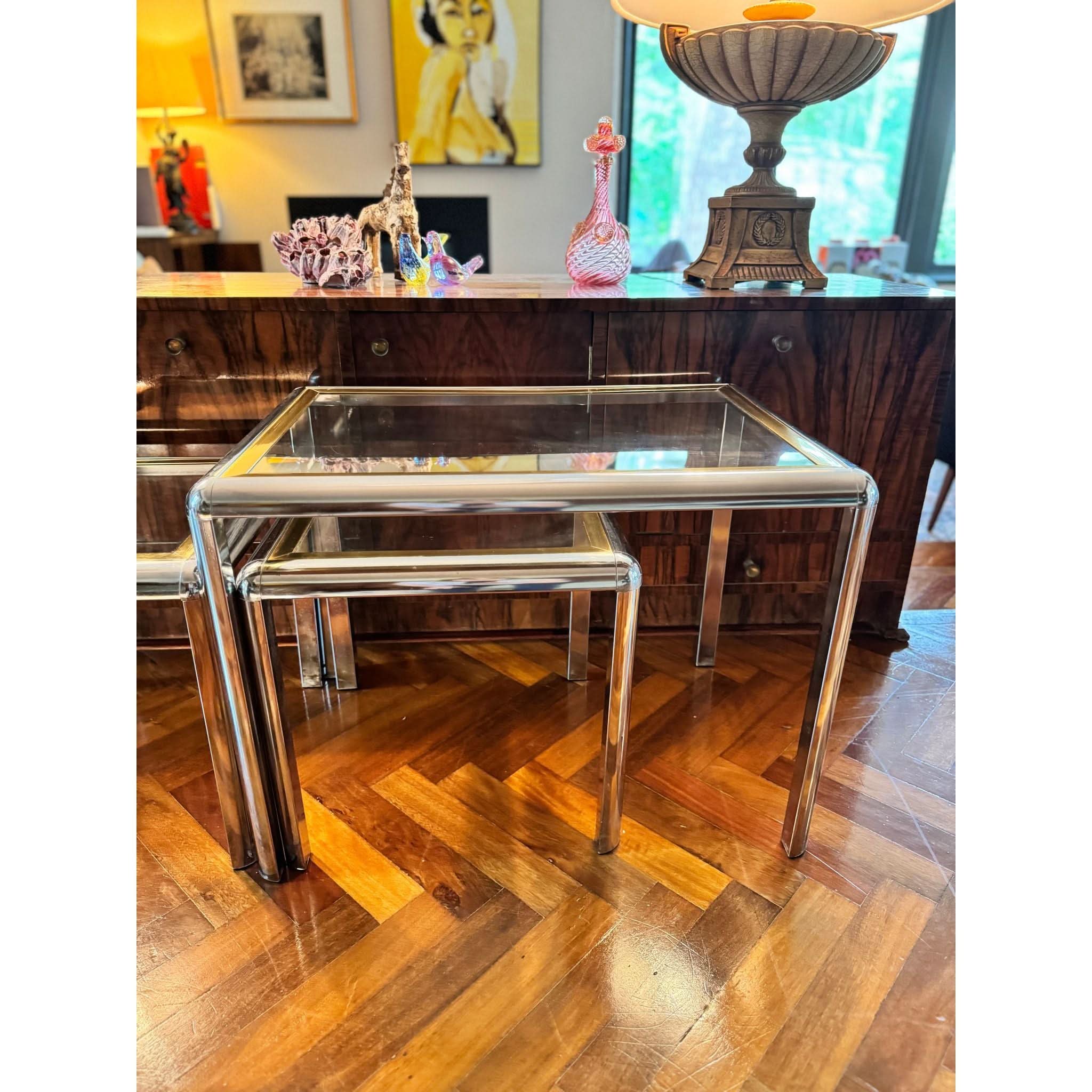 This fabulous set of 1970s tubular tables is made all the more punchy by the addition of a brass trim insert. Maker unknown but very much in the style of DIA (Design Institute of America). Comprising of a pair of side tables and a longer, higher coffee table. 2 x Side tables 42 x 42 x 40 high Coffee table 67.5 x 47 x 49 high